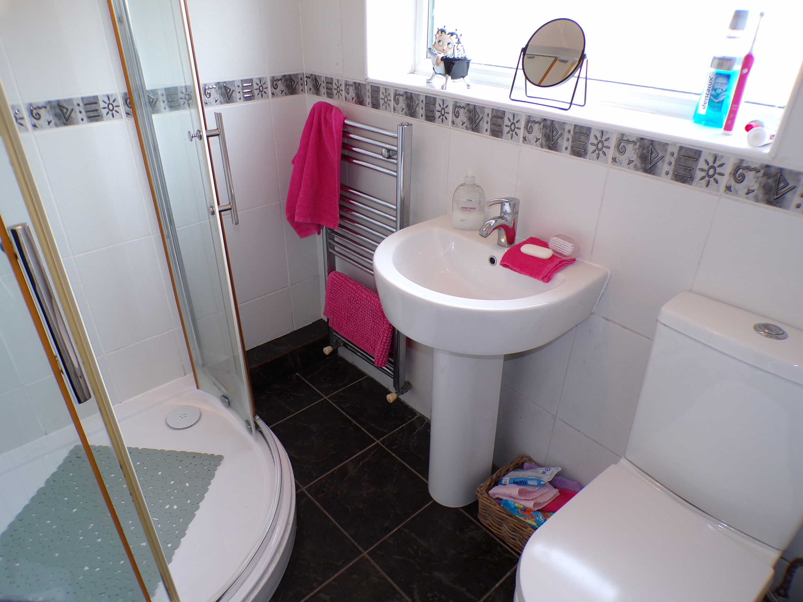 Shower Room – 3 piece white shower suite. Ceramic wall & floor tiled. Heated towel rail.