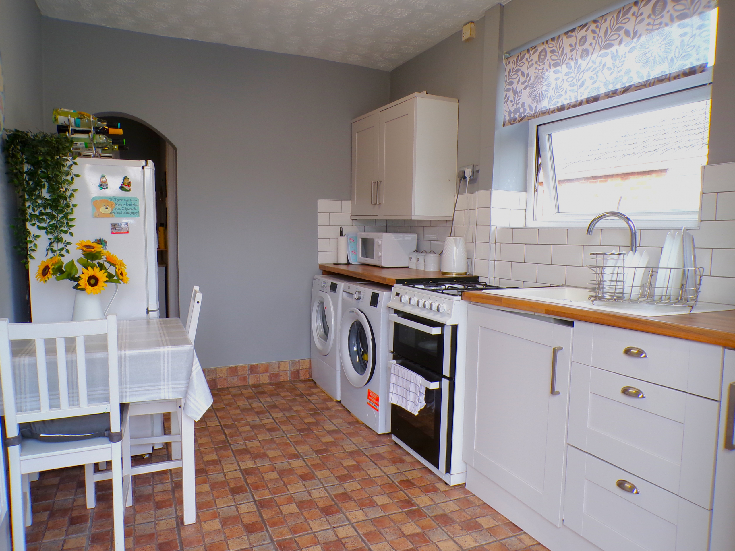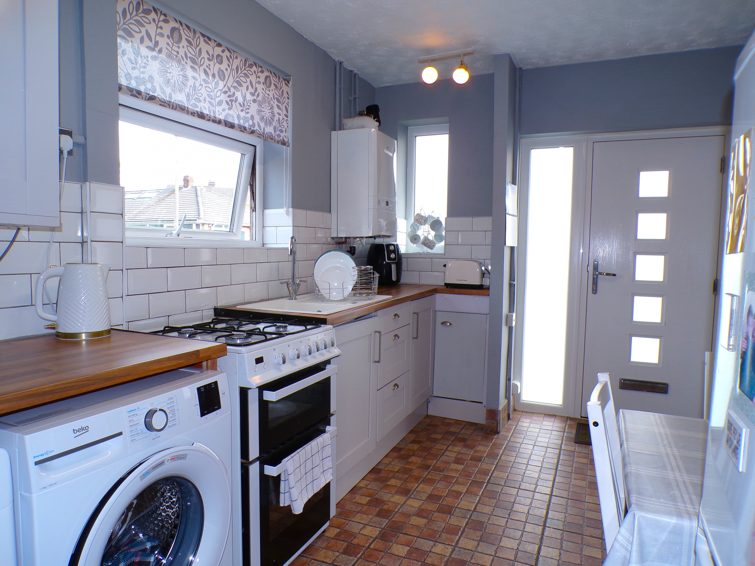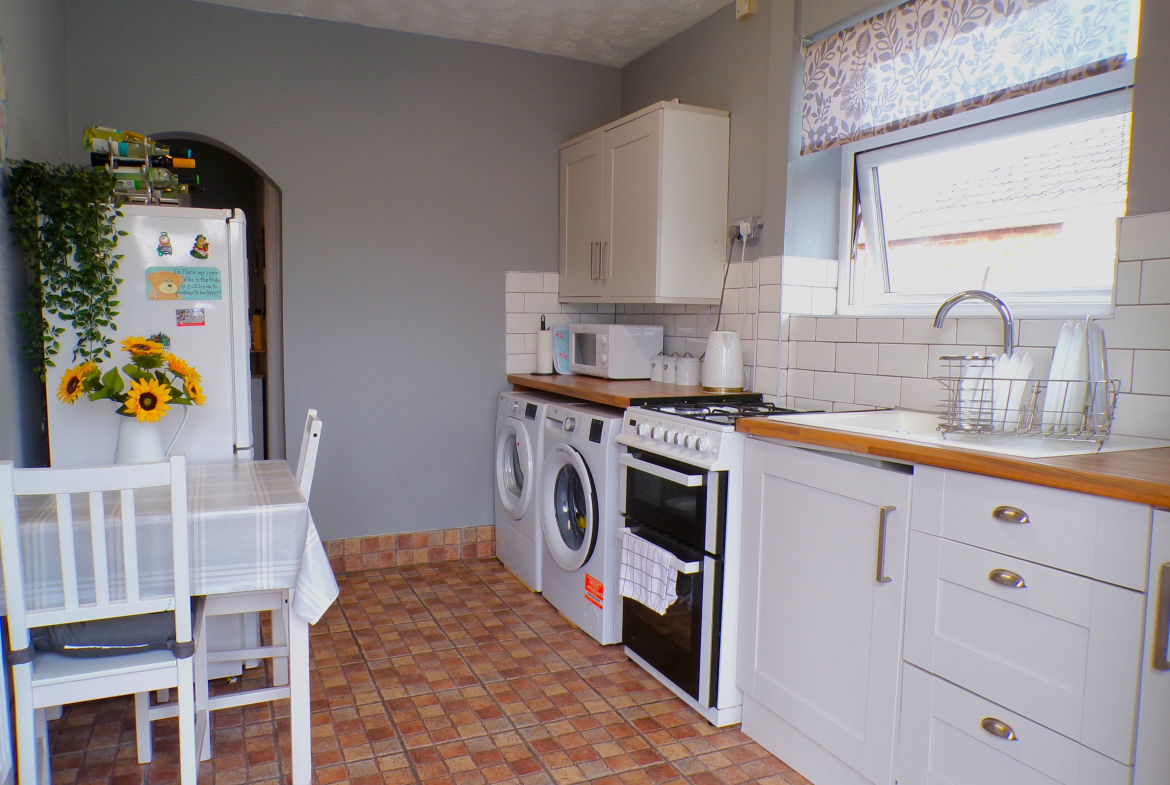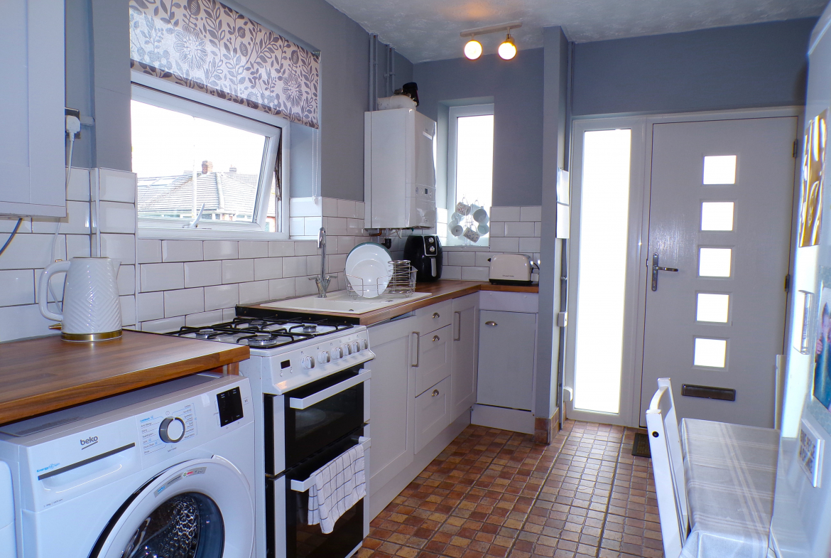 Kitchen – 3.81m x 2.46m (12’6 x 8’1) – Fitted wall & base units. Single sink & drainer. Part ceramic wall tiled. Plumbed for washer. Combi gas central heating boiler. Radiator.