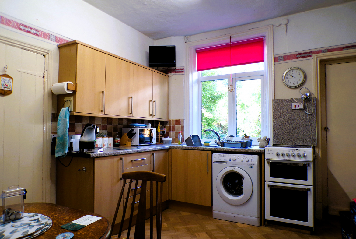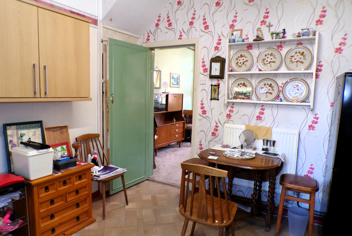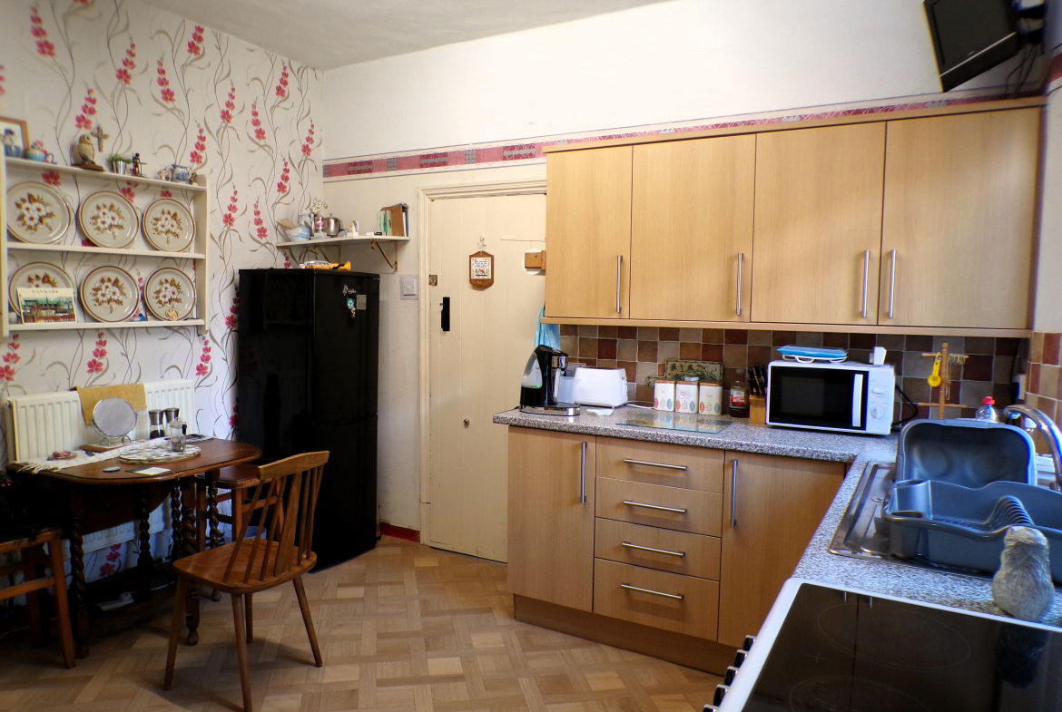 Kitchen – 13’0x11’11 – Fitted wall and base units. Stainless steel sink and drainer. Plumbed for washer. Freestanding oven. Understairs storage. Radiator. Stairs off.