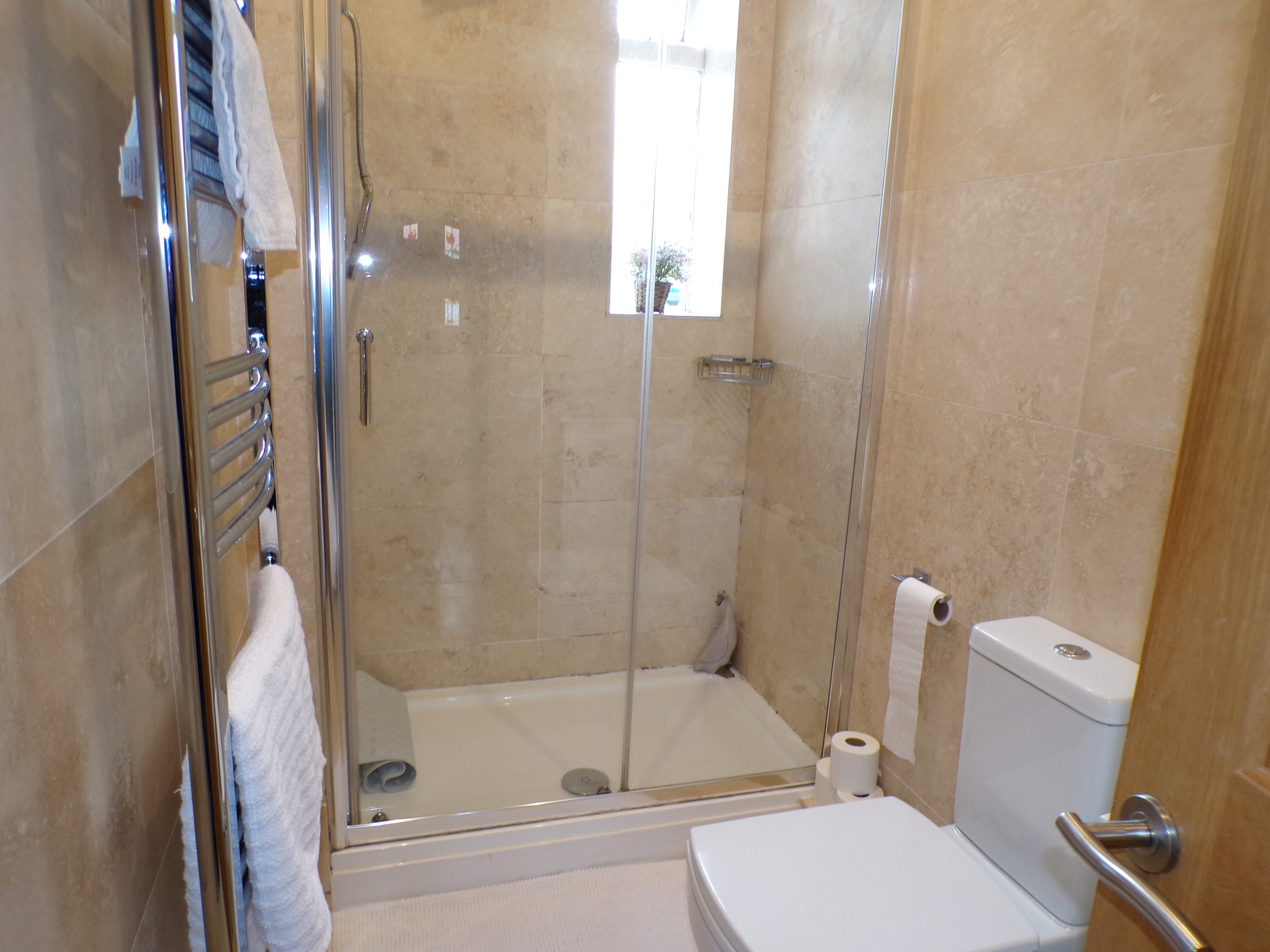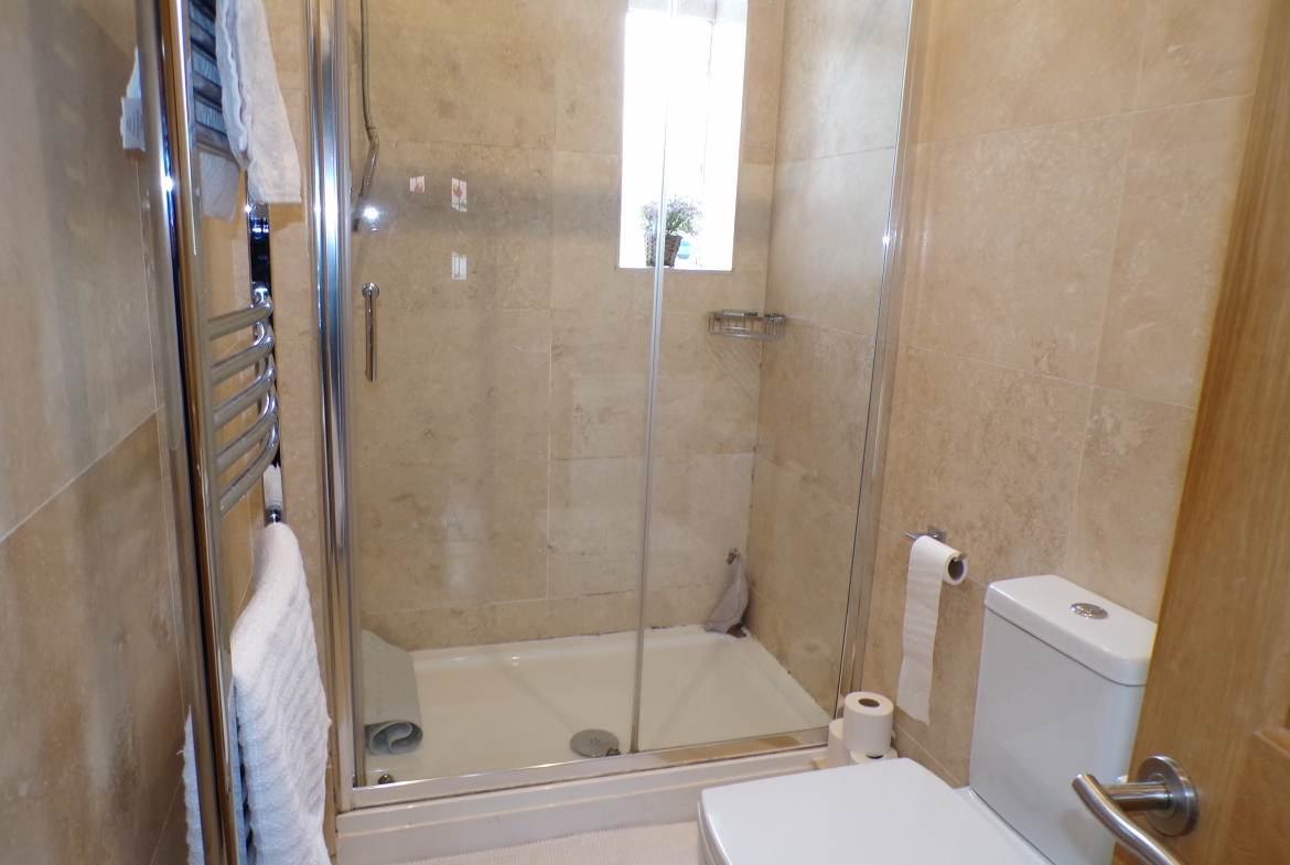 Shower Room – Modern 3 piece white shower suite. Ceramic wall & floor tiled. Heated towel rail. Inset spotlights. Loft access.