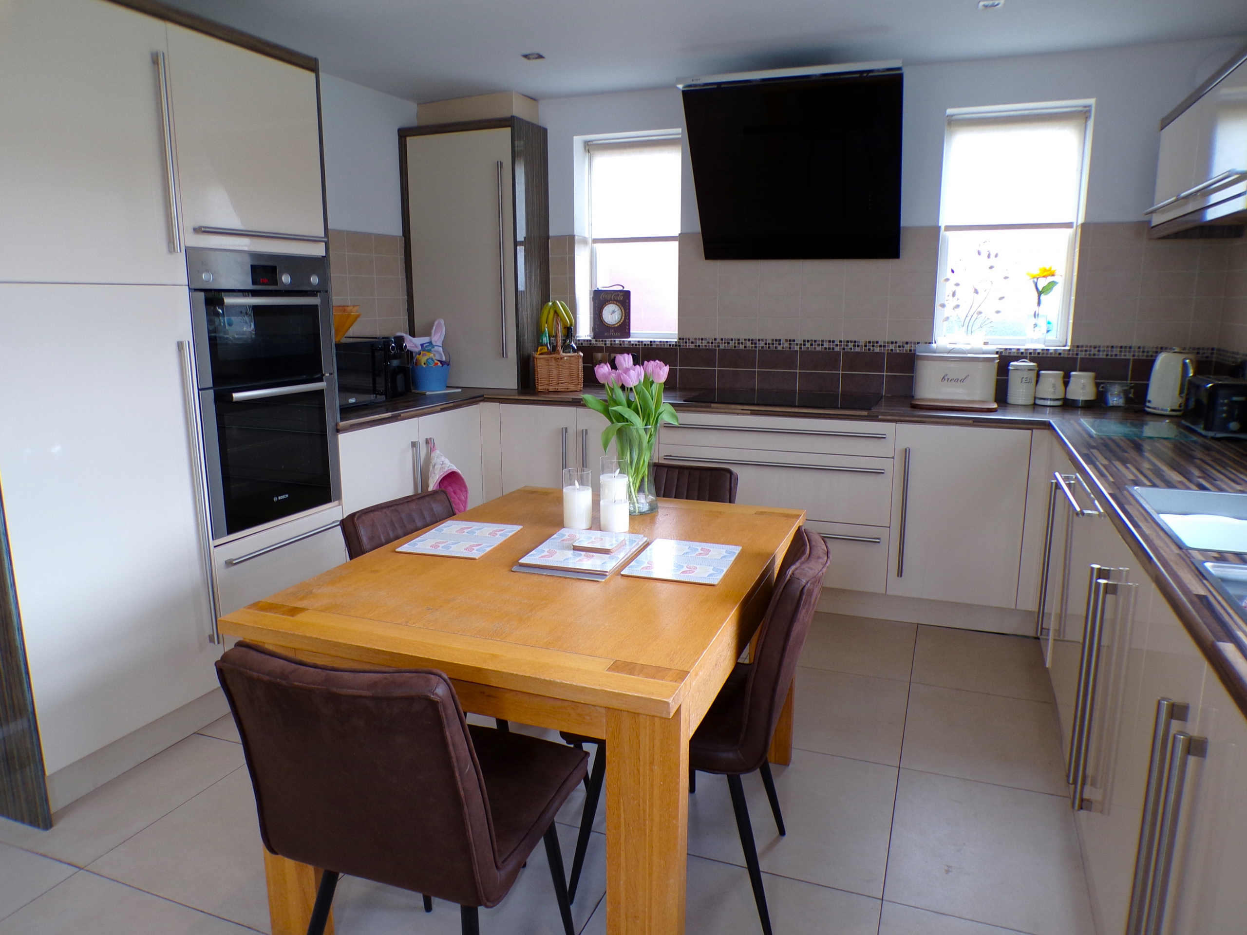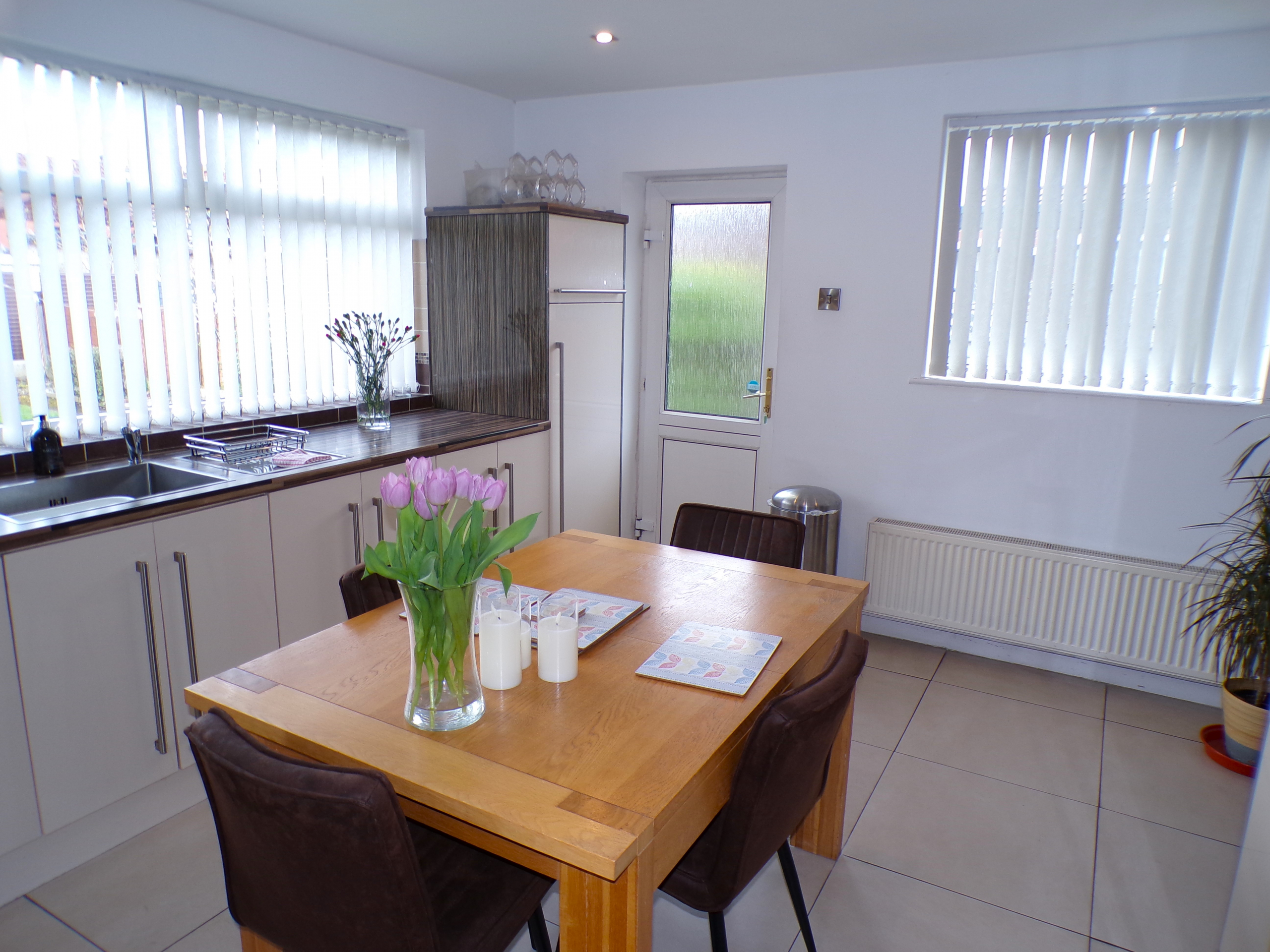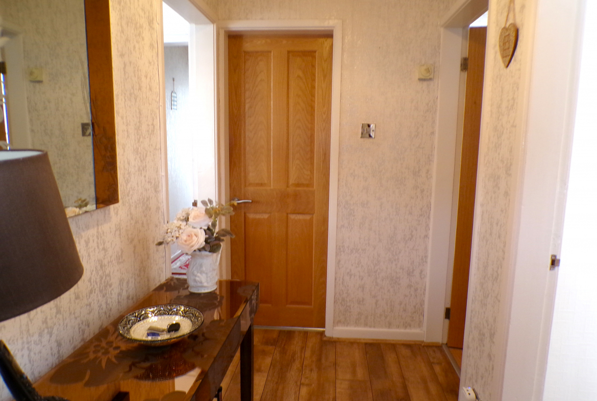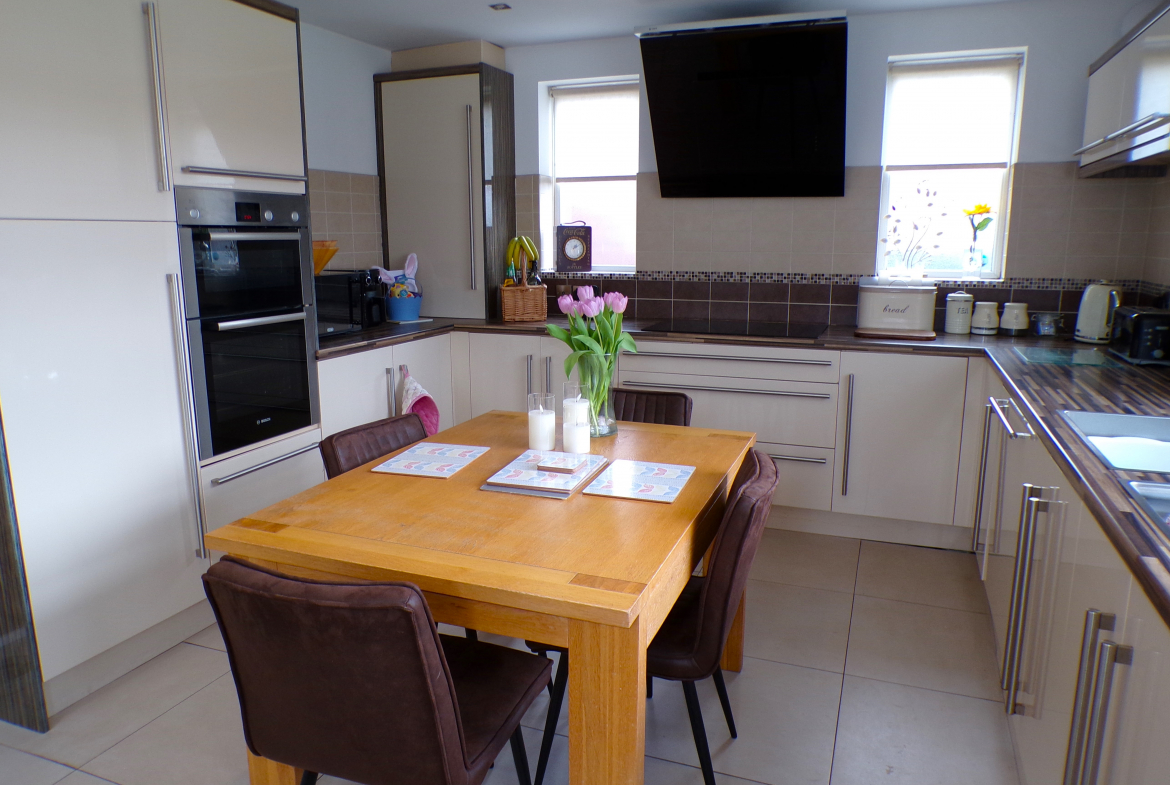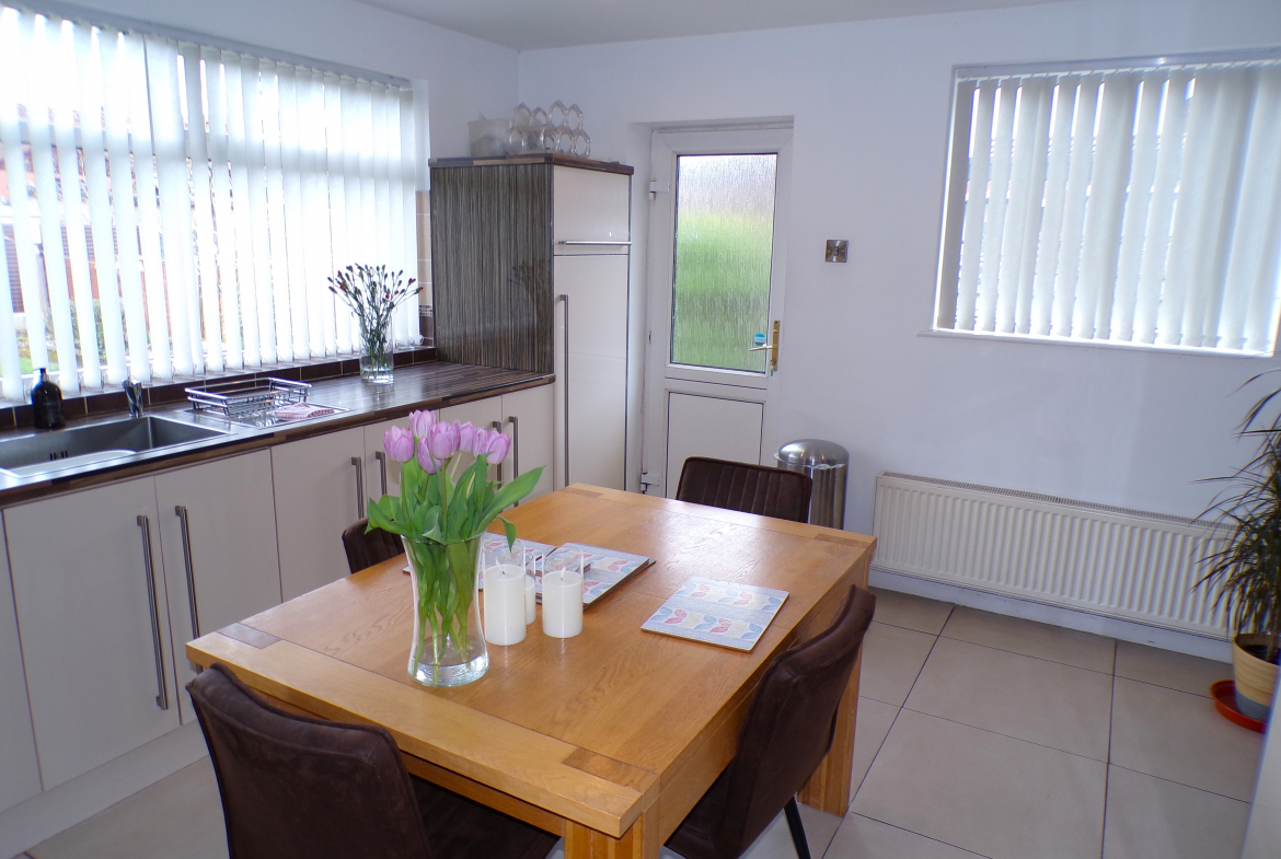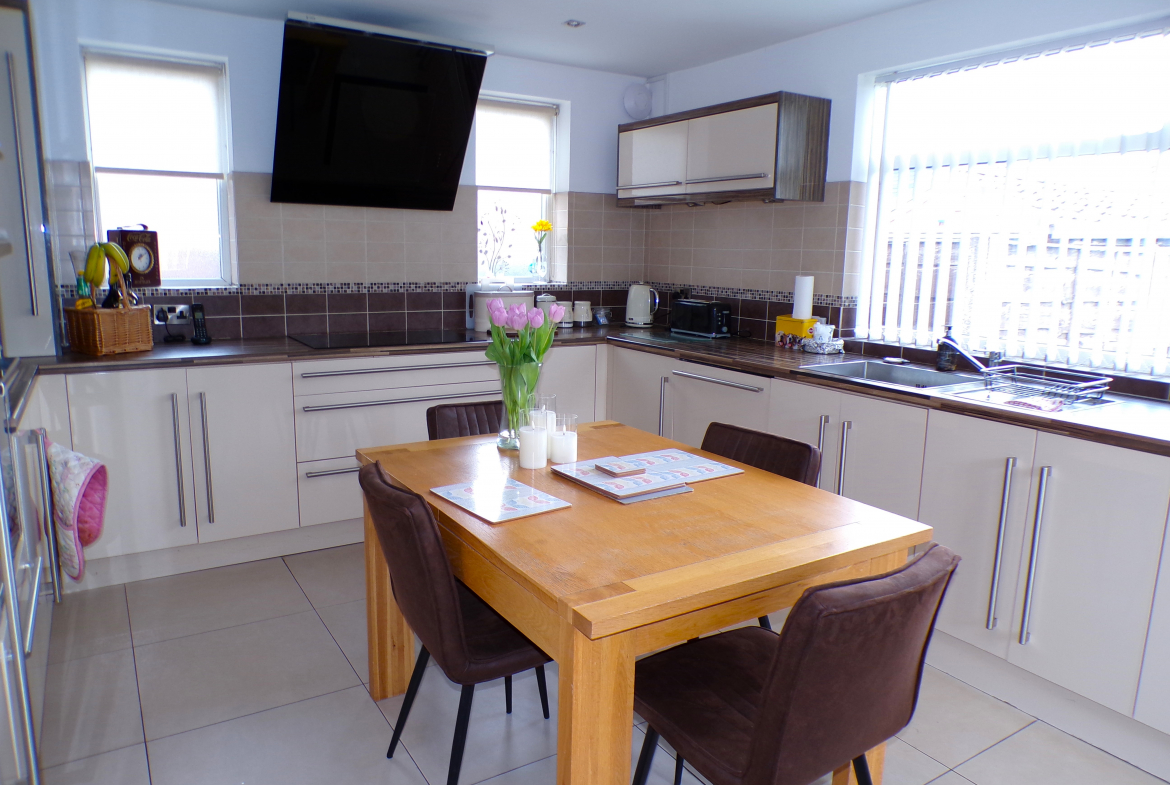 Dining Kitchen – 3.71m x 4.47m (12’2 x 14’8) – Good range of modern fitted wall & base units incorporating oven, hob & extractor. Stainless steel sink & drainer. Integrated dishwasher. Plumbed for washer. Part ceramic wall tiled. Ceramic floor tiled. Combi gas central heating boiler. Radiator.