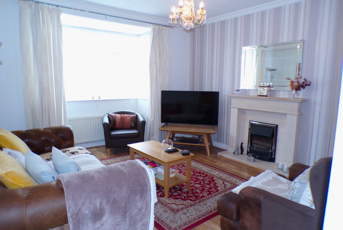 Lounge – 4.45m x 3.91m (14’7 x 12’10) – Fitted electric fire. Feature fireplace. Bay window. Radiator.