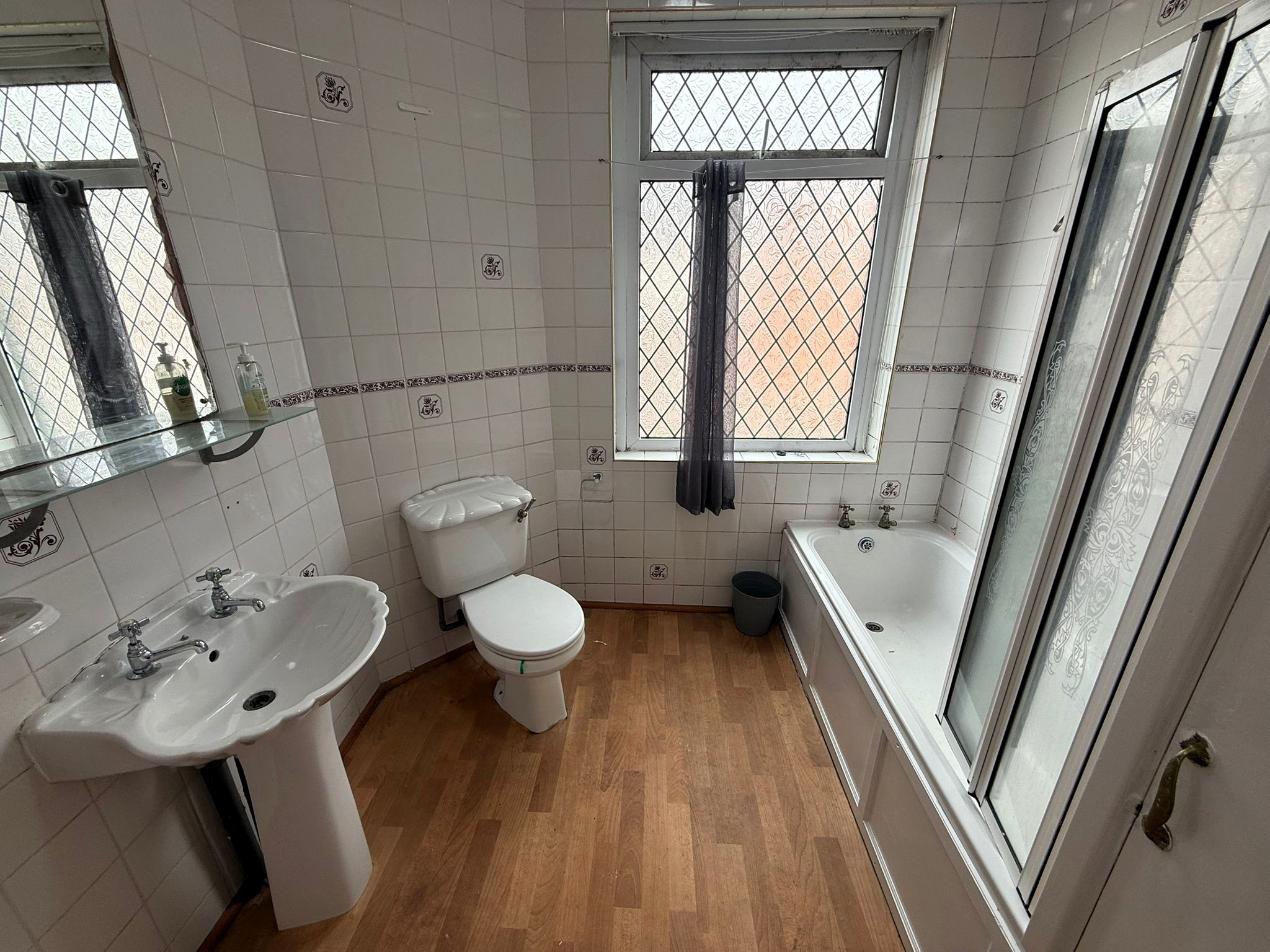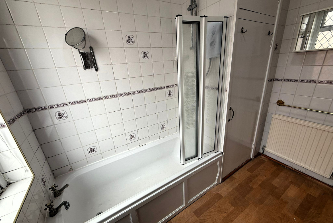Bathroom – 3 piece white suite with electric shower to bath. Ceramic wall tiled. Laminate flooring. Radiator.
