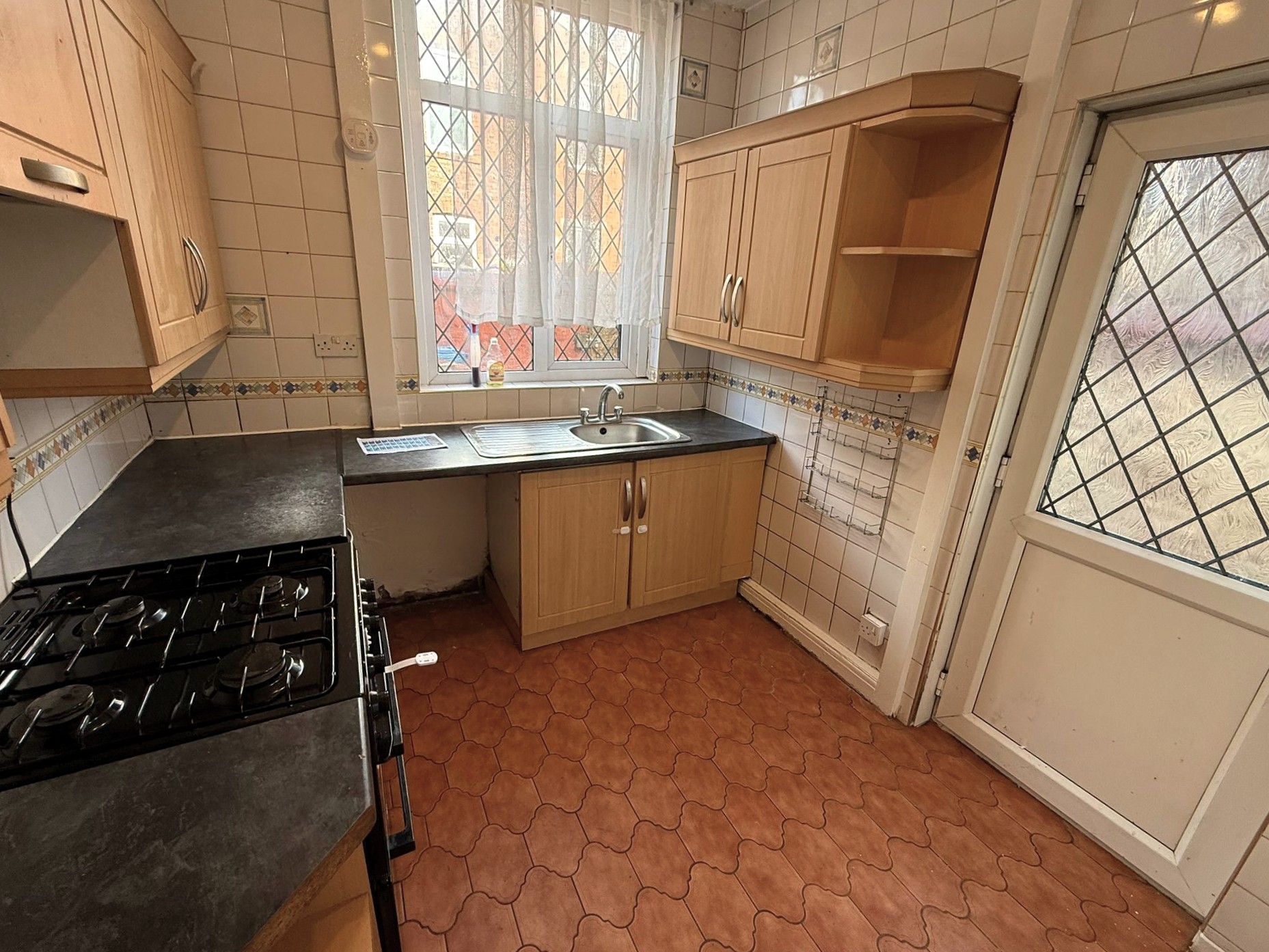 Kitchen – 8’7″ x 7’8″ (2.62m x 2.34m) – Under stairs storage. Fitted wall and base units incorporating oven, hob, extractor, stainless steel sink and drainer. Ceramic wall and floor tiled. Radiator.
