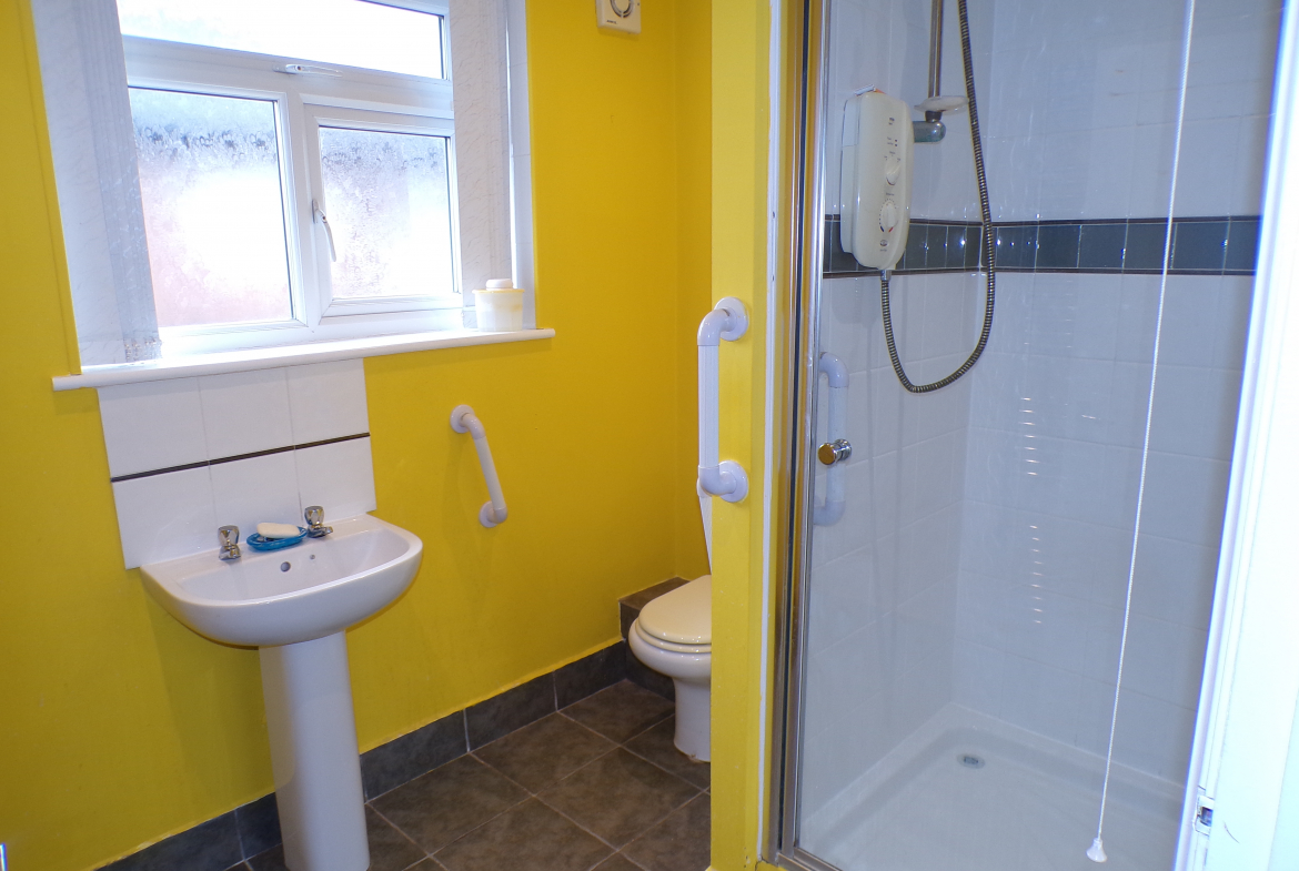 Shower Room – 3 piece shower suite. Part ceramic wall tiled. Ceramic floor tiled. Heated towel rail.