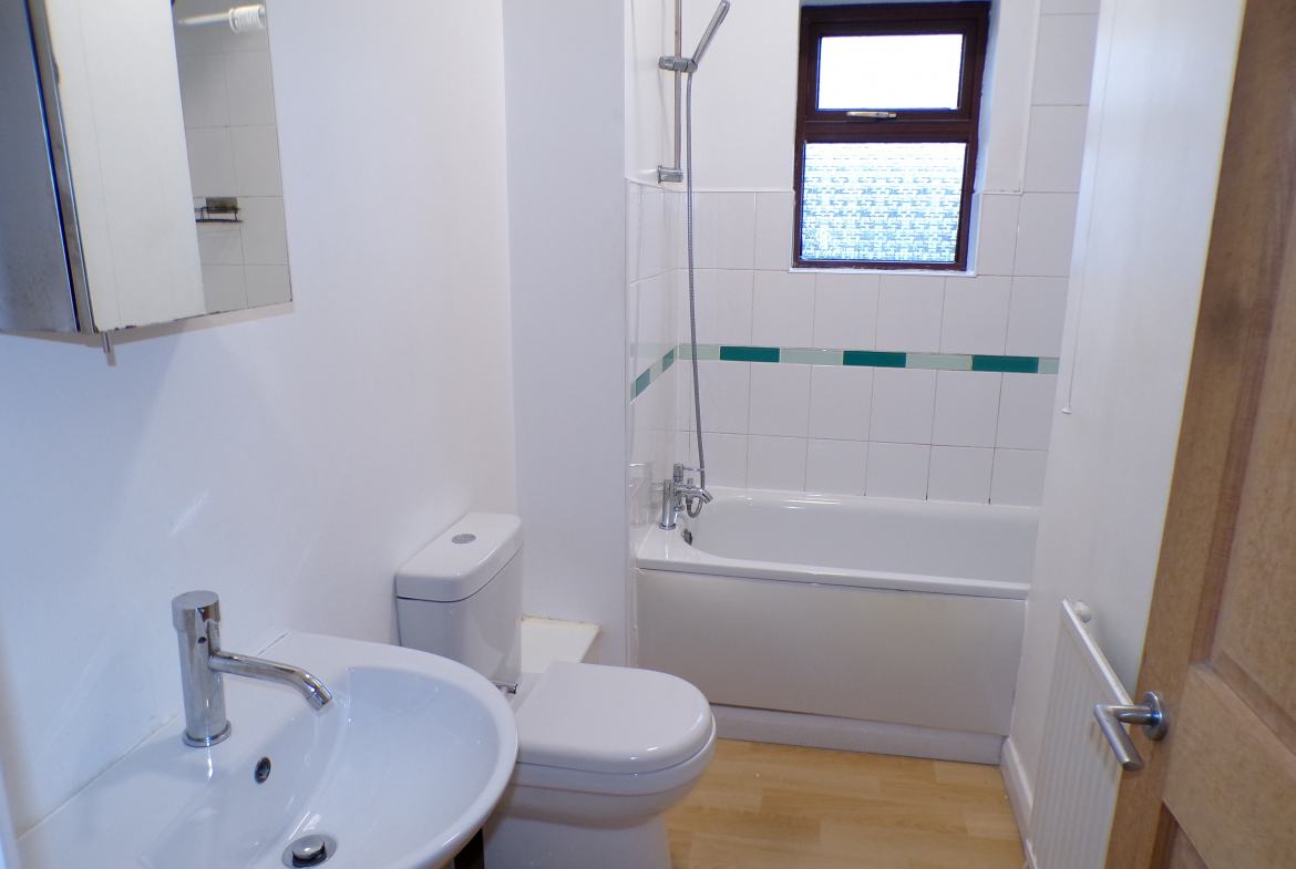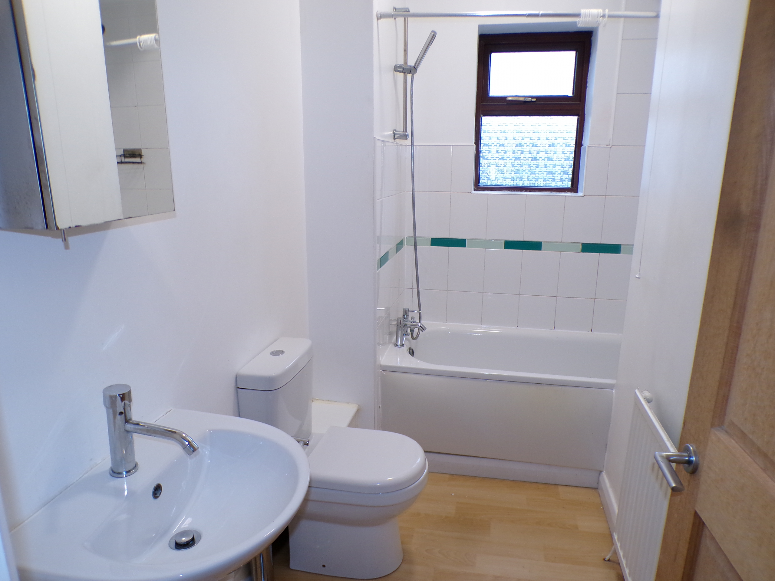 Bathroom – 3 piece white suite with shower to bath. Part ceramic wall tiled. Radiator.
