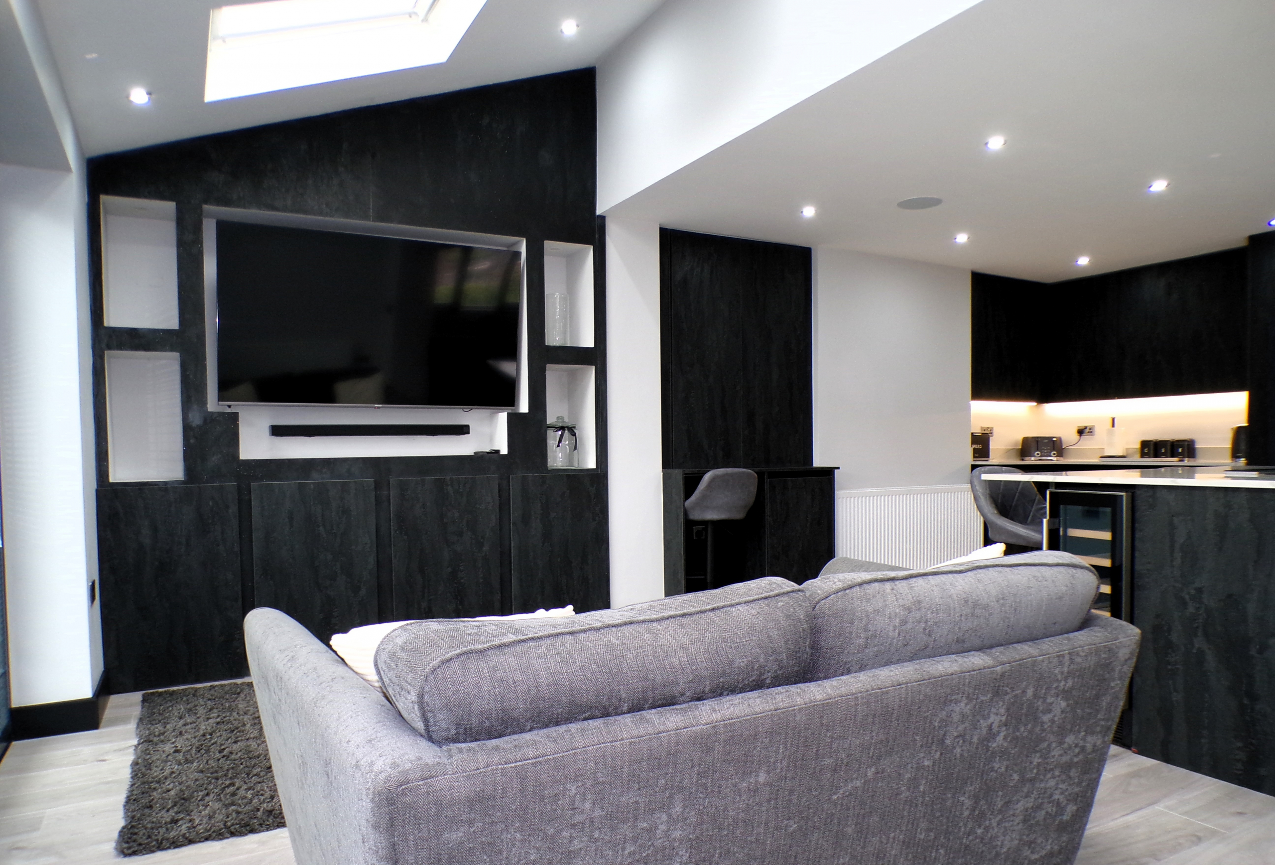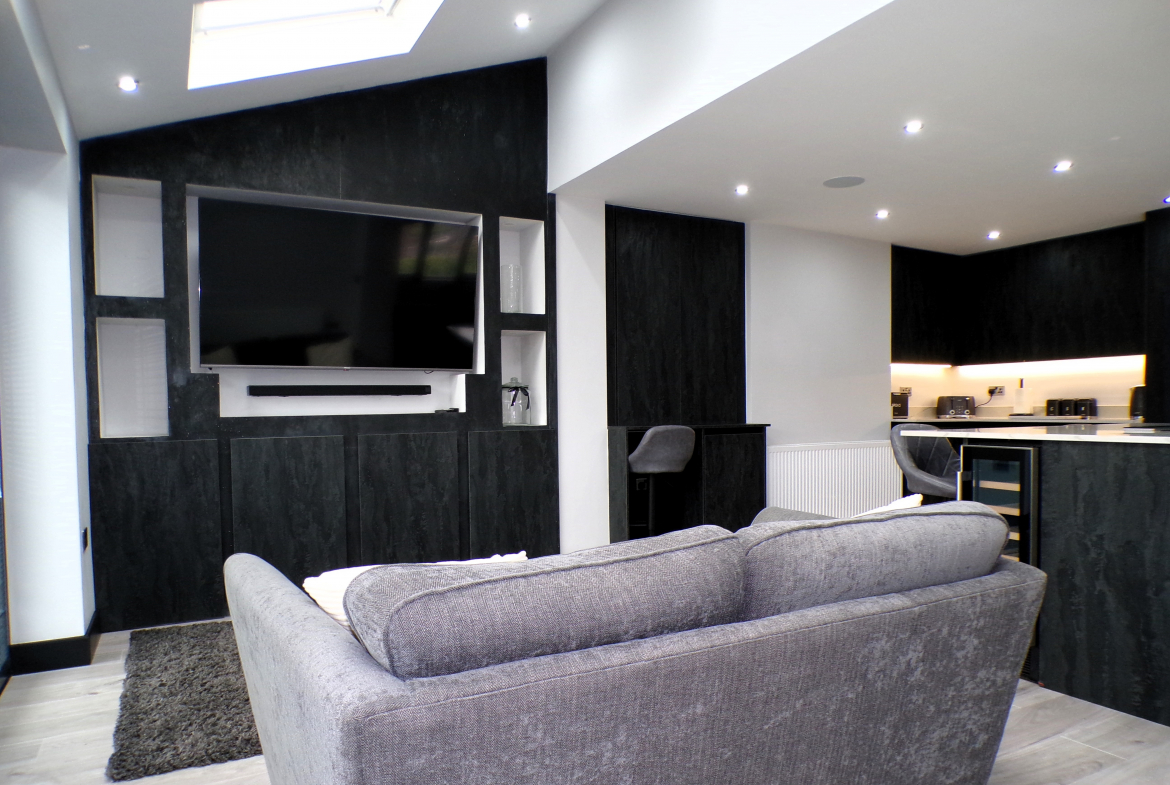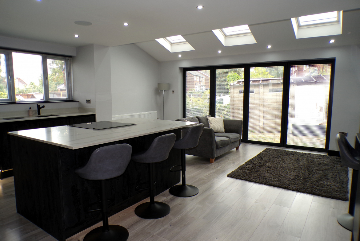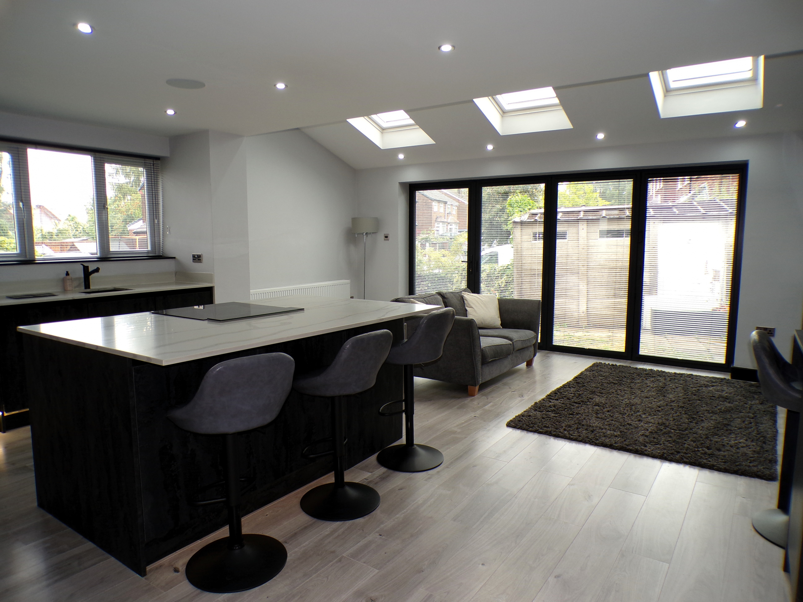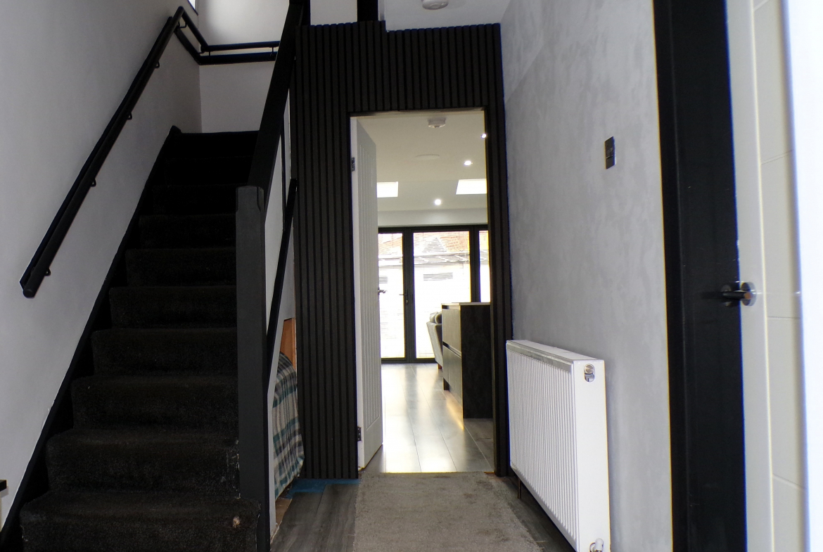 Extended Dining Kitchen/Family Room – 22’7 x 17’1 (6.88m x 5.21m) Modern fitted wall & base units including central island. Integrated oven, hob, microwave & dishwasher. Single sink & drainer. Bi folding doors to the rear. 2 radiators. 3 Velux windows. Under stairs storage with plumbing for washer.