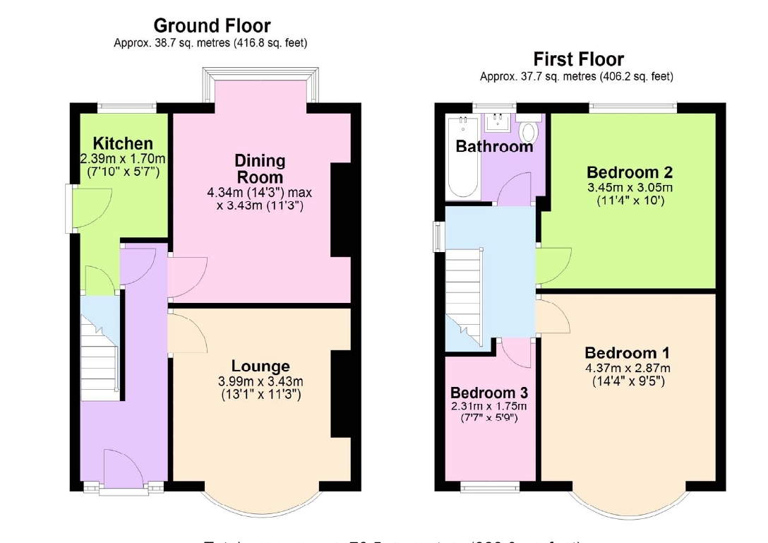 Bedroom 1 – 4.37m x 2.87m (to wardrobes) (14’4 x 9’5 (to wardr – Front aspect. Fitted wardrobes. Bay window. Radiator.