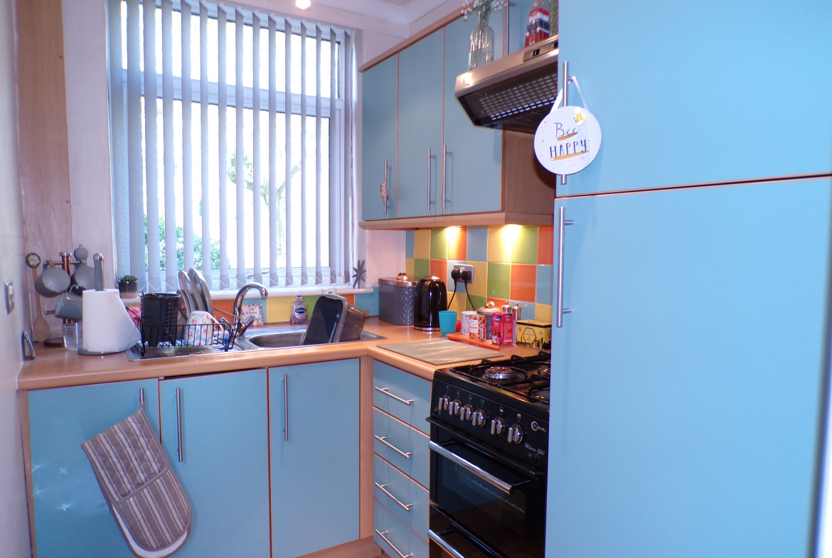 Kitchen – 2.39m x 1.70m (7’10 x 5’7) – Fitted wall & base units incorporating oven, hob & extractor. Stainless steel sink & drainer. Part ceramic wall tiled. Plumbed for washer. Radiator. Under stairs storage.
