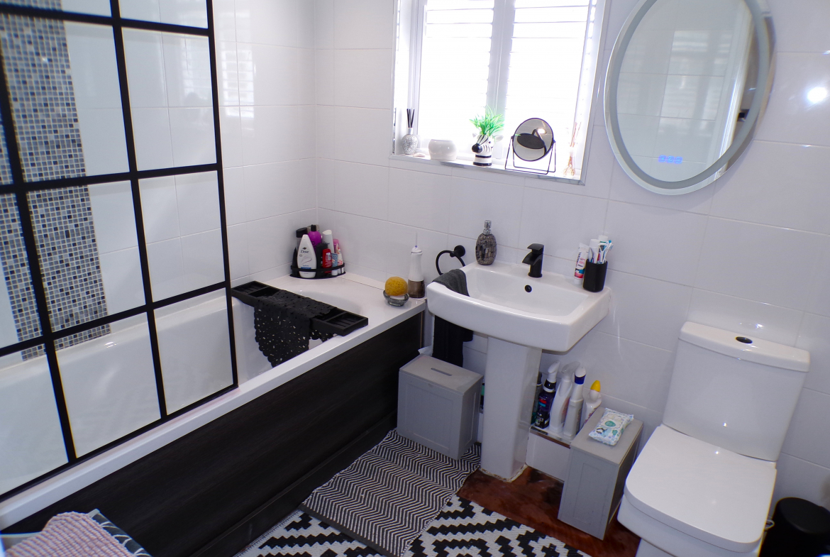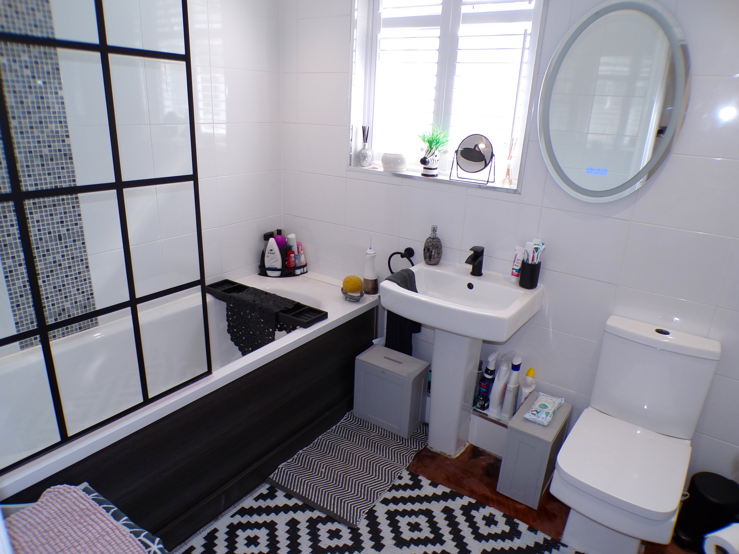Bathroom – 3 piece white suite with shower to bath. Ceramic wall tiled. Heated towel rail.