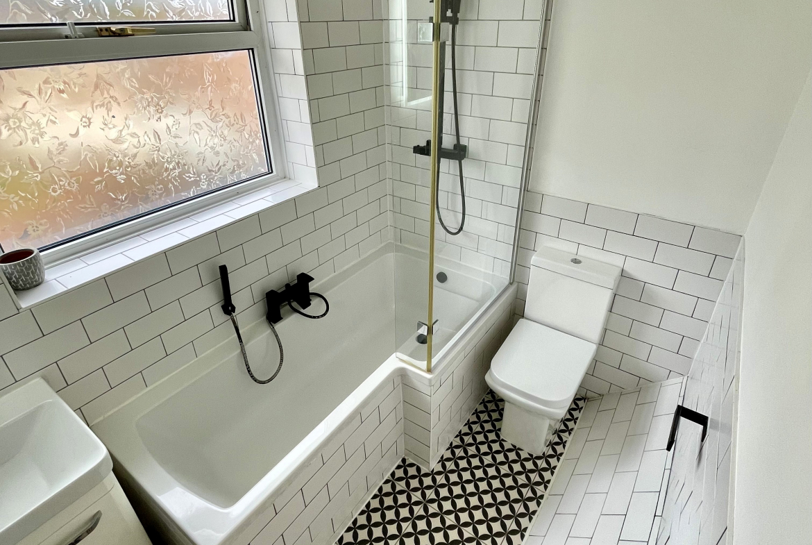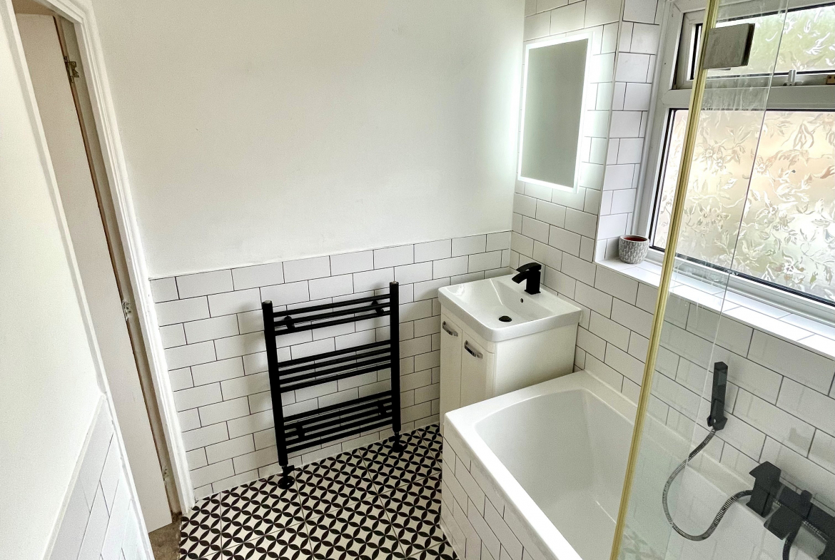 Bathroom – Modern 3 piece white suite with waterfall shower to bath. Part ceramic wall tiled. Heated towel rail.