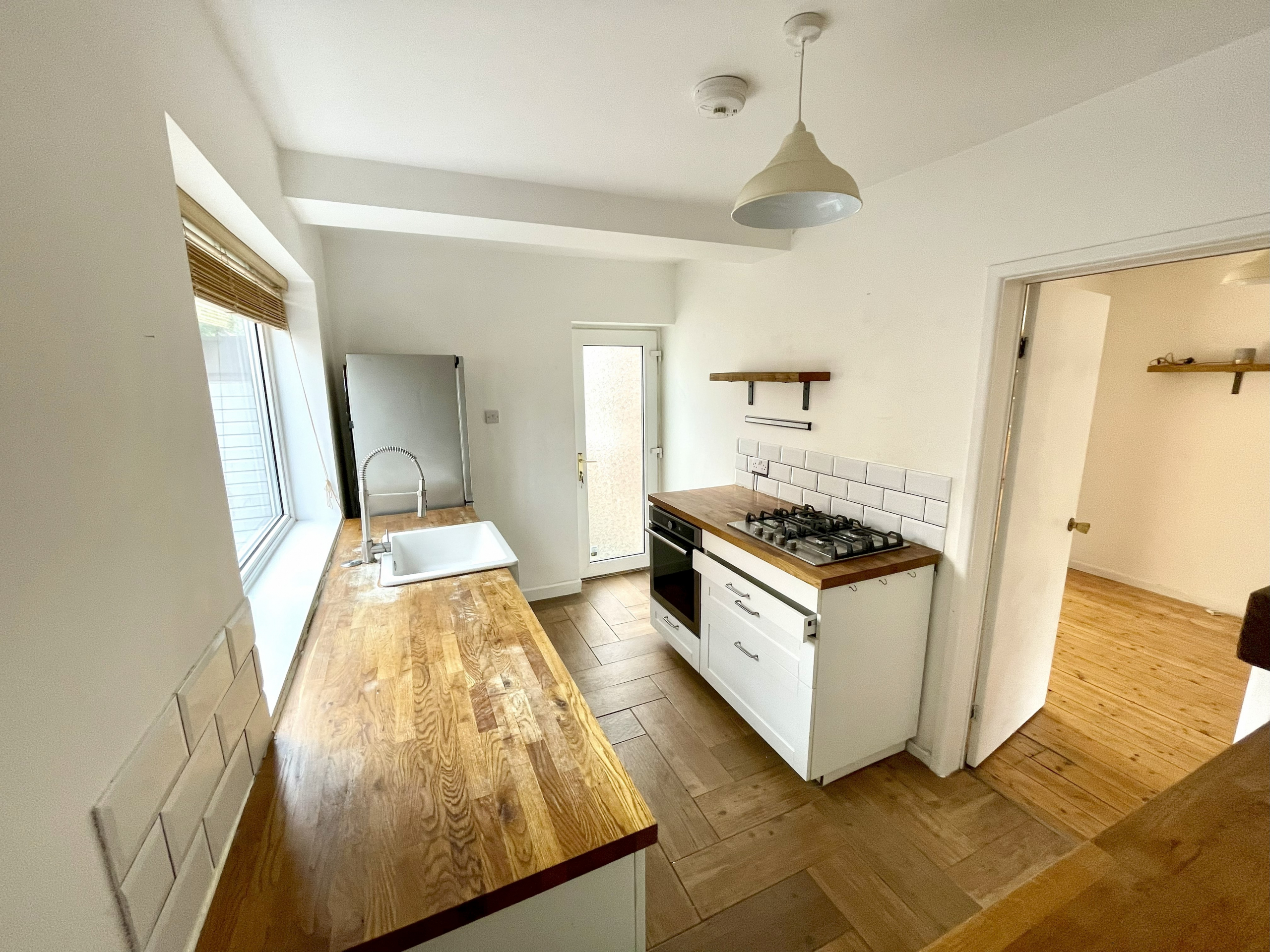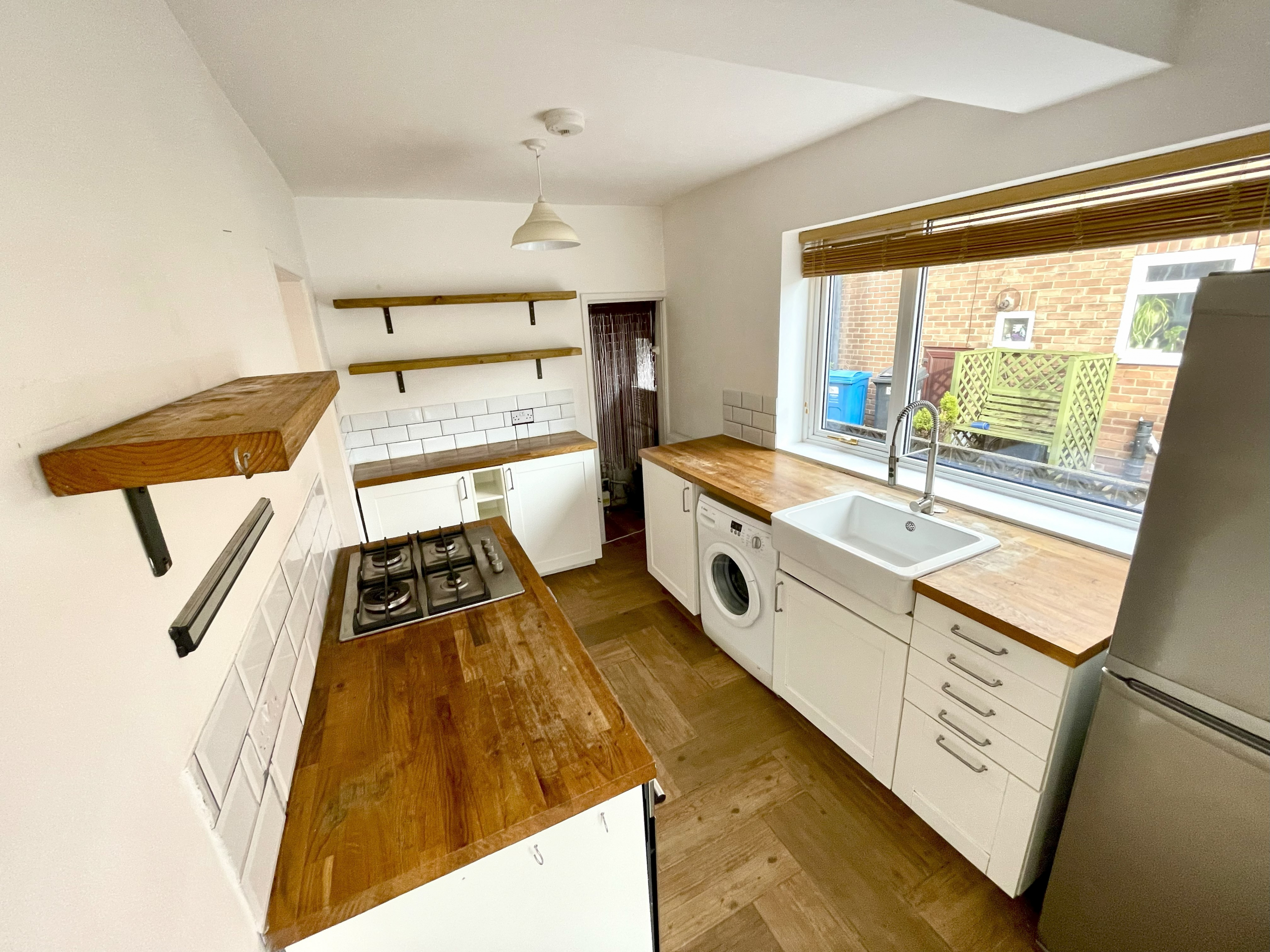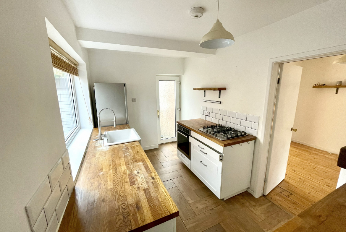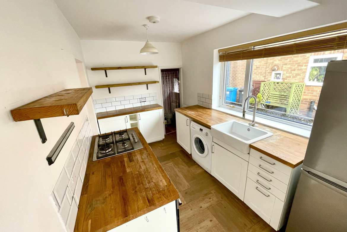 Kitchen – 3.58m x 2.24m (11’9 x 7’4) – Fitted wall & base units with hardwood worktops. Integrated oven & hob. Ceramic sink unit. Part ceramic wall tiled. Plumbed for washer. Under stairs storage. Radiator.