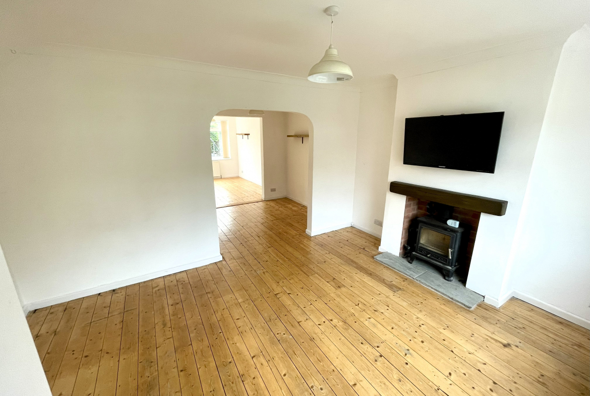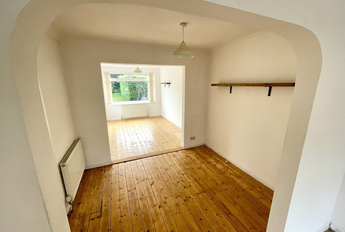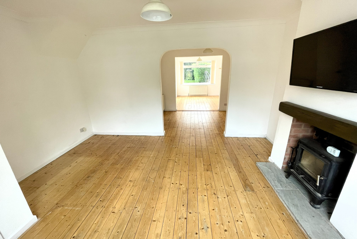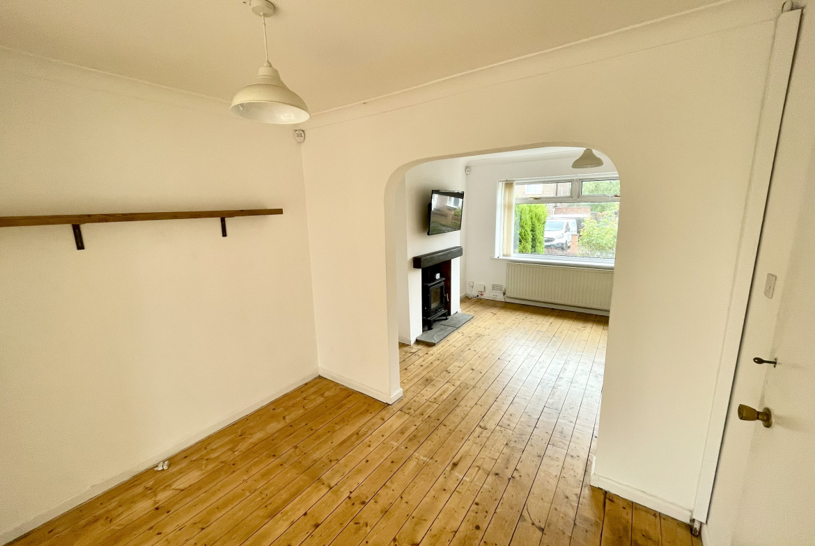 Lounge – 3.43m x 4.42m (11’3 x 14’6) – Log burner fire. Radiator. Arch through to dining room.