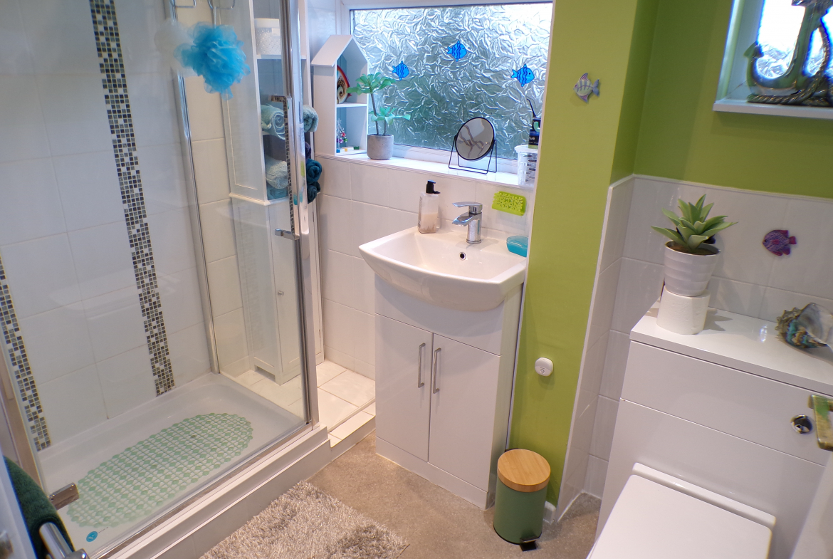 Shower Room – Modern 3 piece white shower suite. Part ceramic wall tiled. Heated towel rail.