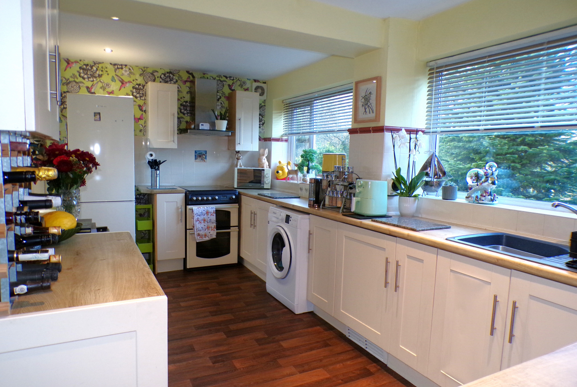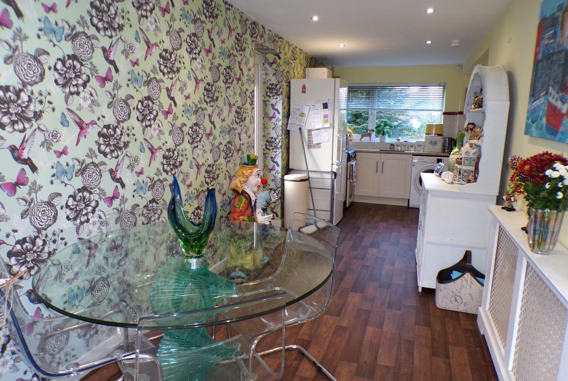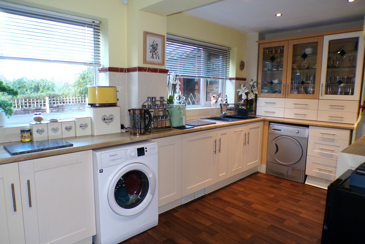Kitchen – 2.62m x 4.65m (8’7 x 15’3) – Fitted wall & base units. Single sink & drainer. Part ceramic wall tiled. Plumbed for washer. Open through to dining room.