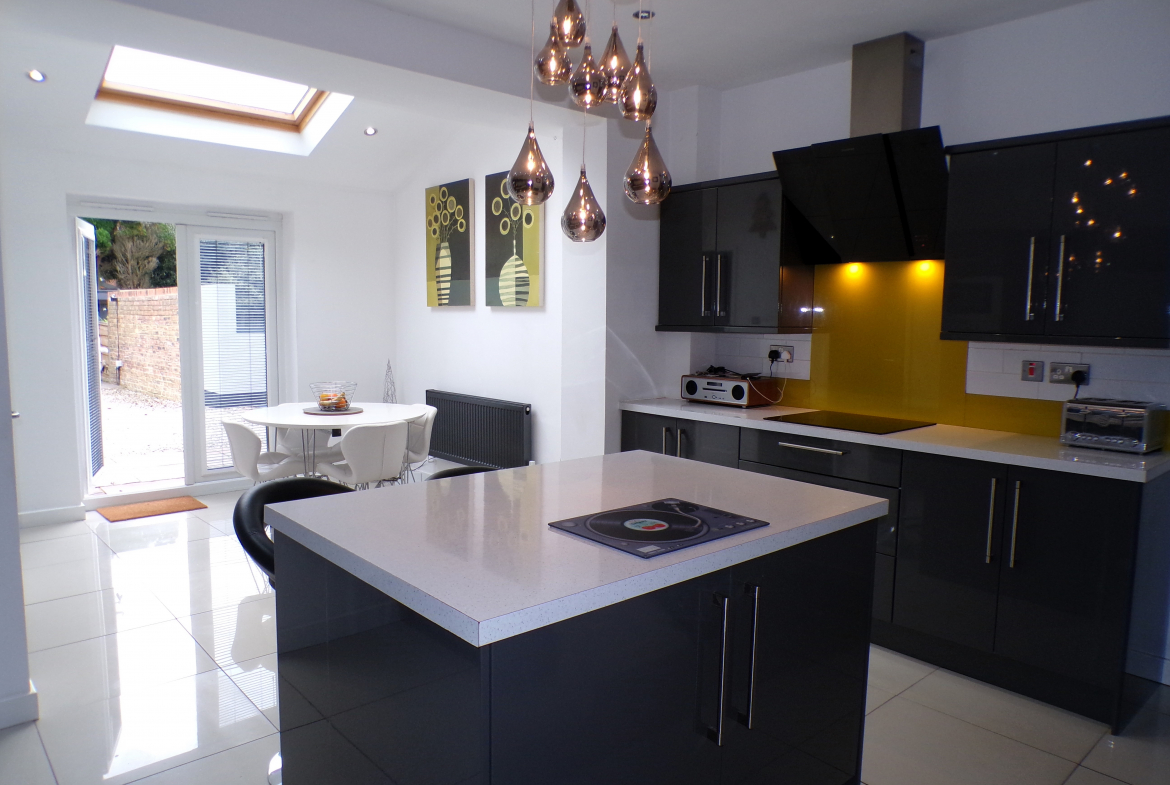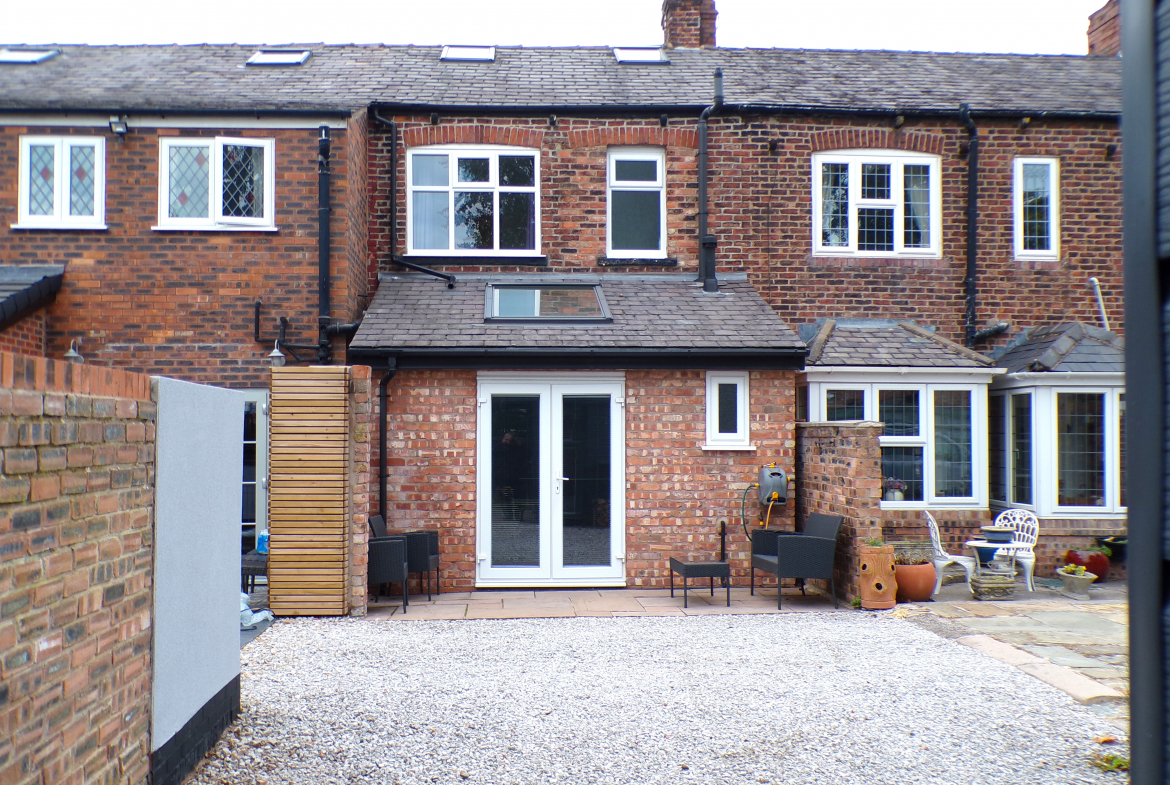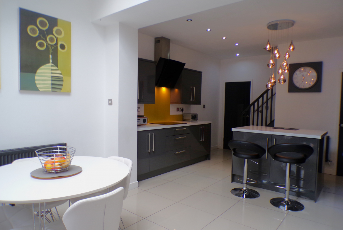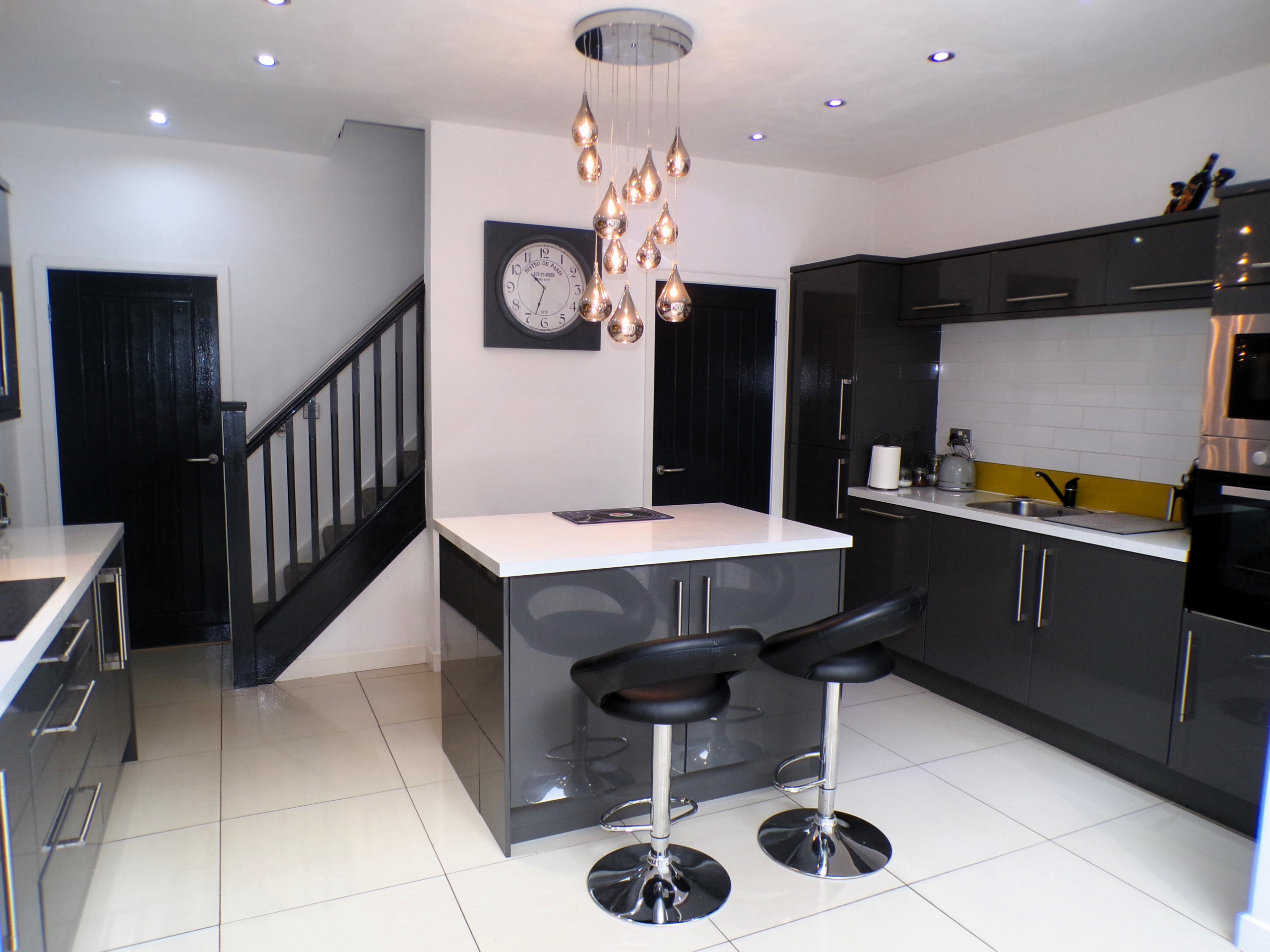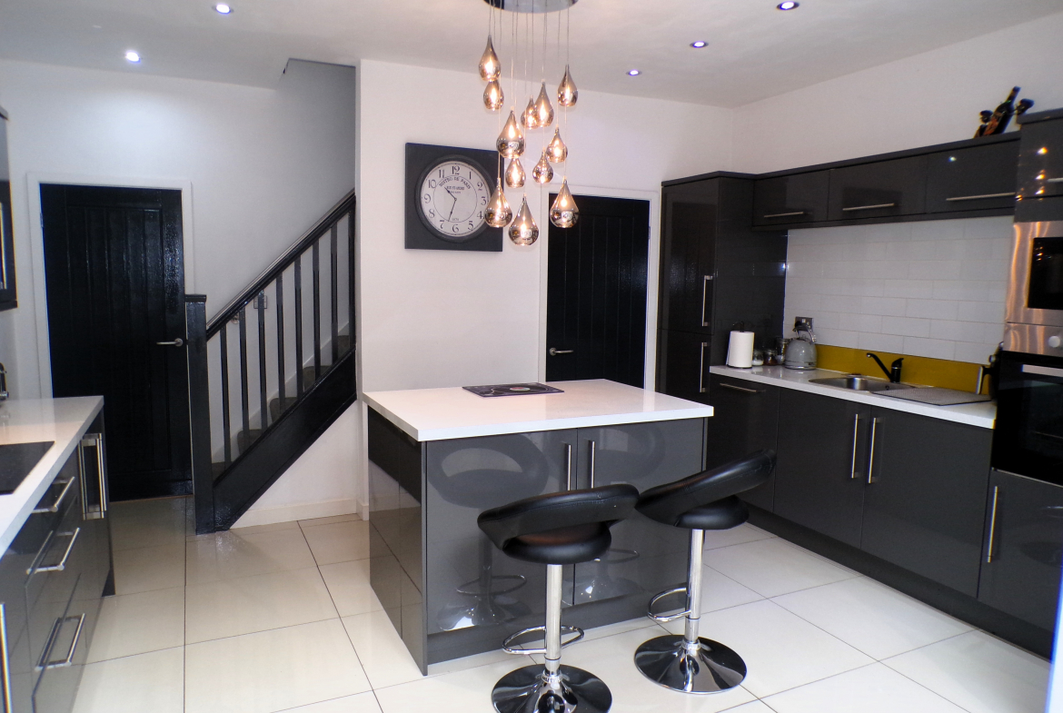 Extended Dining Kitchen – 6.76m x 4.45m (22’2 x 14’7) – Modern fitted wall & base units with central island. Integrated oven, hob & extractor, fridge, freezer & dishwasher. Open plan stairs off. Under stairs storage. Part ceramic wall tiled. Ceramic floor tiled. Plumbed for washer. Boiler room with combi gas central heating boiler. 2 radiators. French doors to rear.
