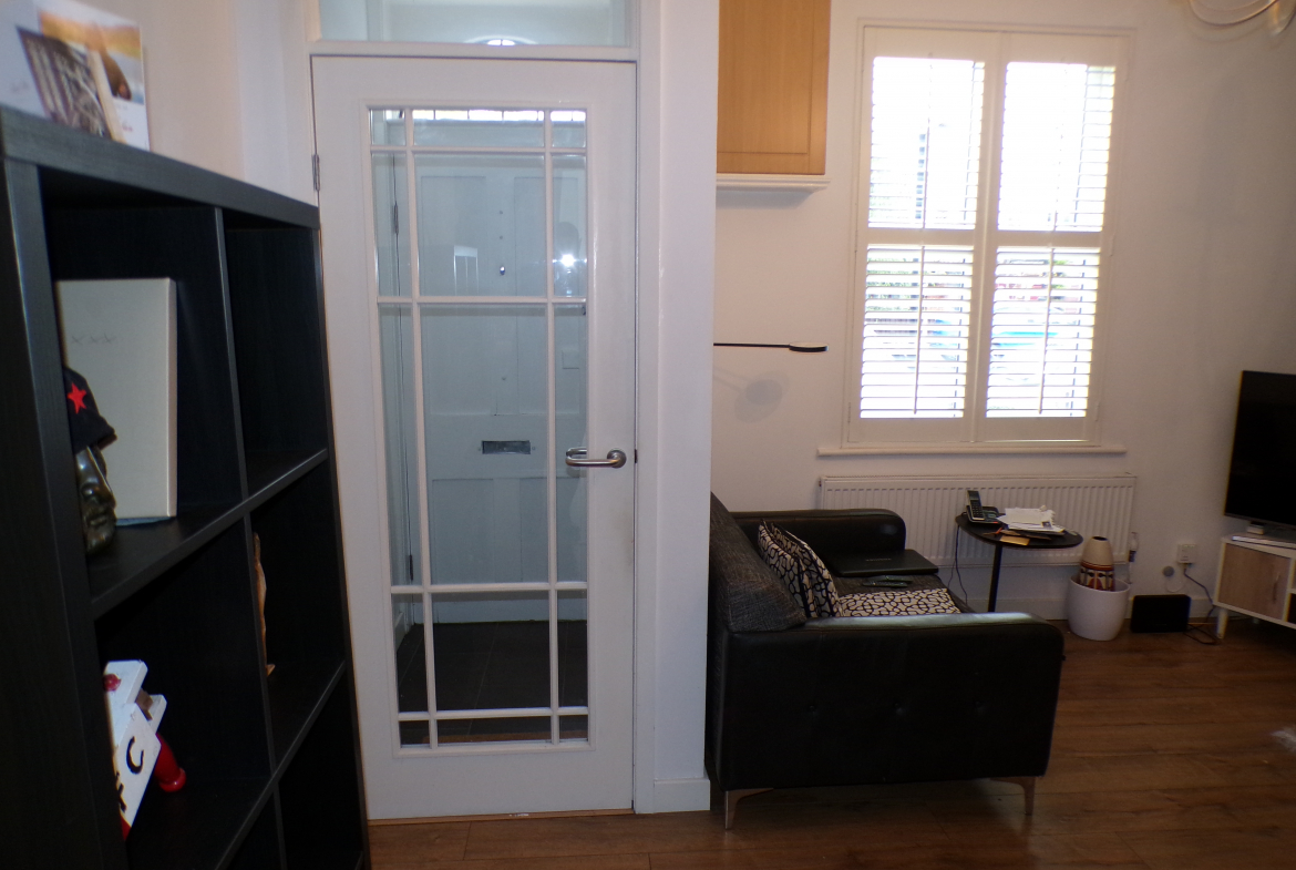 Lounge – 3.61m x 4.52m (11’10 x 14’10) – Log burner fire. Wood laminate floor. Radiator.