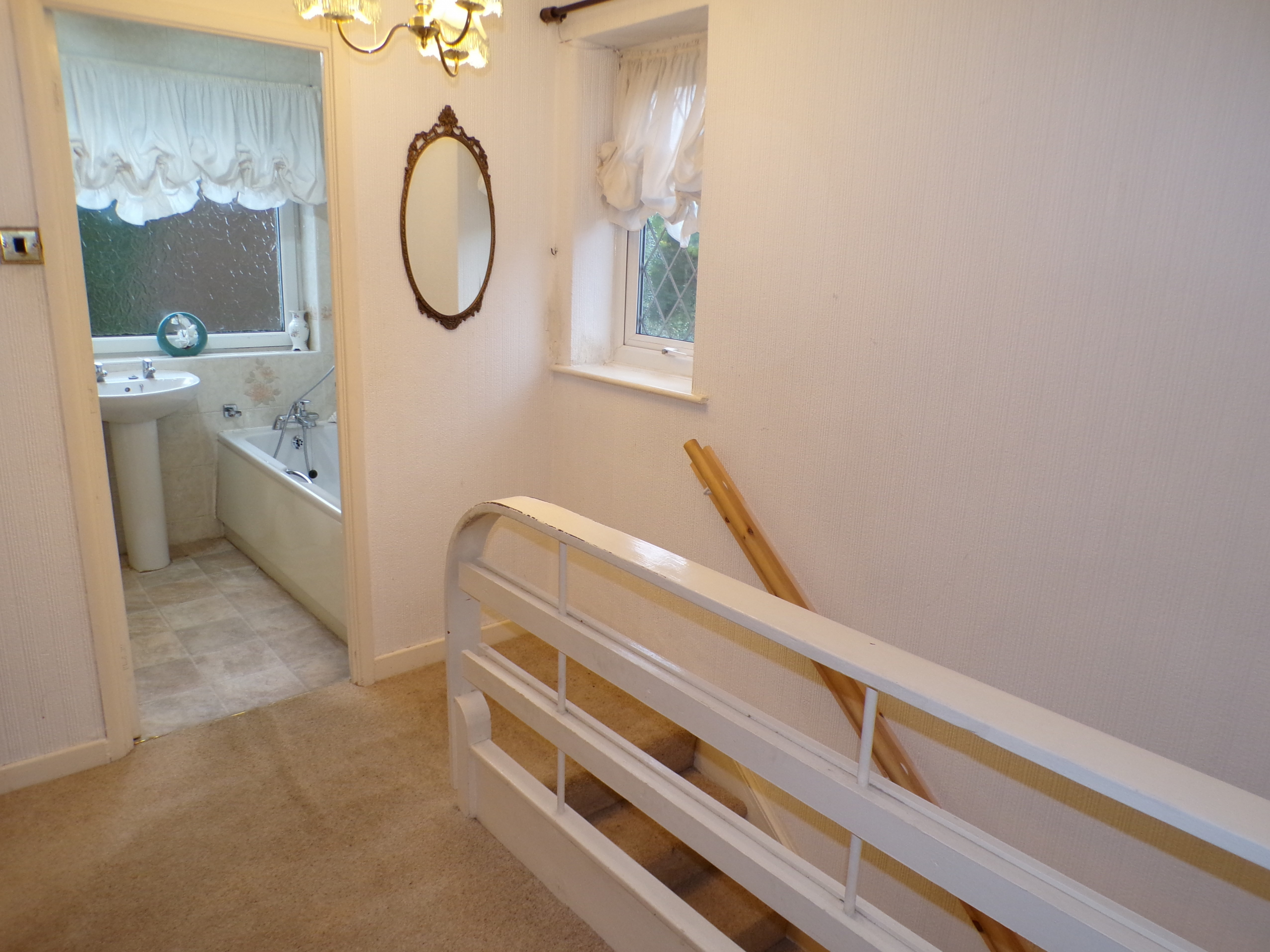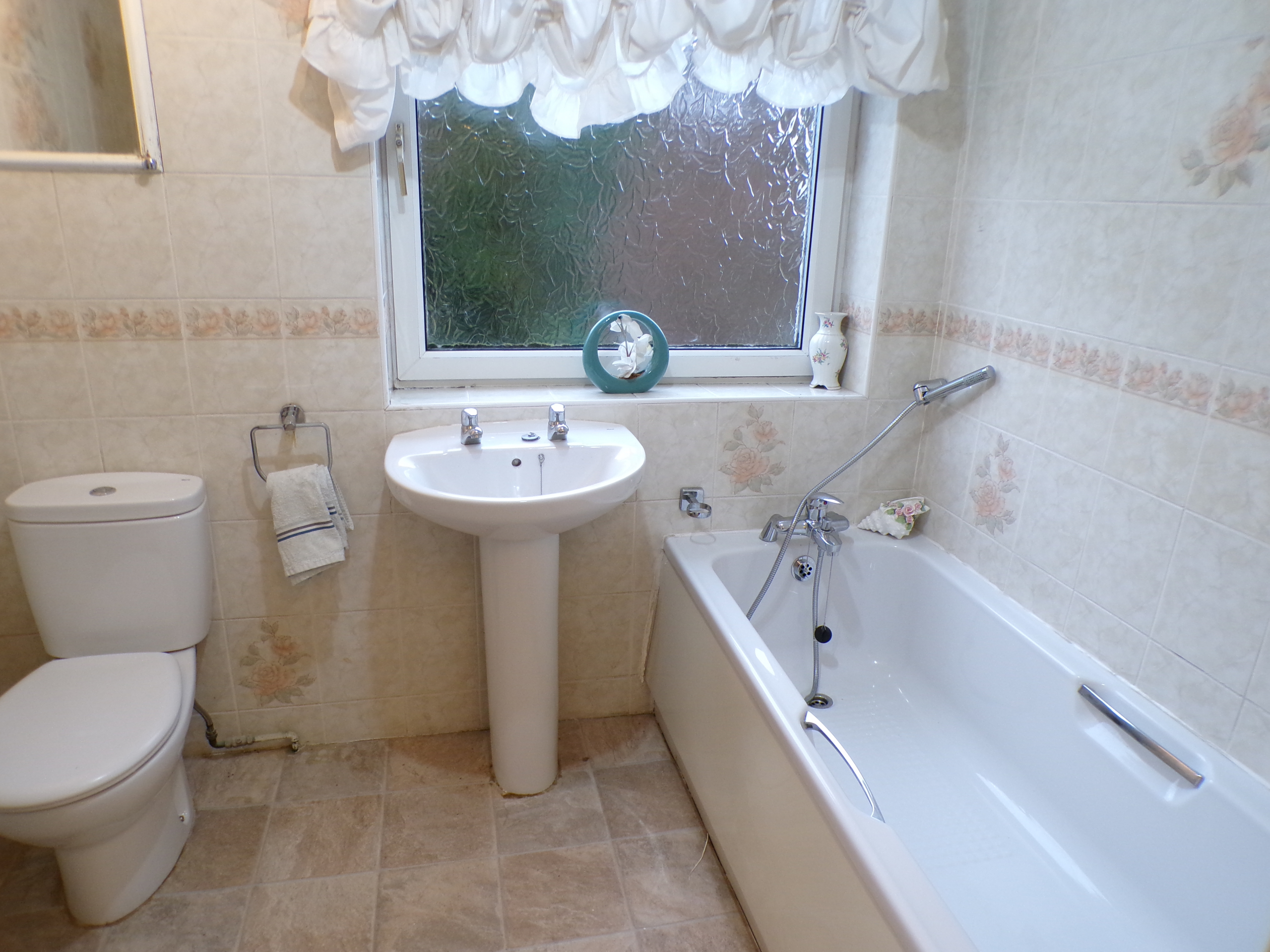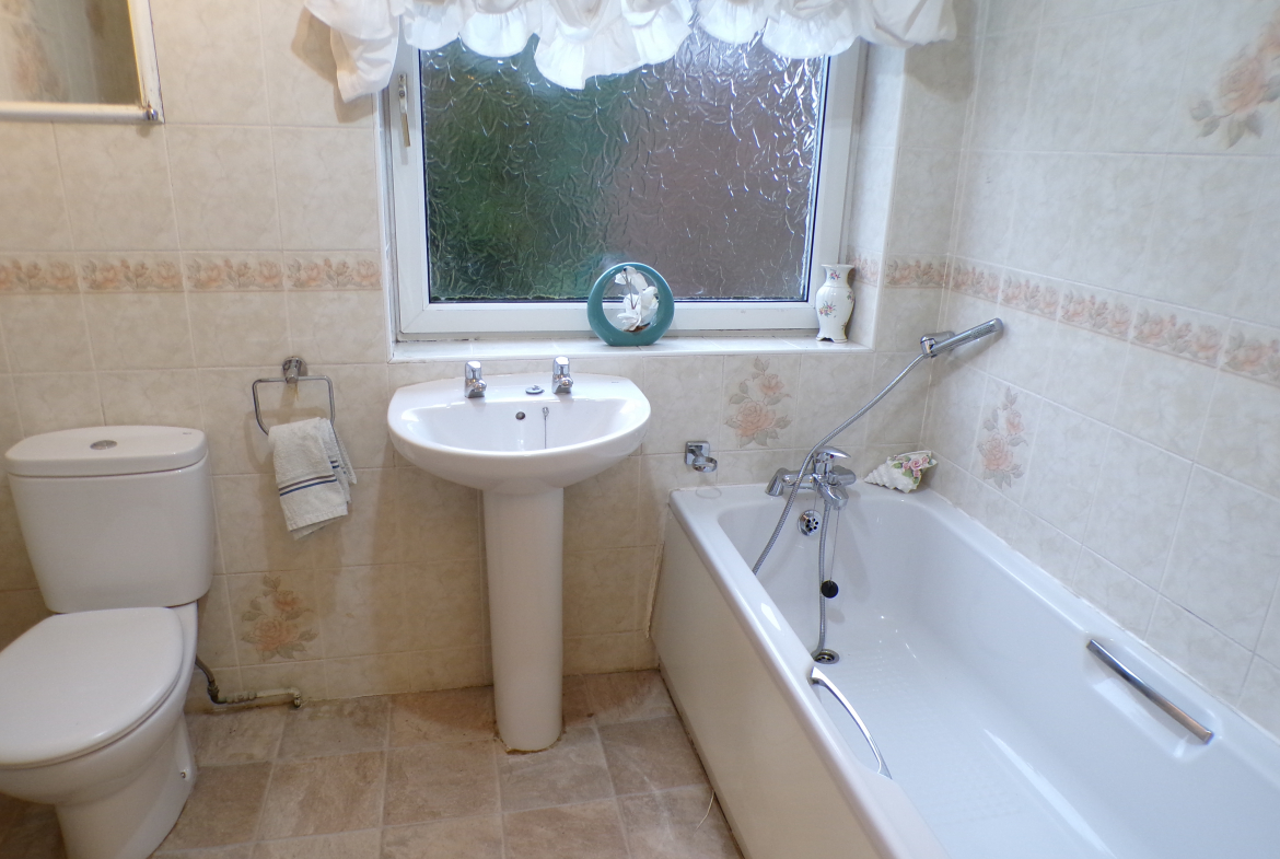 Bathroom – 3 piece white suite with shower attachment to bath. Ceramic wall tiled. Heated towel rail.