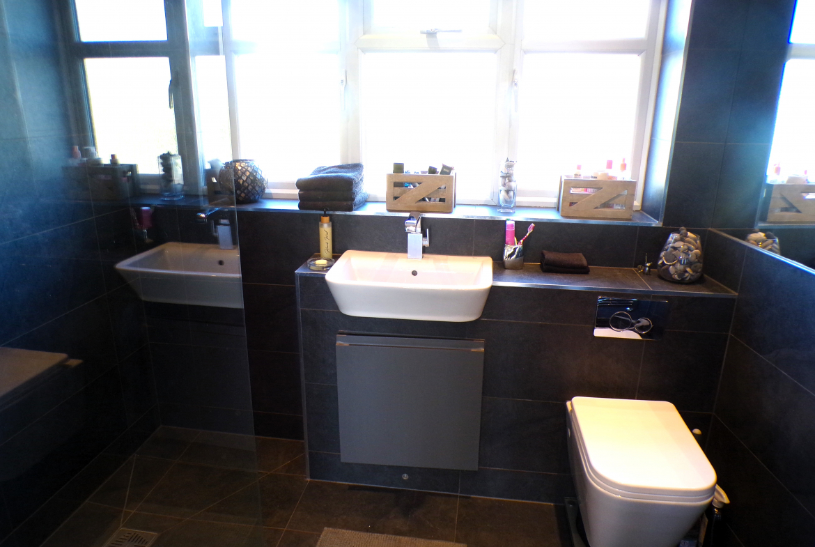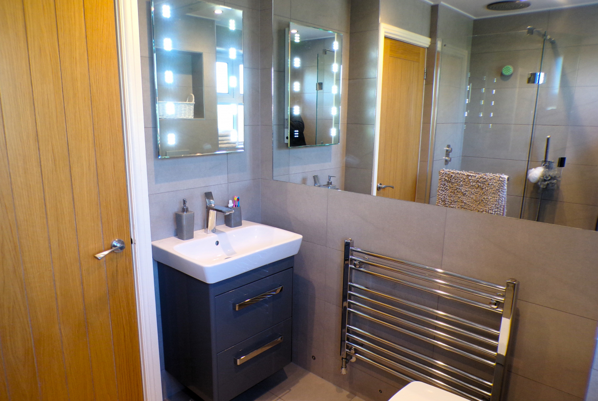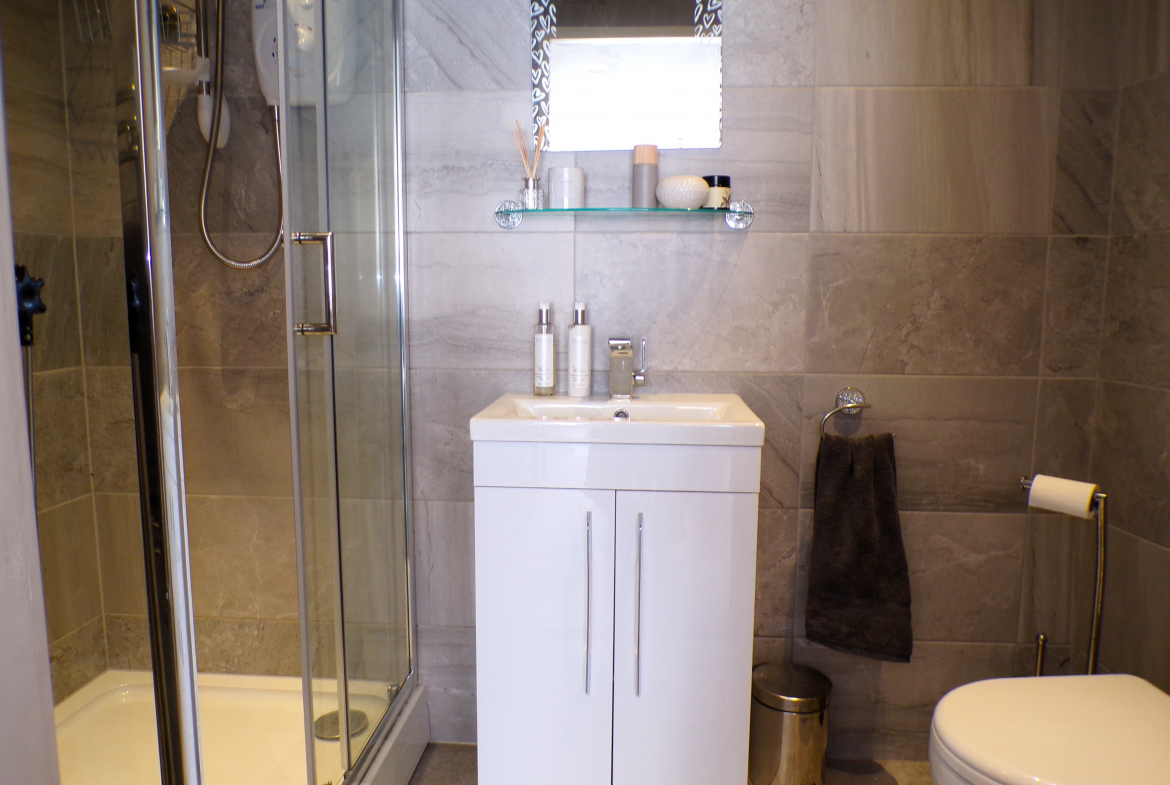 Downstairs Shower Room – Modern 3 piece white shower suite. Ceramic wall & floor tiled. Heated towel rail.