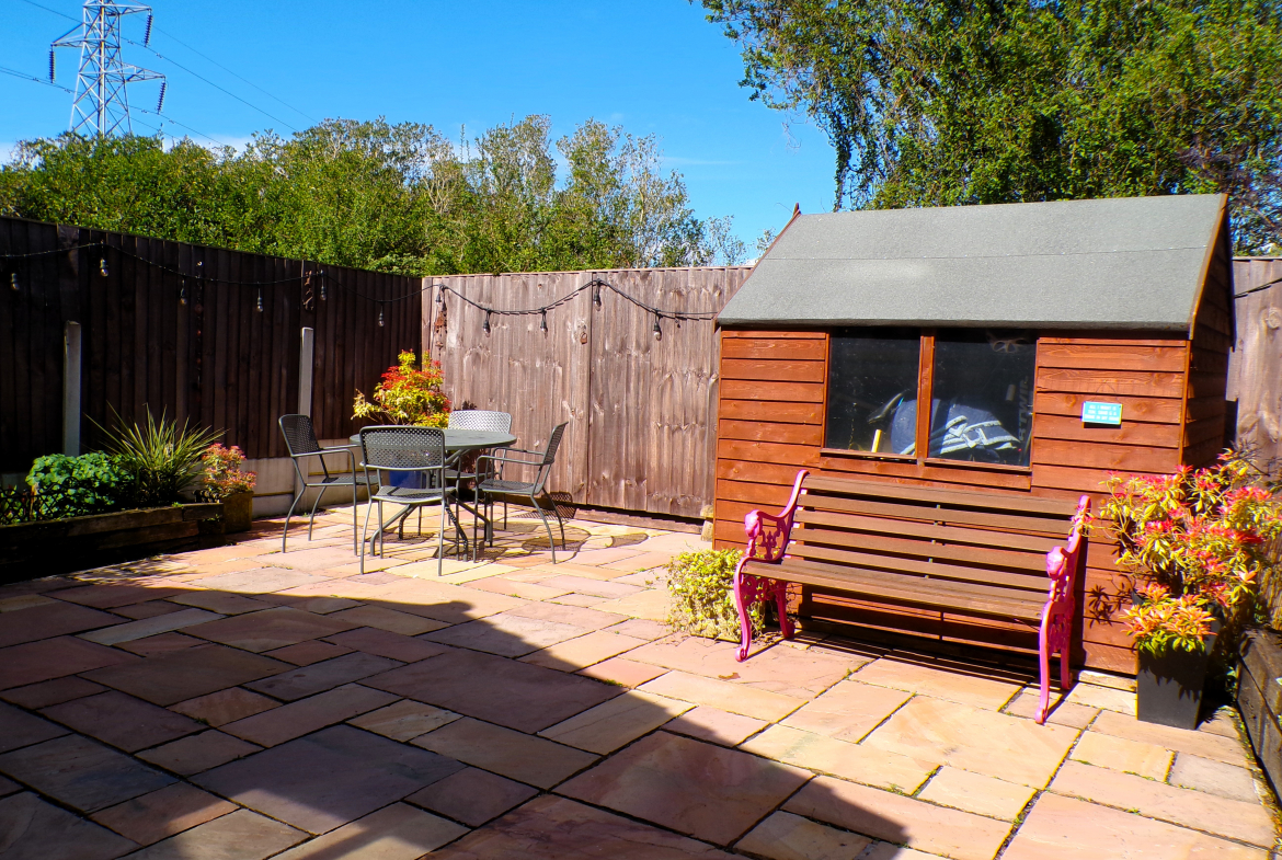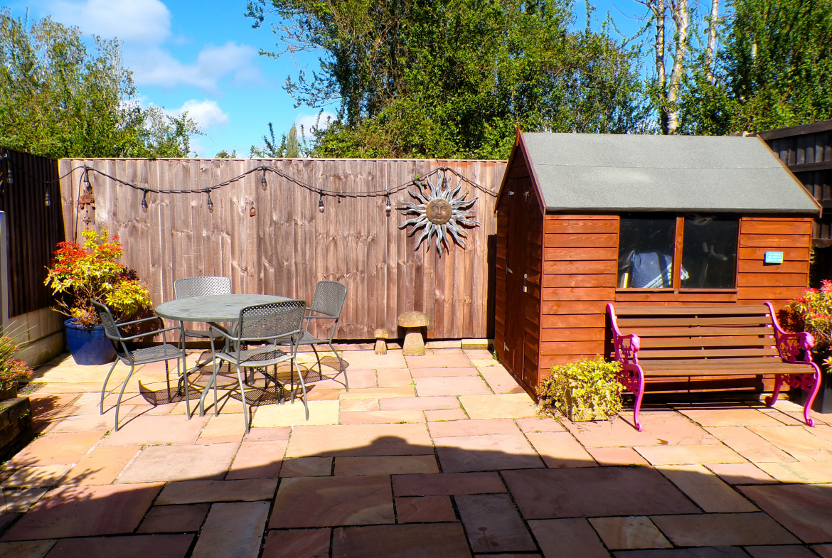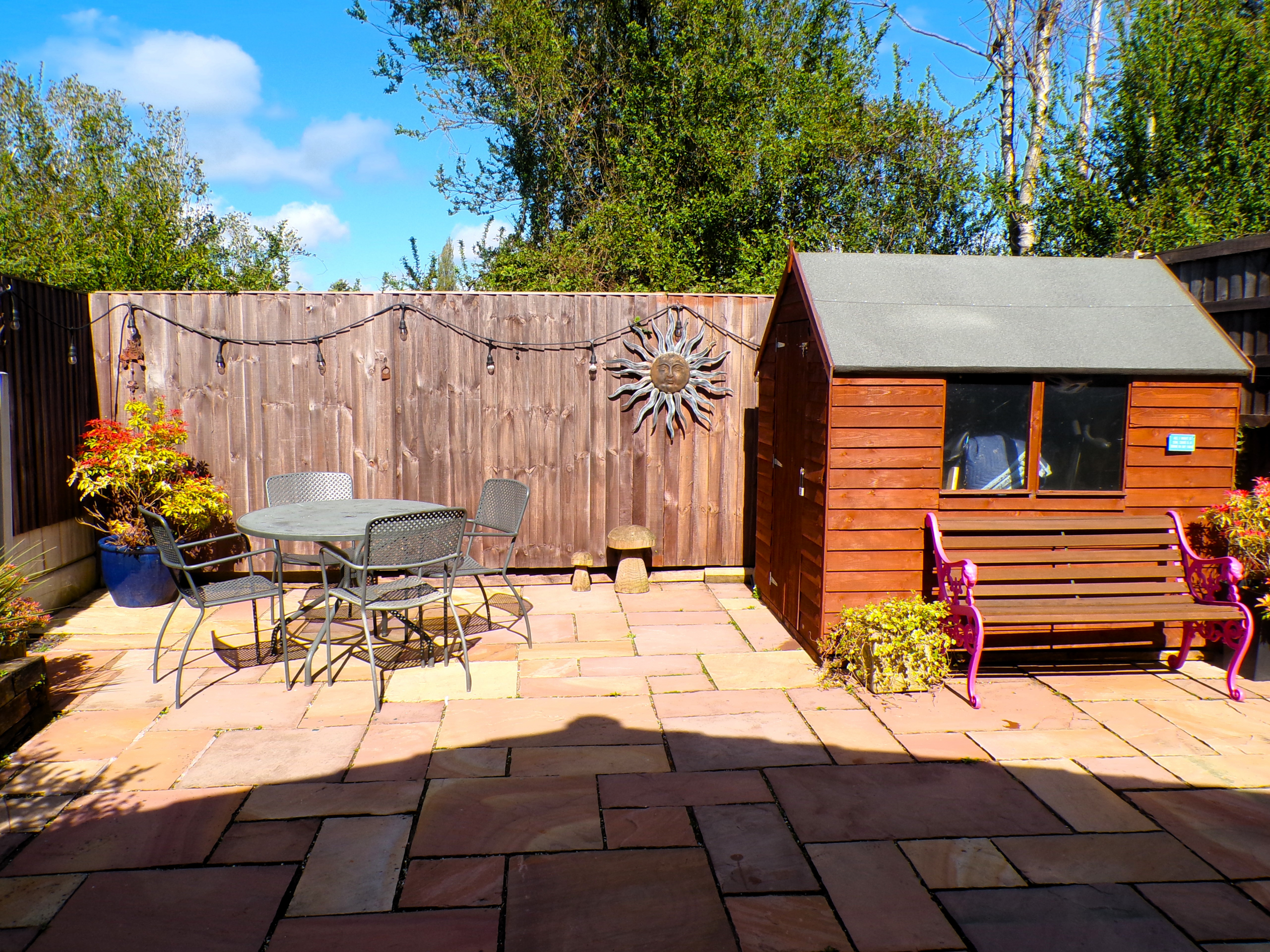 External – Double patterned concrete driveway to the front. Garden to rear with patio & timber shed. Overlooks fields to the rear.