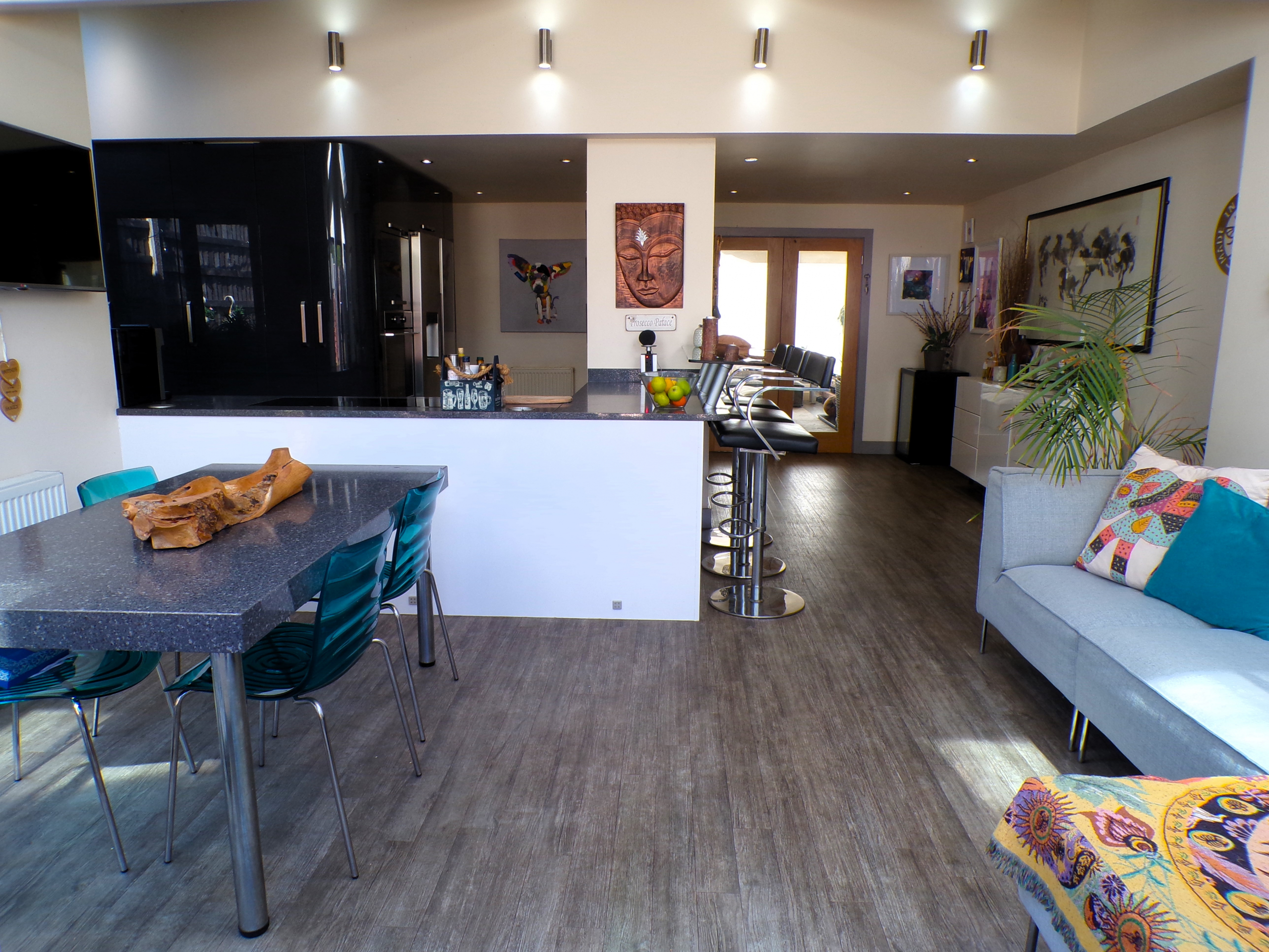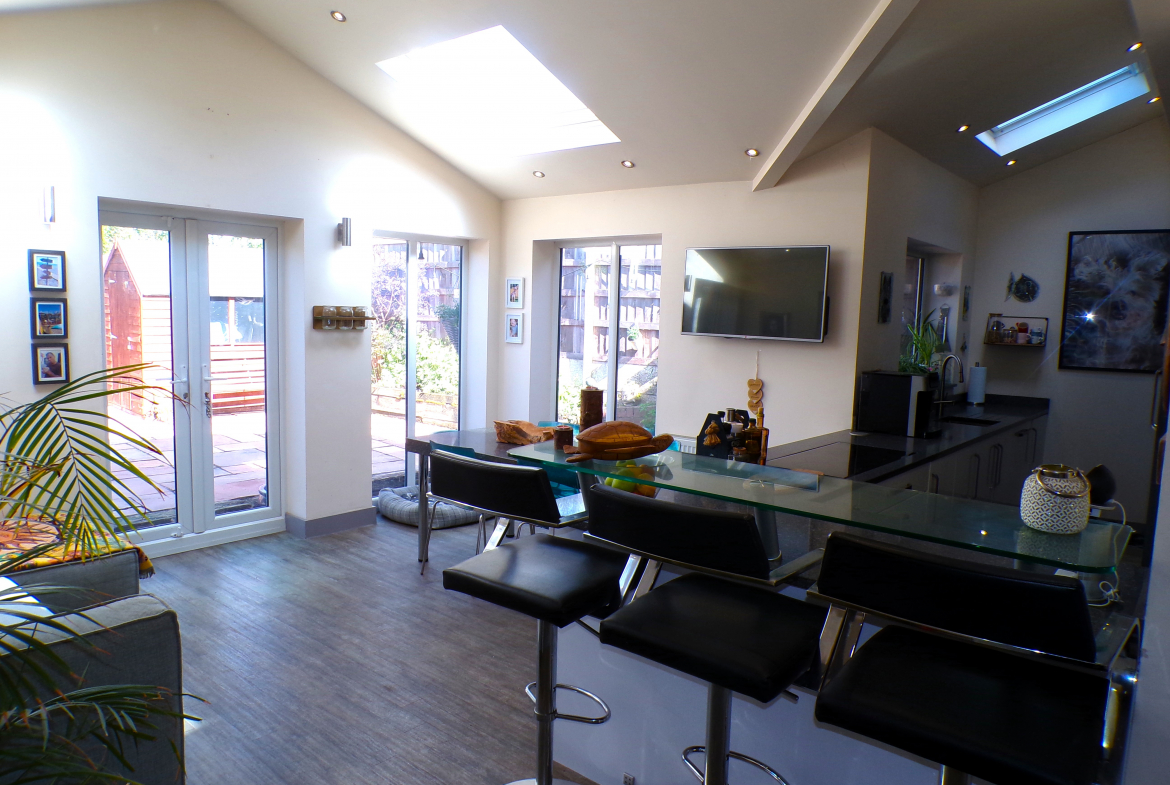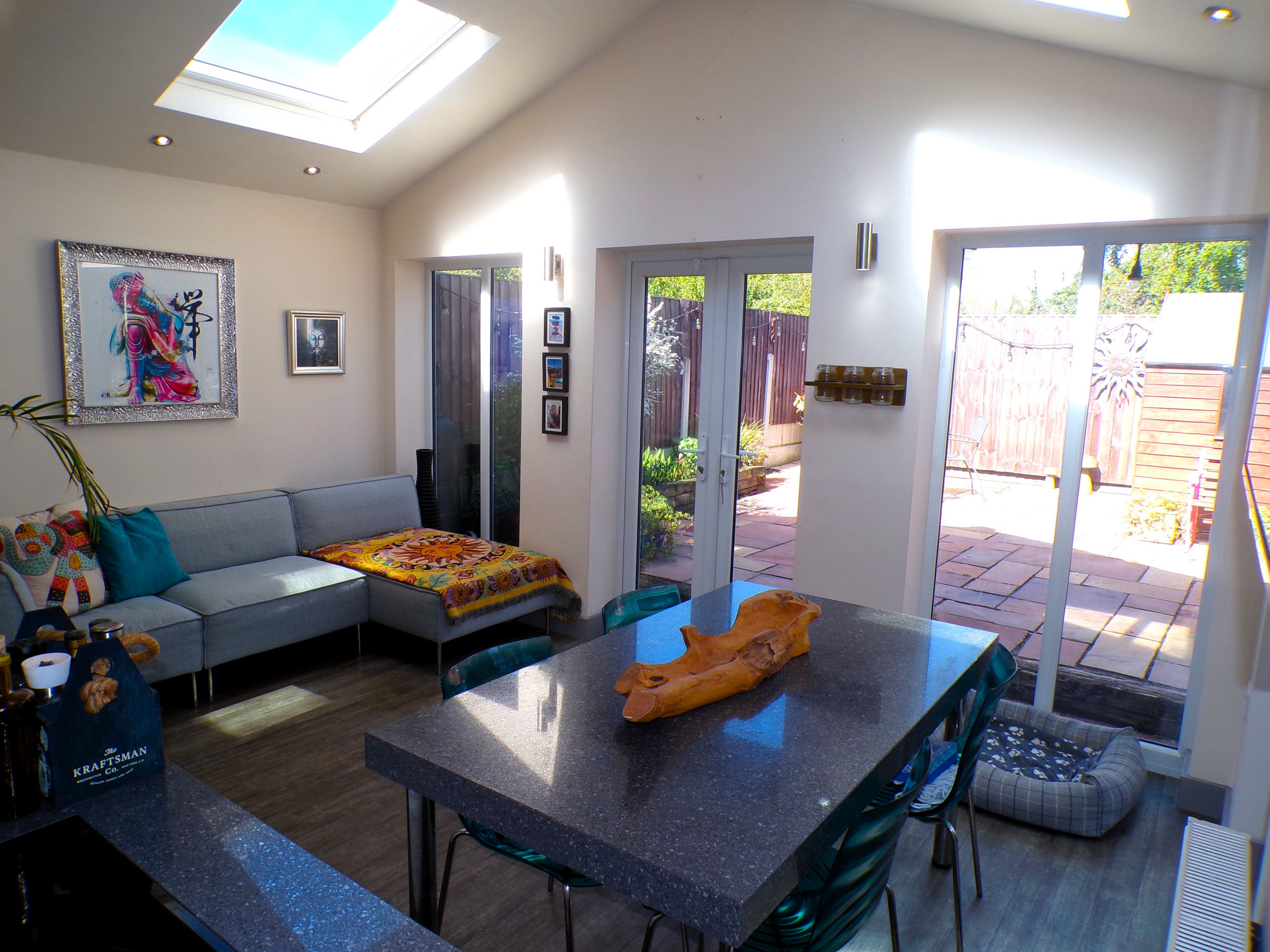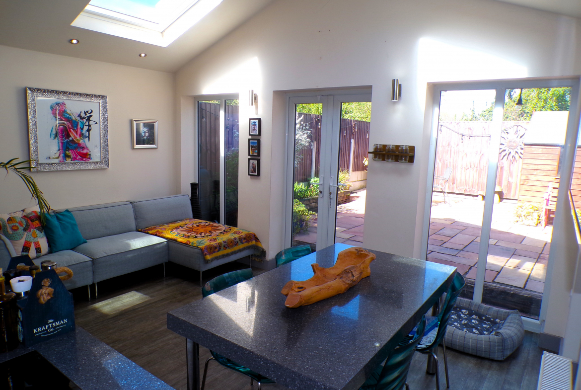 Extended Family Room/Dining Kitchen – 7.32m x 7.47m (24’0 x 24’6) – Luxury modern fitted wall & base units with granite worktops. Plumbed for washer. Single sink & drainer. 2 radiators. Sitting/dining area. 2 Velux windows. French doors to rear.