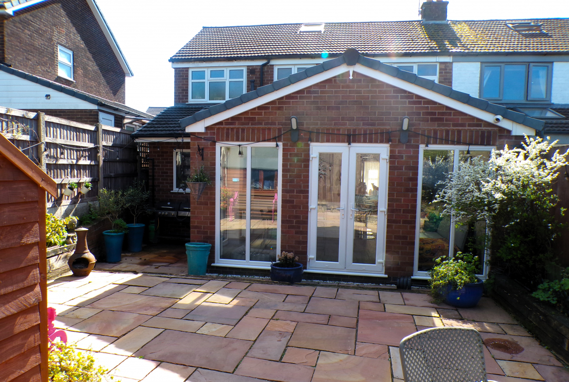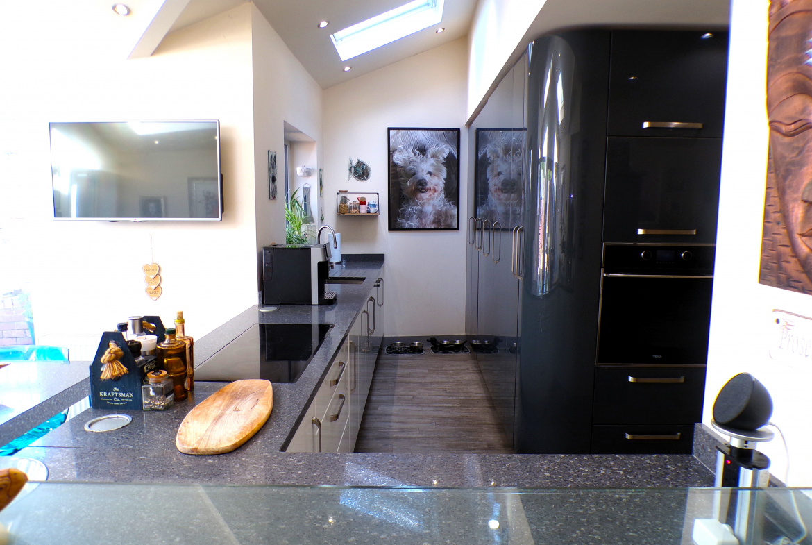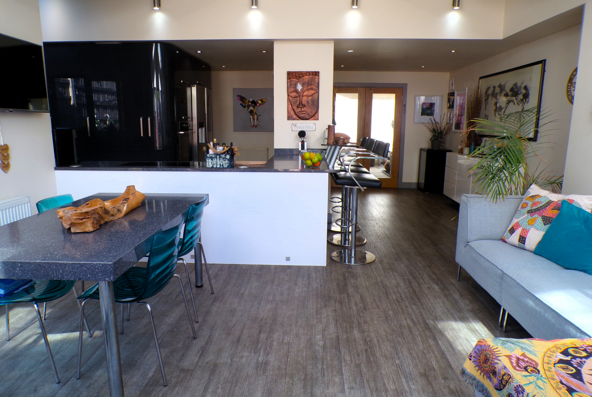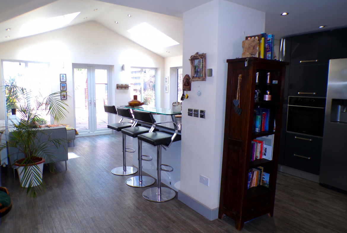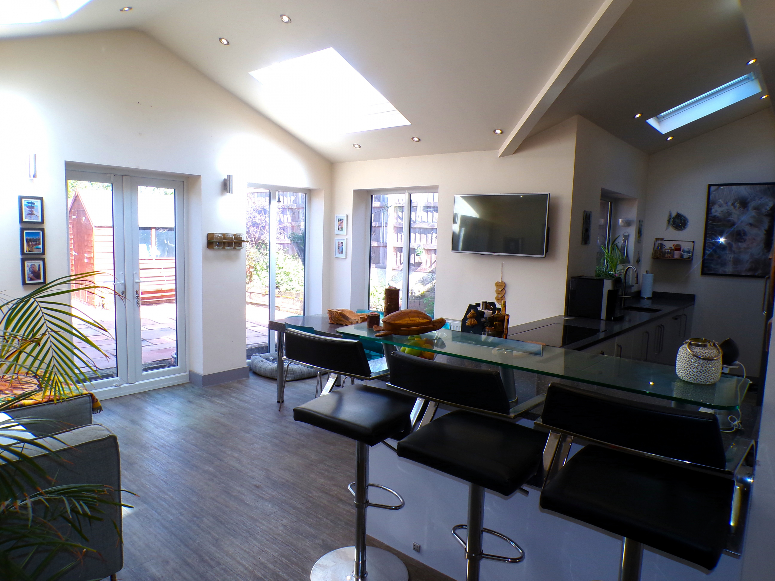 Extended Family Room/Dining Kitchen – 7.32m x 7.47m (24’0 x 24’6) – Luxury modern fitted wall & base units with granite worktops. Plumbed for washer. Single sink & drainer. 2 radiators. Sitting/dining area. 2 Velux windows. French doors to rear.