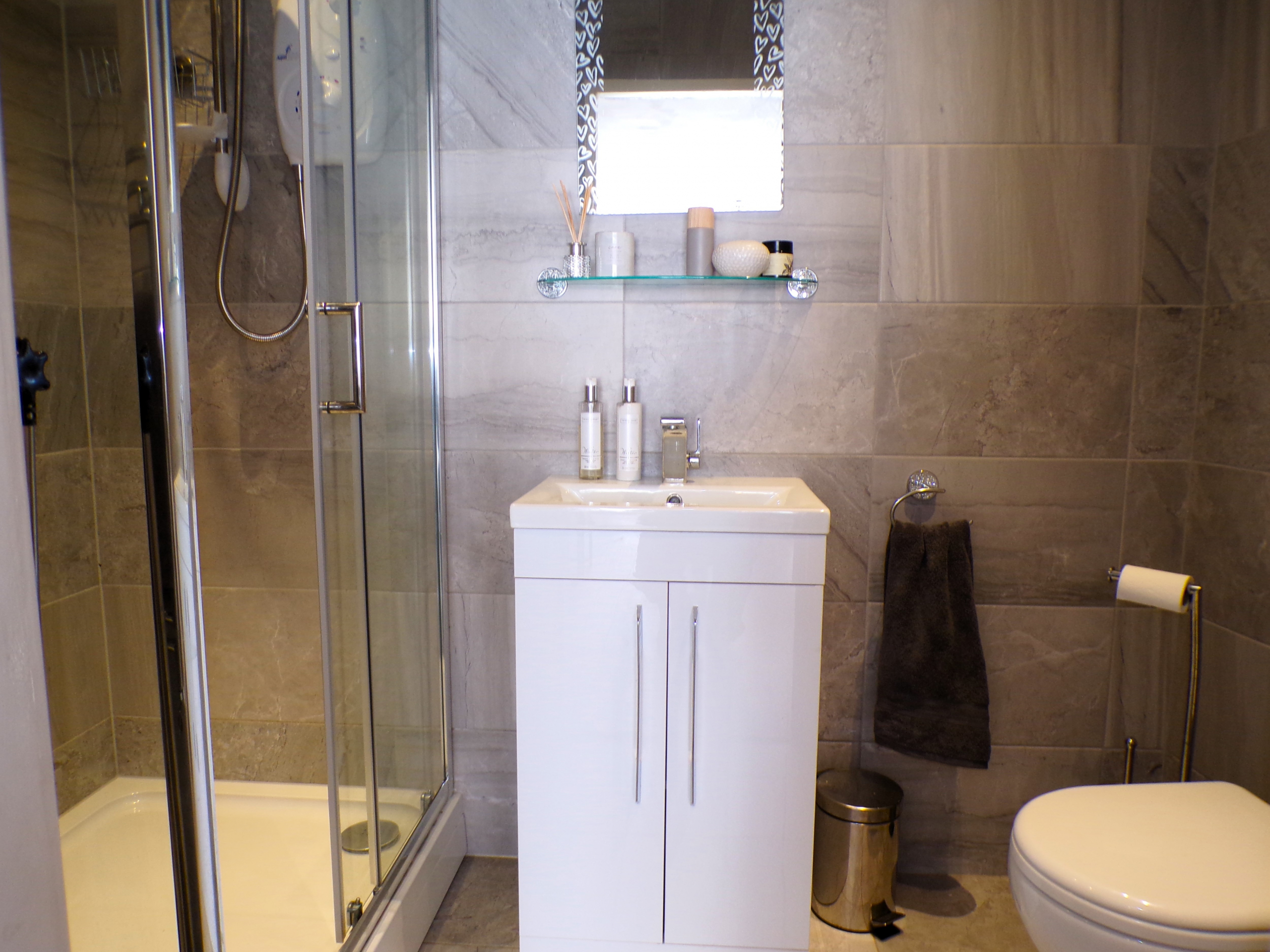 En Suite – Modern 3 piece shower suite. Ceramic wall & floor tiled. Heated towel rail.
