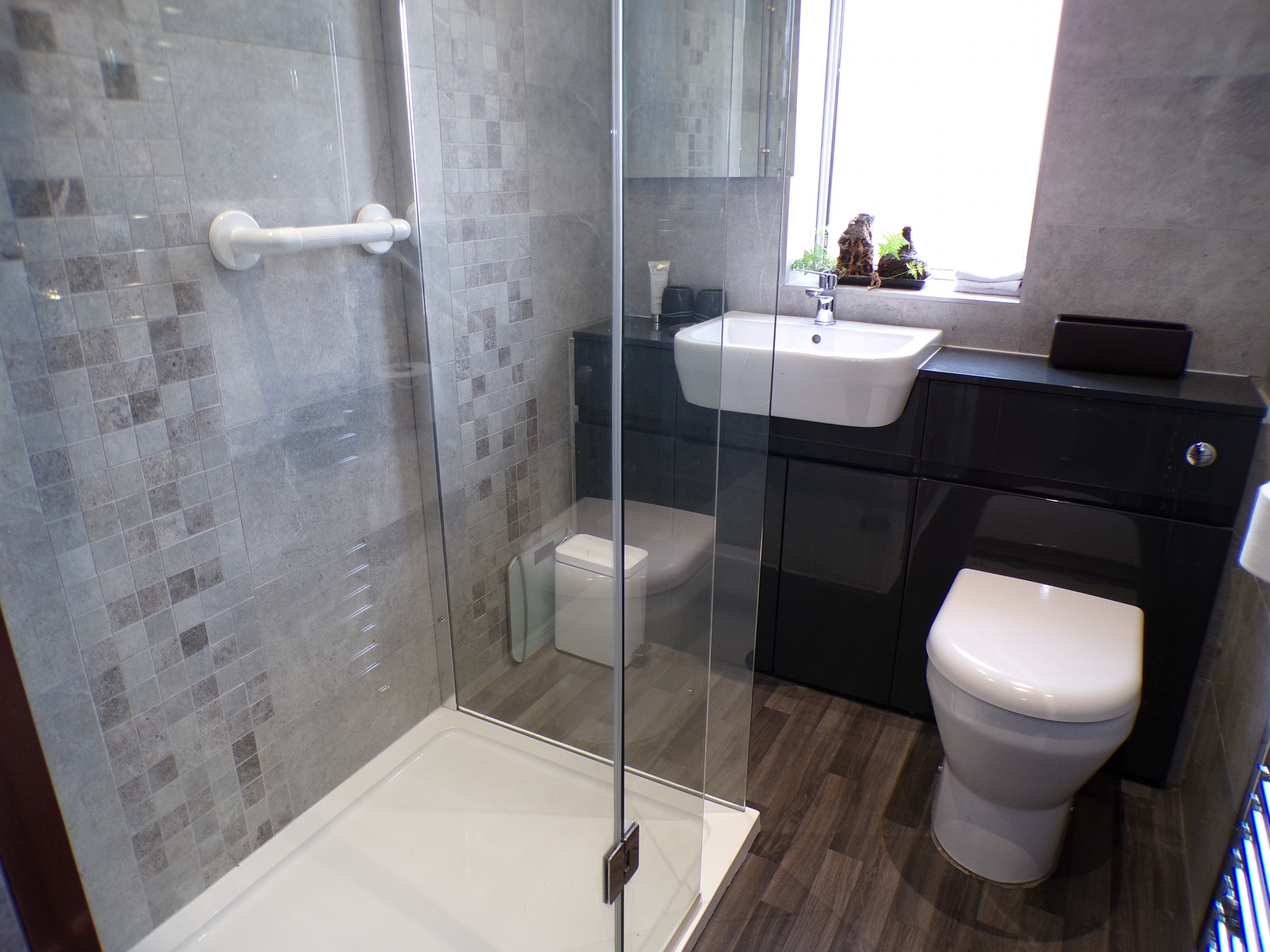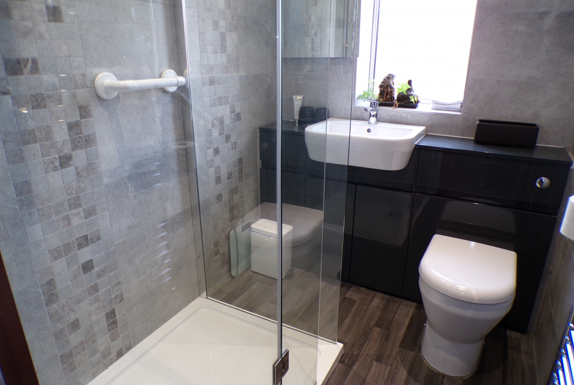 Shower Room – 3 piece white shower suite. Ceramic wall tiled. Heated towel rail.