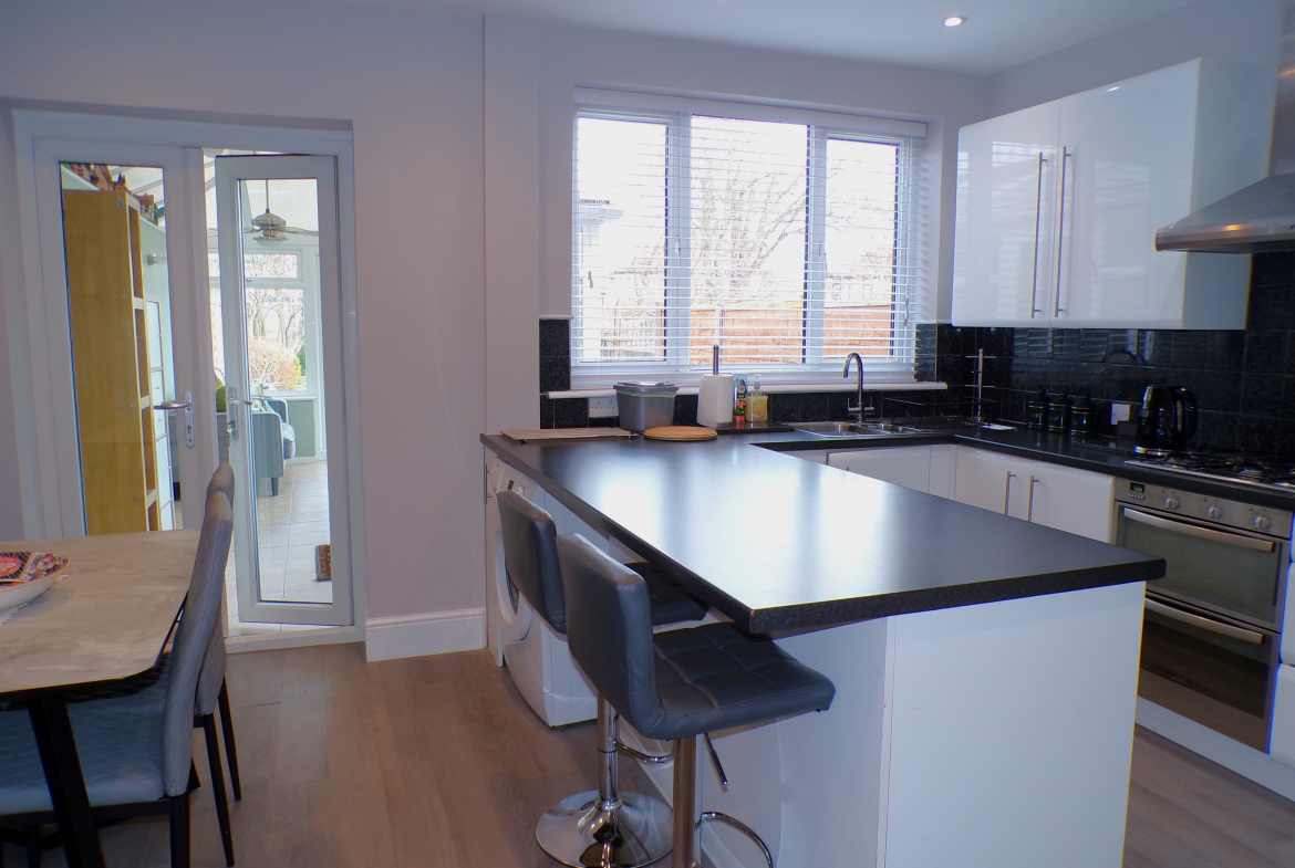 Kitchen – 3.71m x 4.22m (12’2 x 13’10) – Fitted wall & base units incorporating oven, hob & extractor. Stainless steel sink, rinser & drainer. Part ceramic wall tiled. Plumbed for washer. Radiator. French doors to rear.