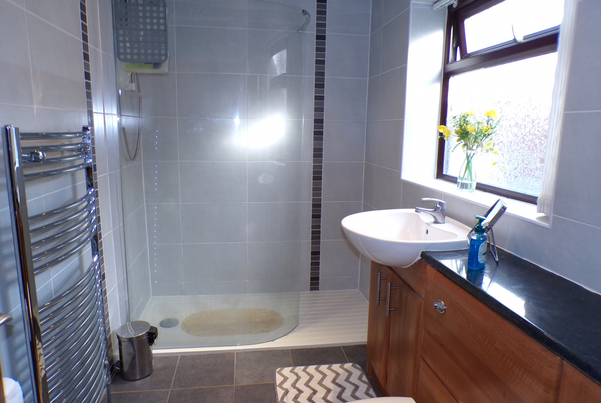 Shower Room – Modern 3 piece white shower suite. Ceramic wall & floor tiled. Heated towel rail.