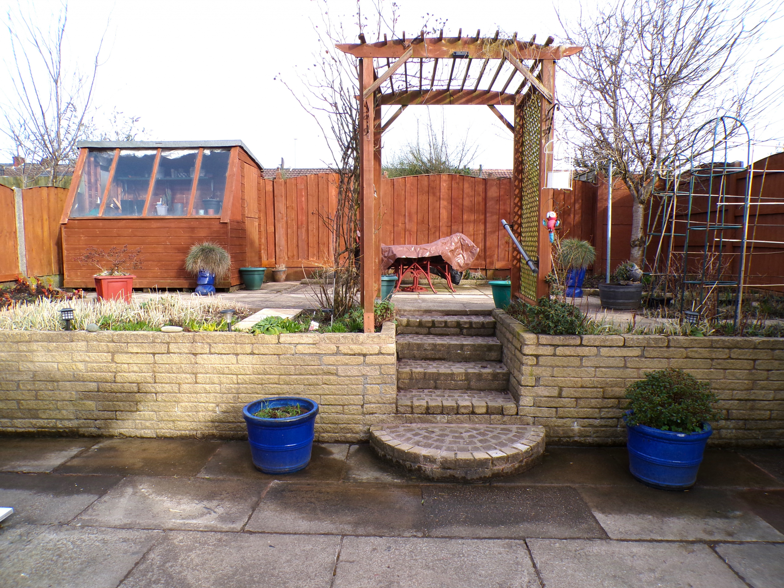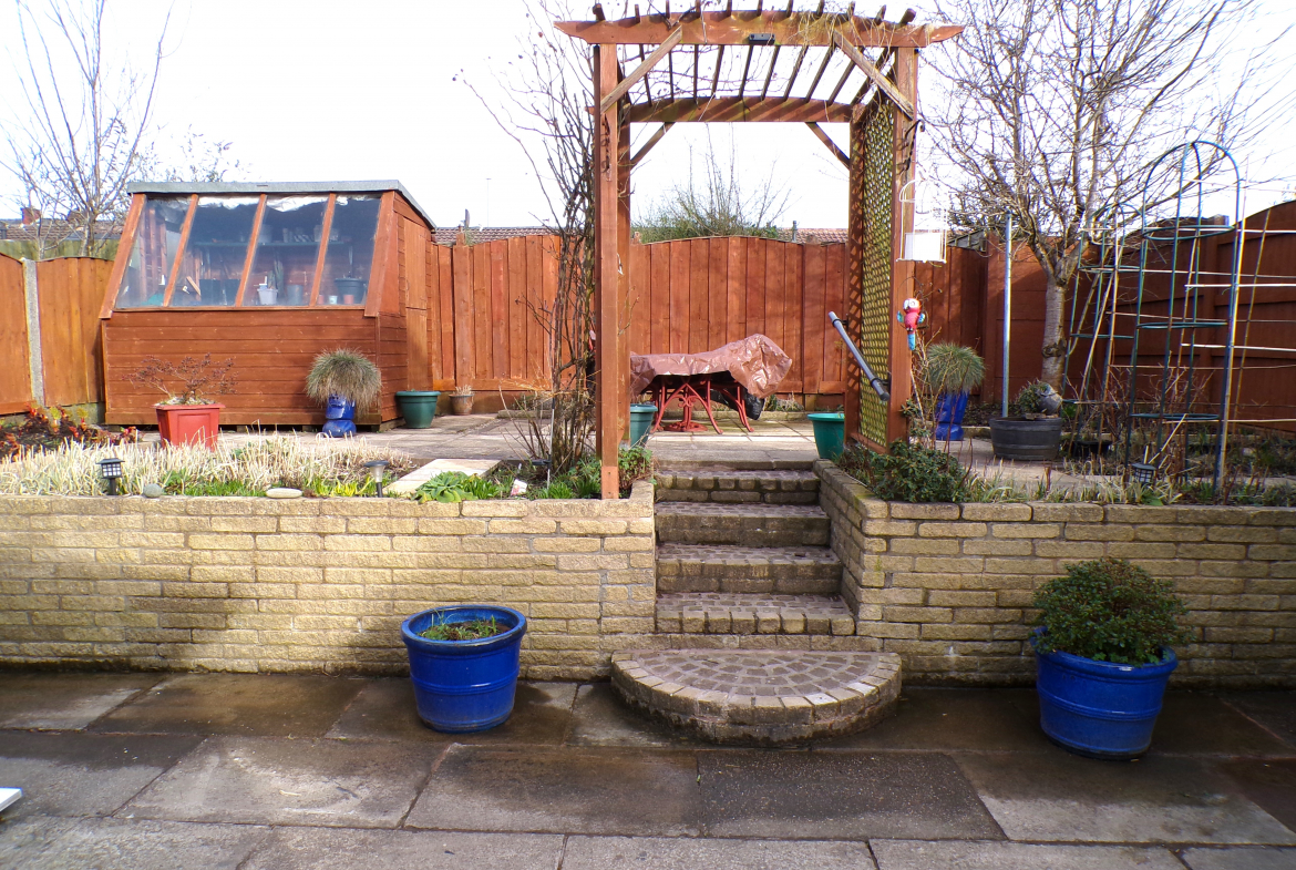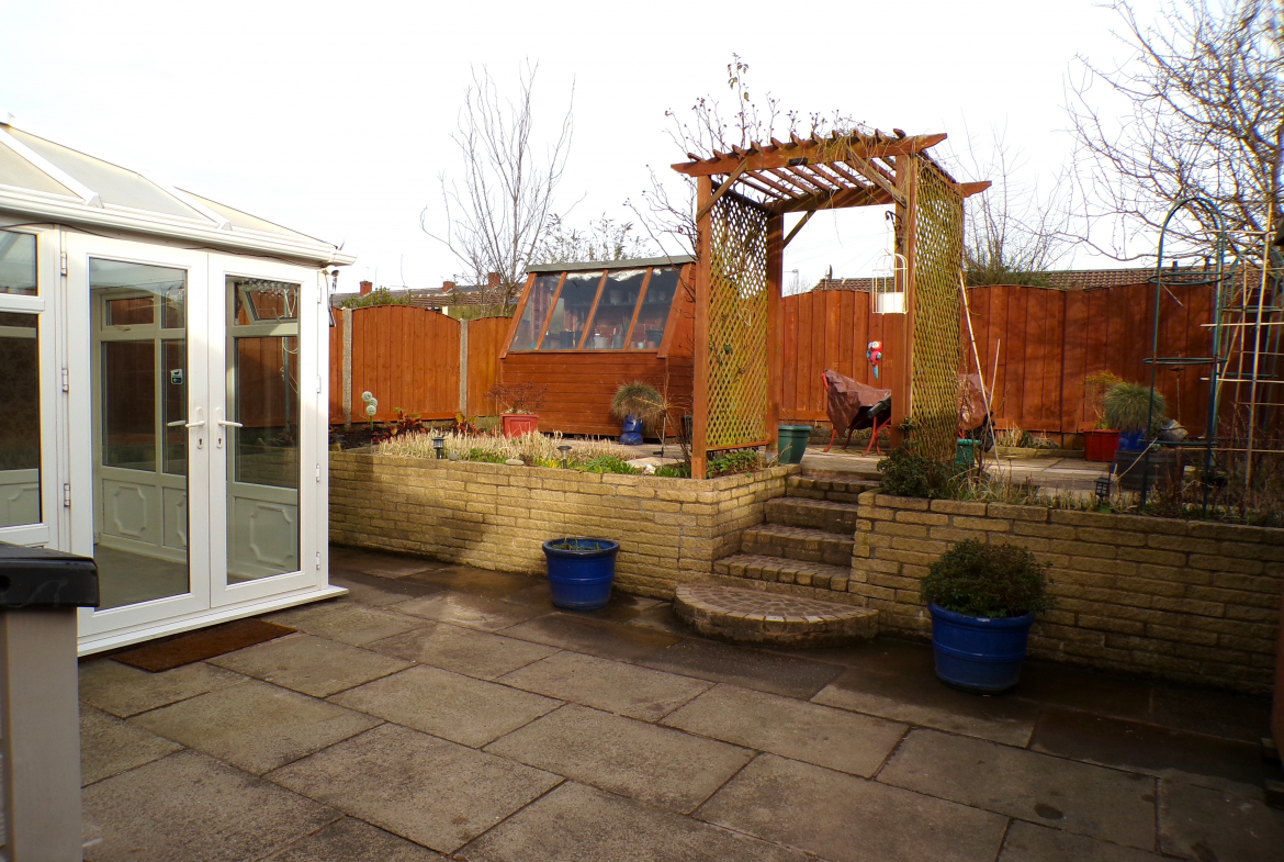 External – Garden to the front, a patterned concrete driveway and carport to the side and a garden to the rear with flagged patio, 2nd elevated flagged patio & 2 timber sheds.