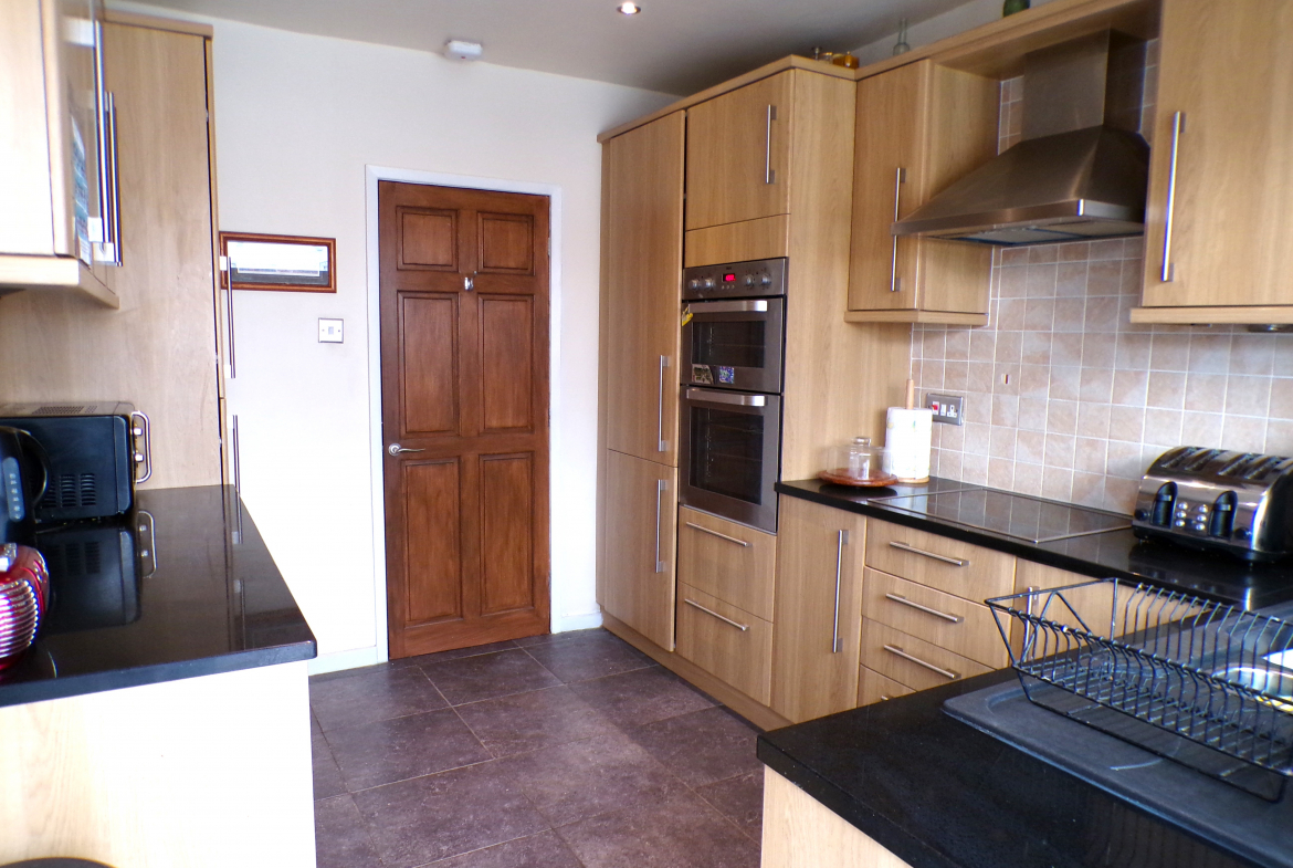 Kitchen – 3.33m x 2.72m (10’11 x 8’11) – Modern fitted wall & base units incorporating oven, hob & extractor. Single sink, rinser & drainer. Integrated fridge, freezer & washer. Part ceramic wall tiled. Ceramic floor tiled. Radiator.