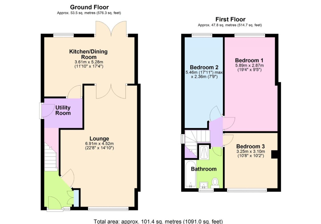 Lounge – (6.91mx4.52m) – Fitted electric fire. 2 radiators. Double doors to dining kitchen.