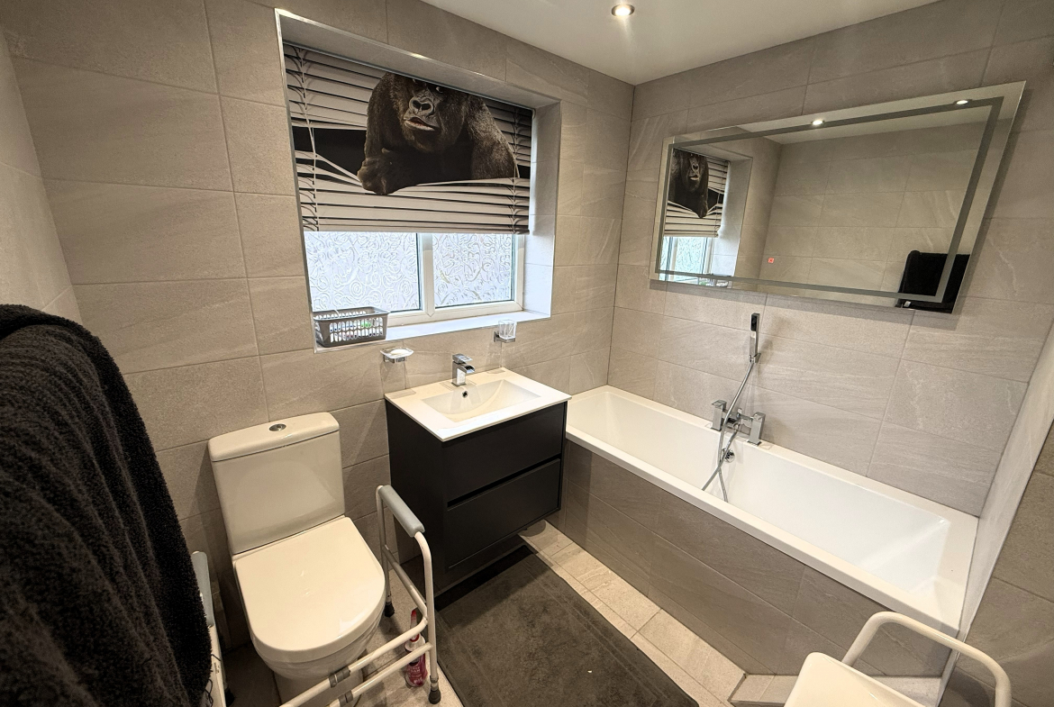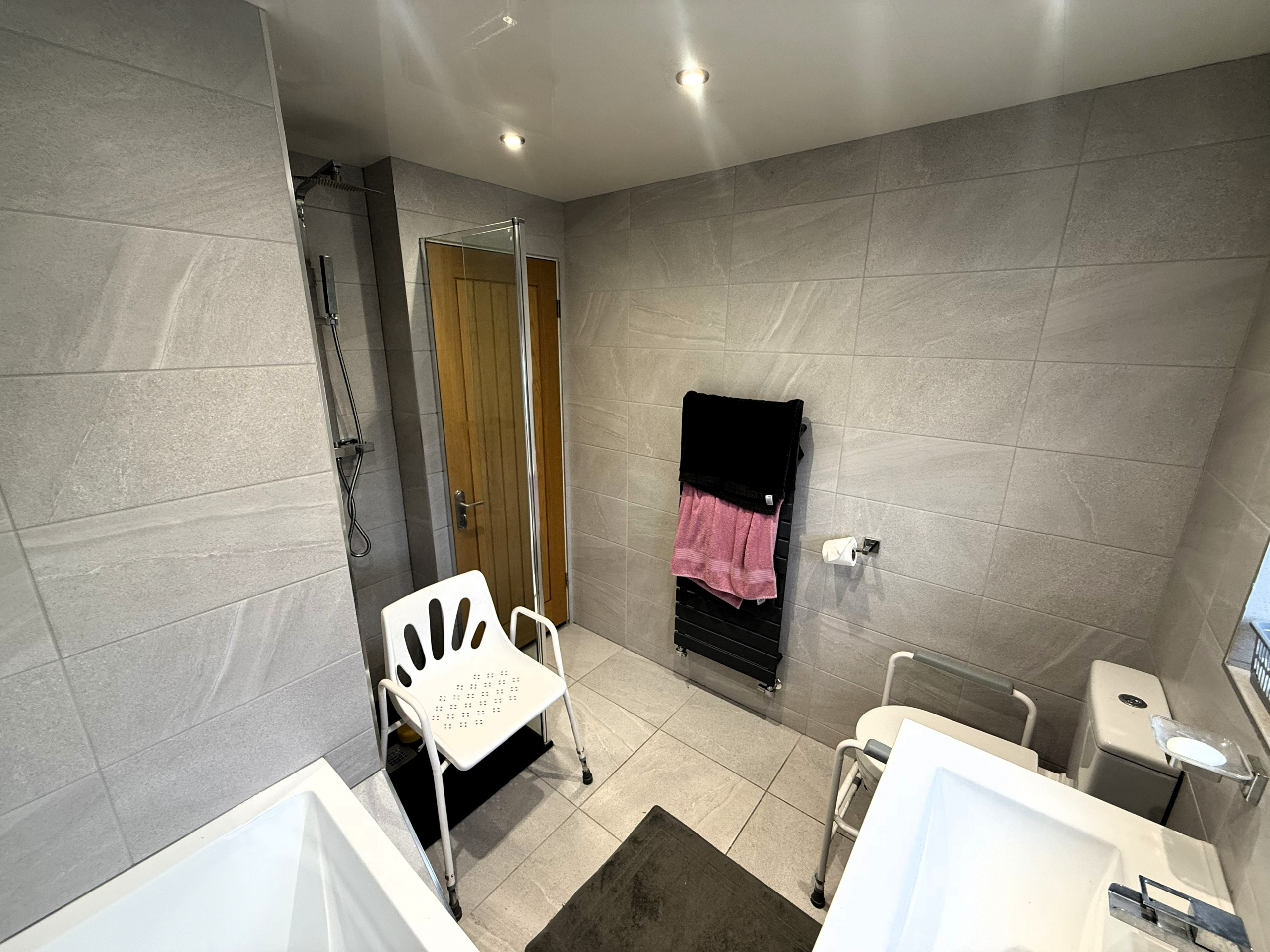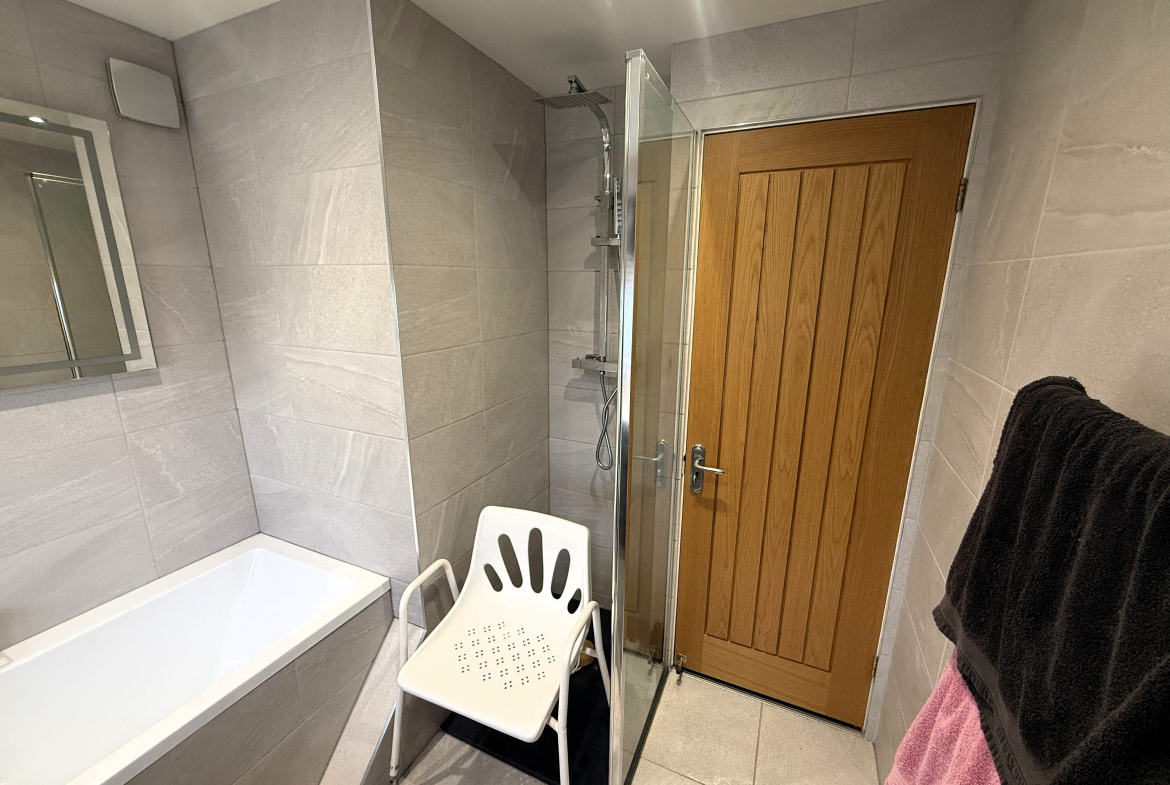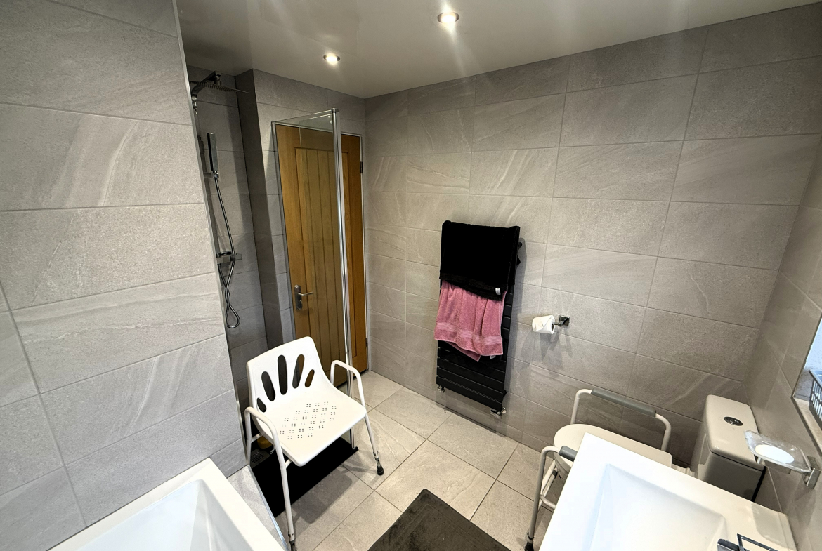 Bathroom – Modern 4 piece white suite including walk in shower cubicle. Ceramic wall and floor tiled. Heated towel rail.
