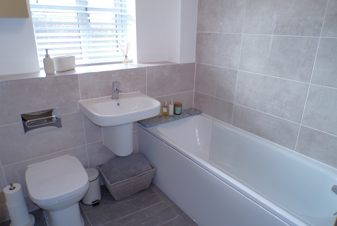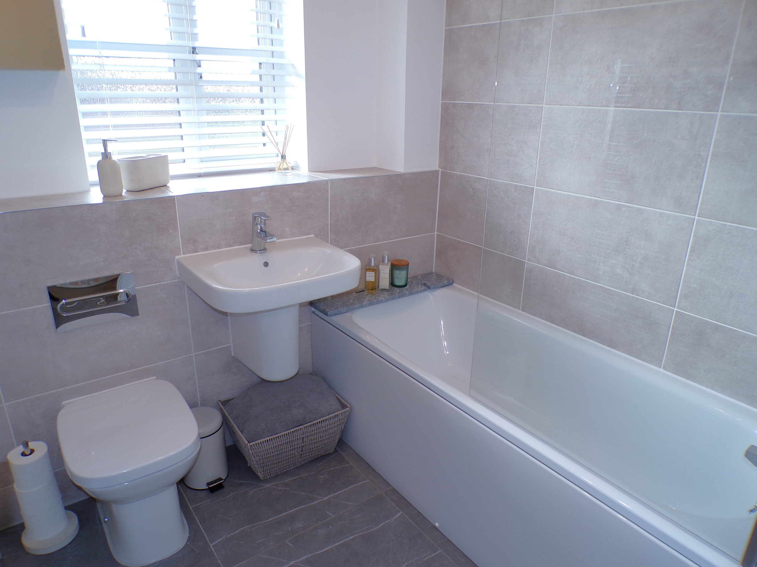 Bathroom – Modern 3 piece white suite with shower to bath. Part ceramic wall tiled. Ceramic floor tiled. Heated towel rail.