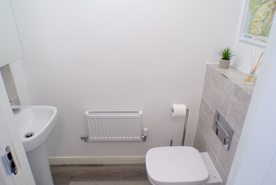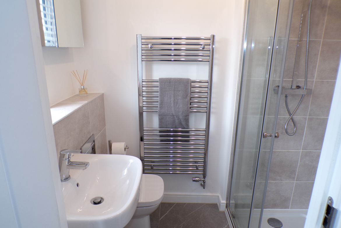 En Suite – Modern 3 piece white shower suite. Part ceramic wall tiled. Heated towel rail.