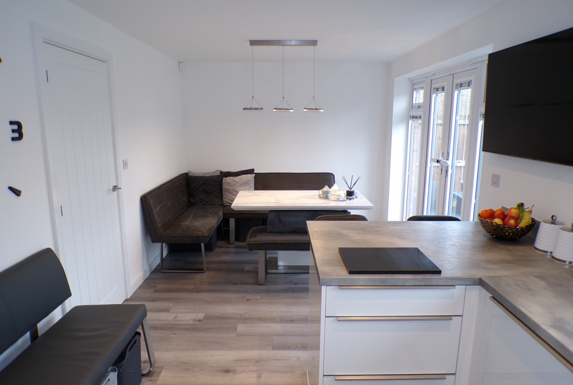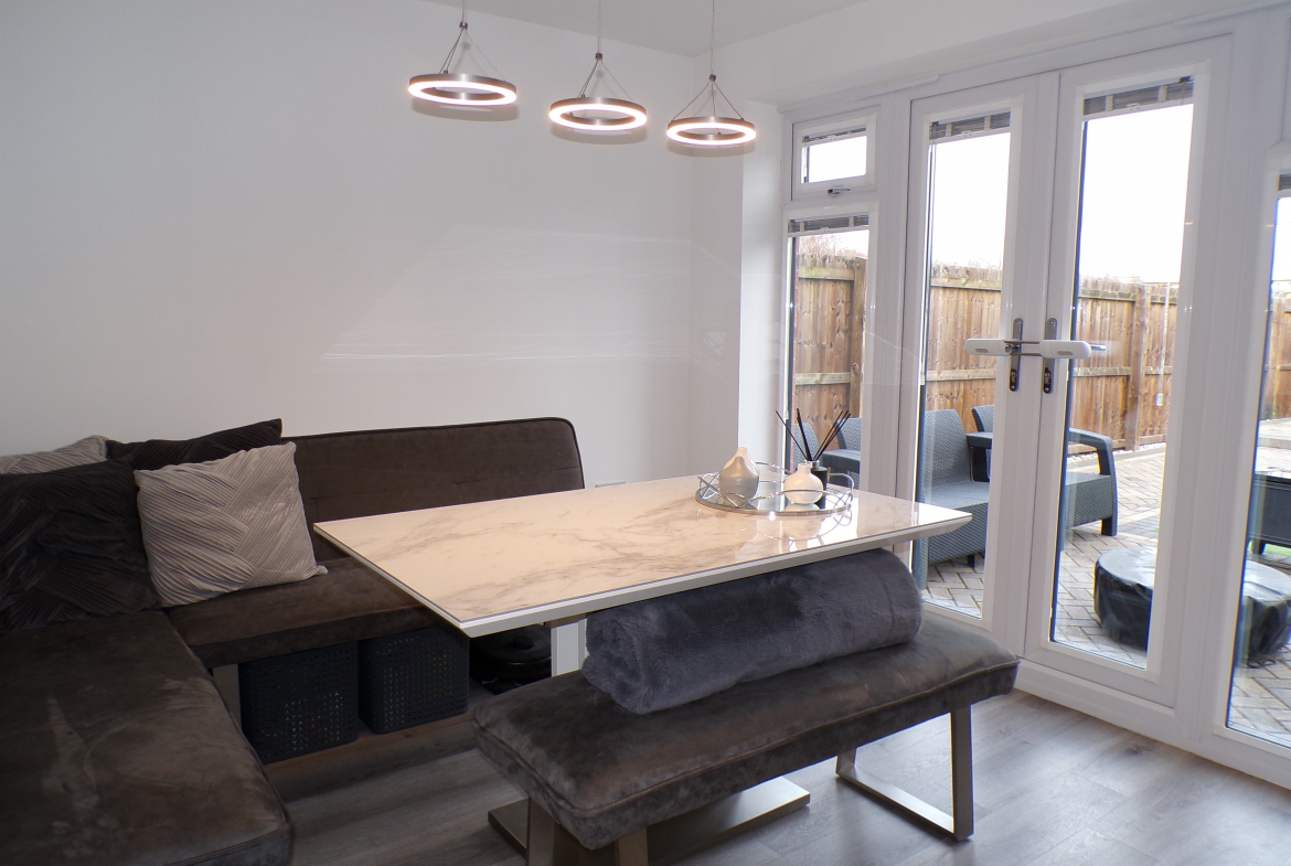 Dining Kitchen – 3.02m x 6.38m (9’11 x 20’11) – Modern fitted wall & base units incorporating oven, hob & extractor. Integrated fridge, freezer & dishwasher. Stainless steel sink, rinser & drainer. French doors to rear. Radiator.