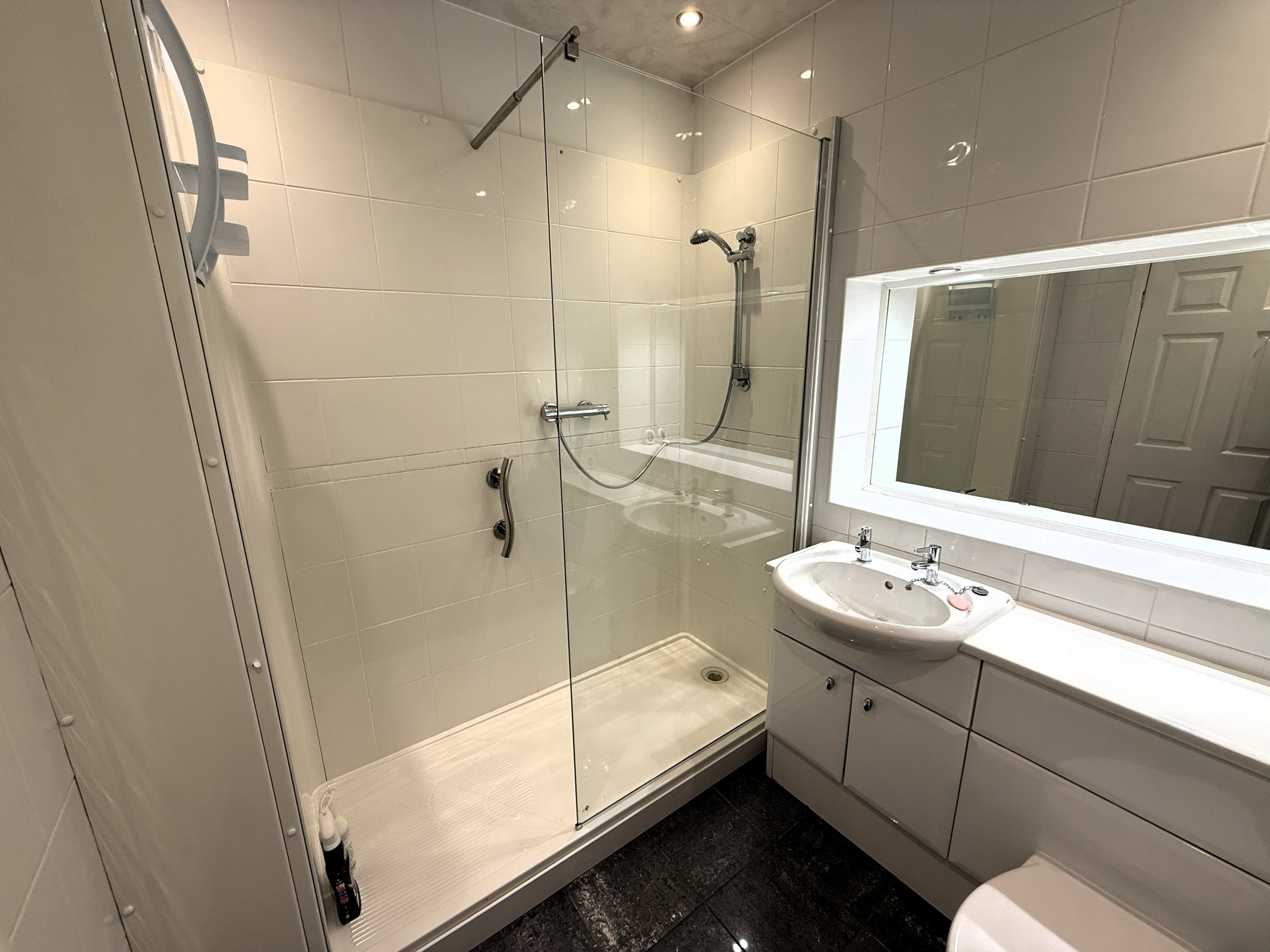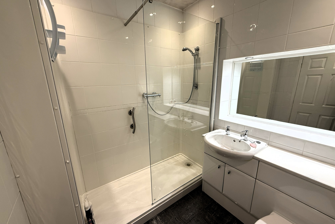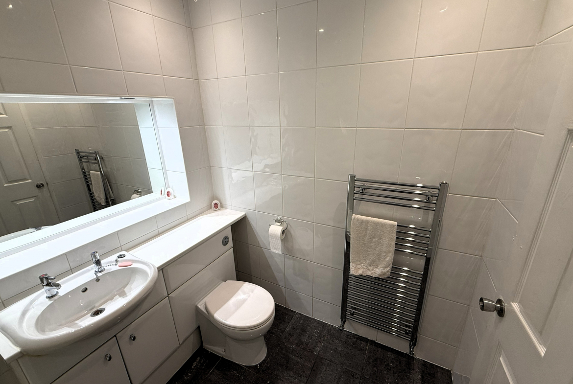 Shower Room – 3 piece white shower suite. Ceramic wall and floor tiled. Heated towel rail.