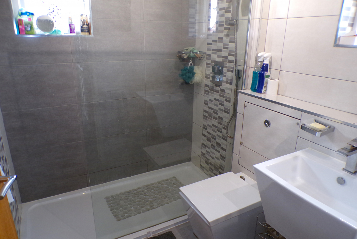 Shower Room – Modern 3 piece white shower suite. Ceramic wall & floor tiled. Heated towel rail.