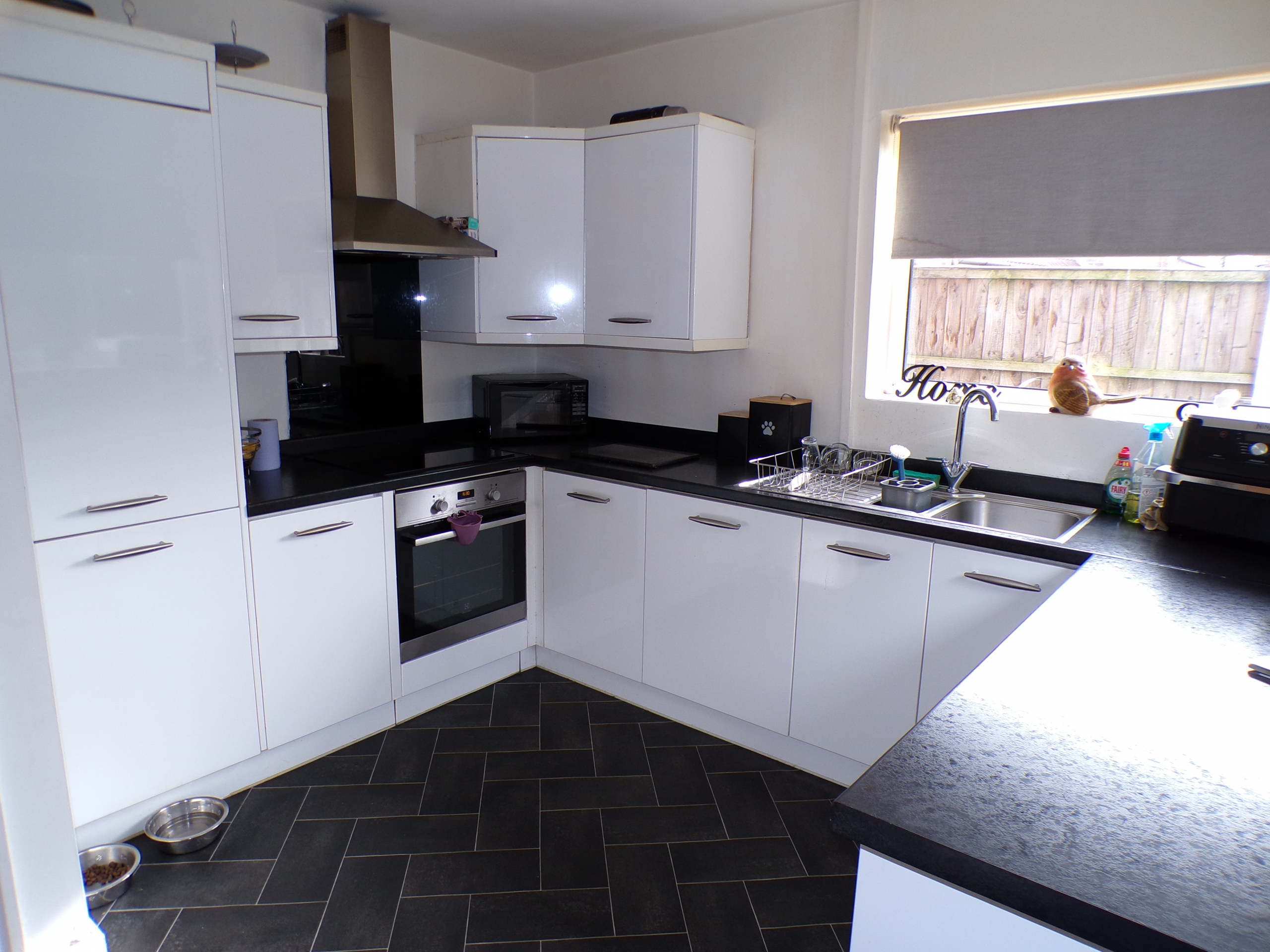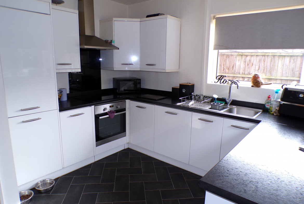 Kitchen – 3.12m x 3.45m (10’3 x 11’4) – Modern fitted wall & base units incorporating oven, hob & extractor. Stainless steel sink, rinser & drainer. Integrated fridge & freezer. Plumbed for washer.