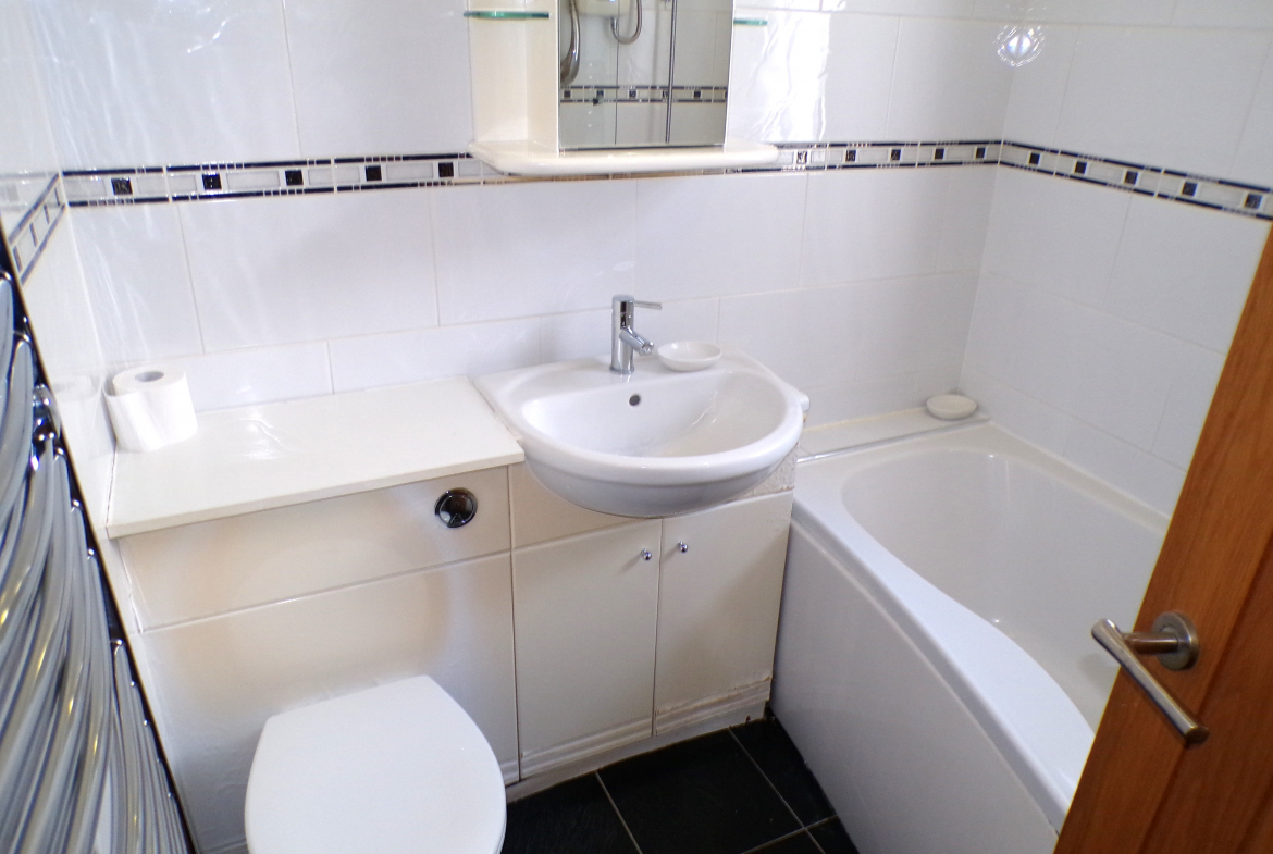 Bathroom – Modern 3 piece white suite with electric shower to bath. Ceramic wall & floor tiled. Heated towel rail.