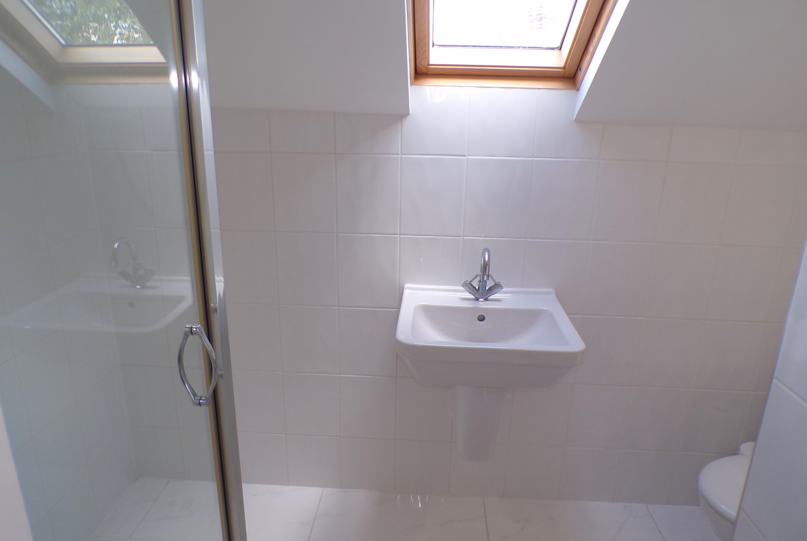 En Suite – Modern 3 piece white shower suite. Ceramic wall & floor tiled.