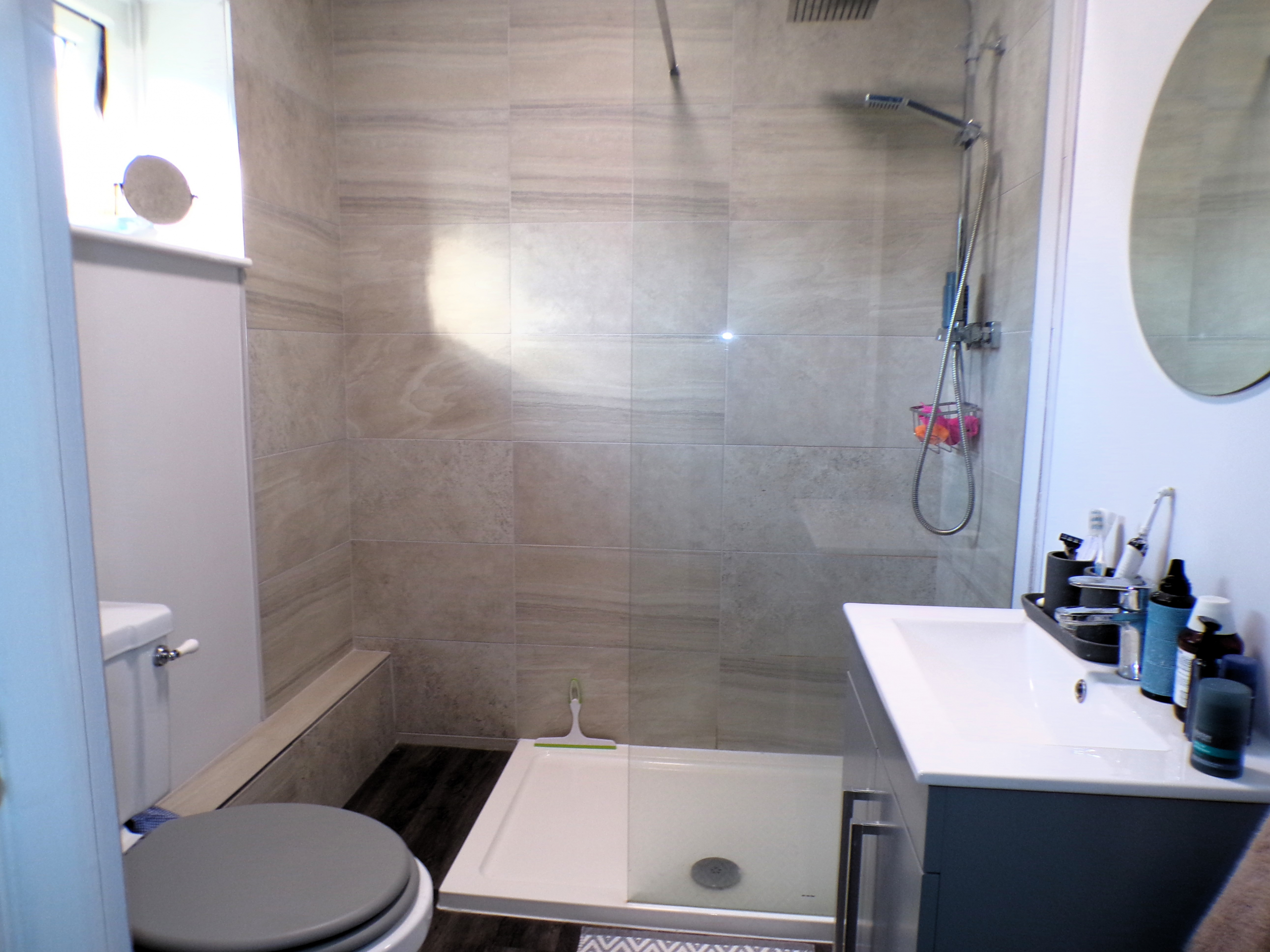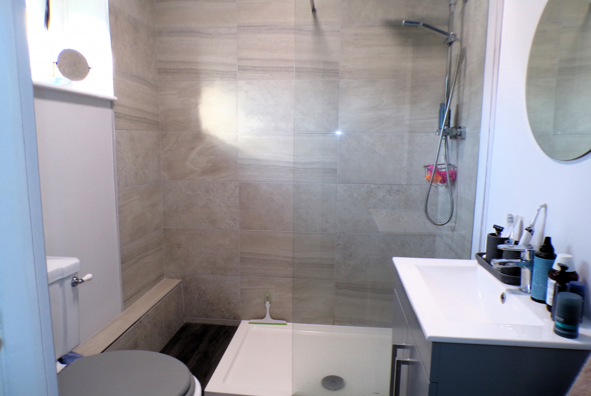 Shower Room – Modern 3 piece white shower suite. Part ceramic wall tiled. Heated towel rail. Storage cupboard.