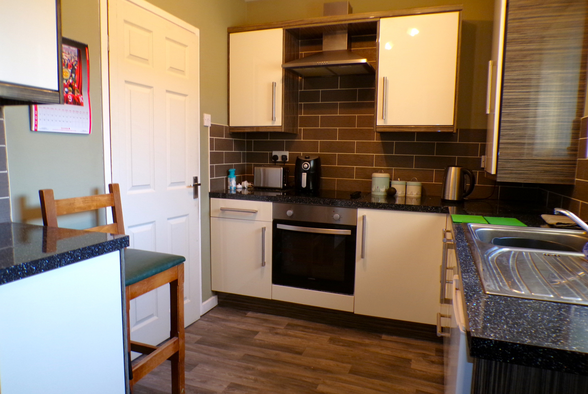 Kitchen – 2.24m x 3.07m (7’4 x 10’1) – Modern fitted wall & base units. Sink units incorporating oven, hob & extractor. Stainless steel sink & drainer. Part ceramic wall tiled. Modern vertical radiator. Cloaks cupboard. Combi gas central heating boiler.