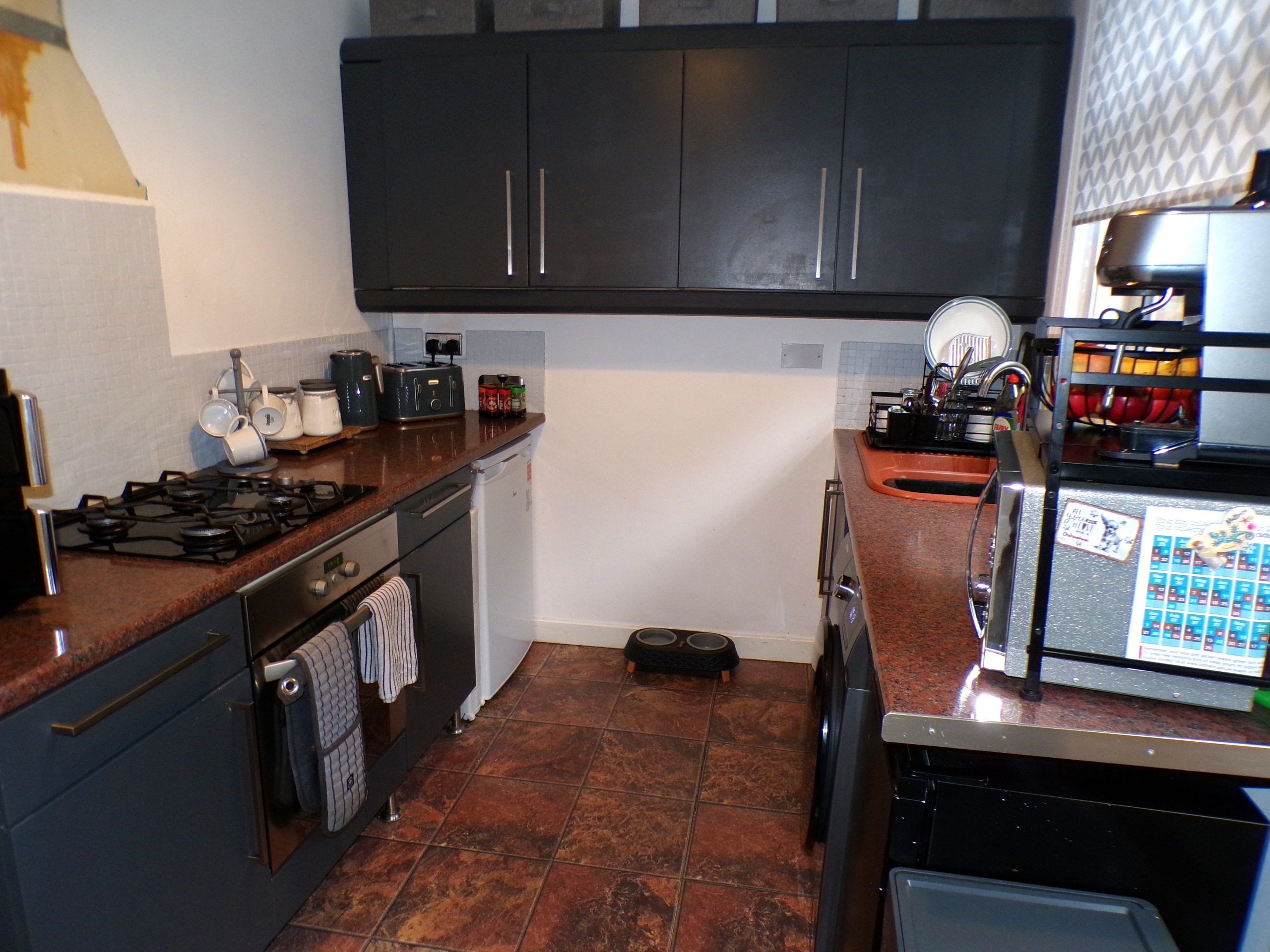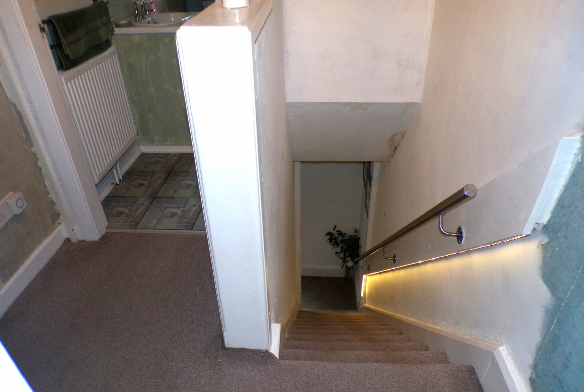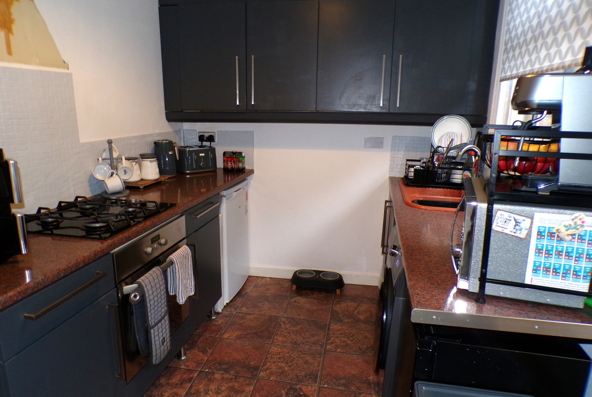 Kitchen – 2.34m x 3.23m (7’8 x 10’7) – Fitted wall & base units incorporating oven, hob & extractor. Part ceramic wall tiled. Plumbed for washer. Radiator. Enclosed stairs off.