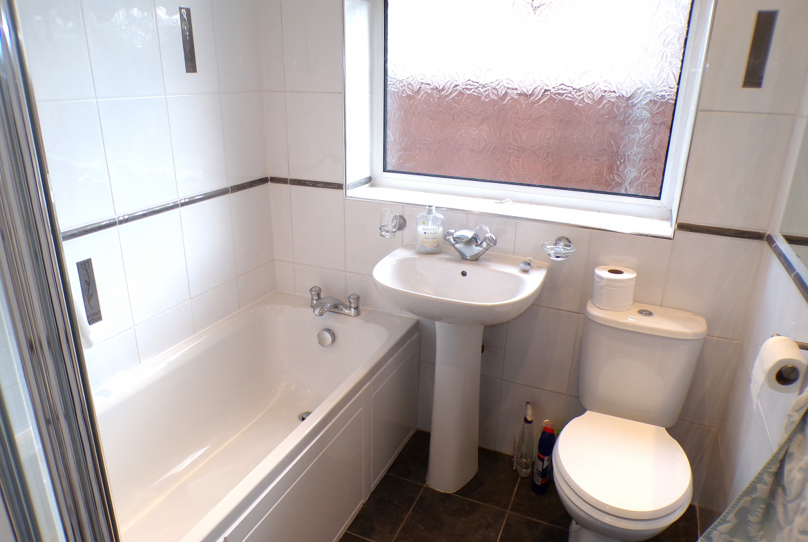 Bathroom – Modern 3 piece white suite with electric shower to bath. Ceramic wall & floor tiled. Heated towel rail.