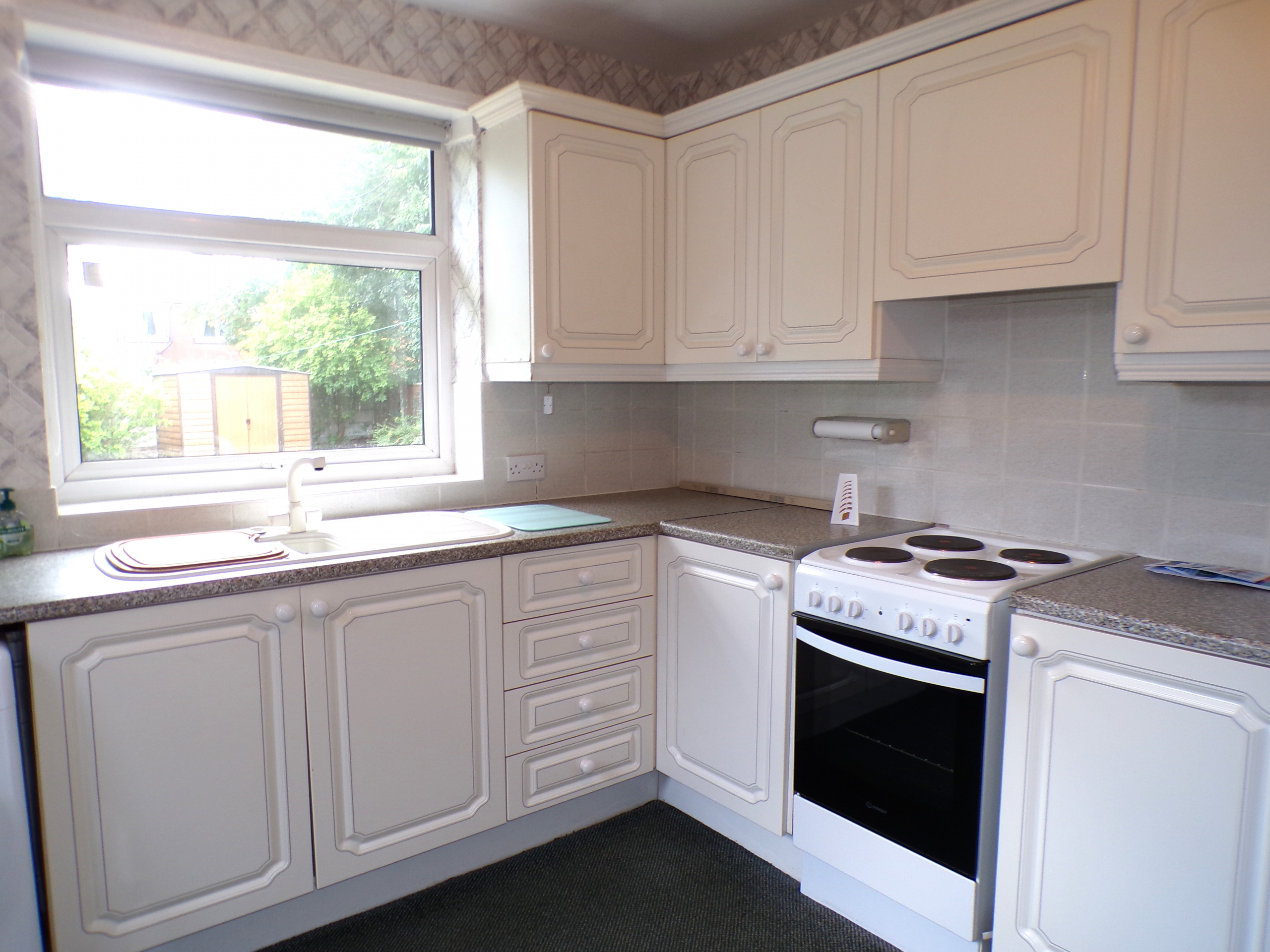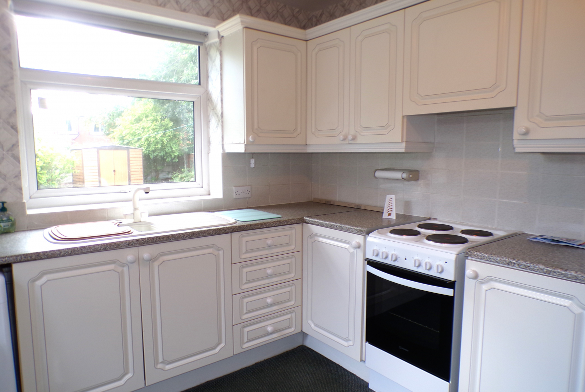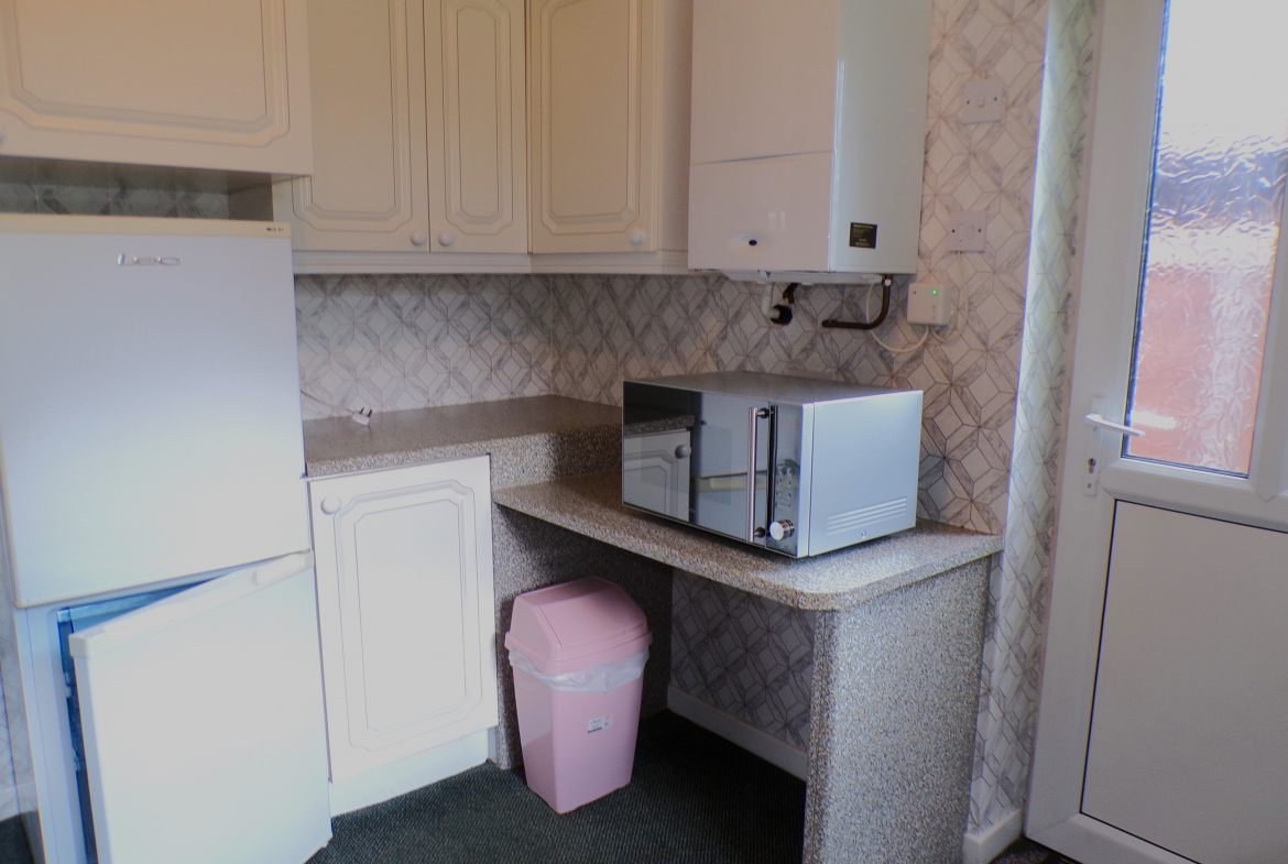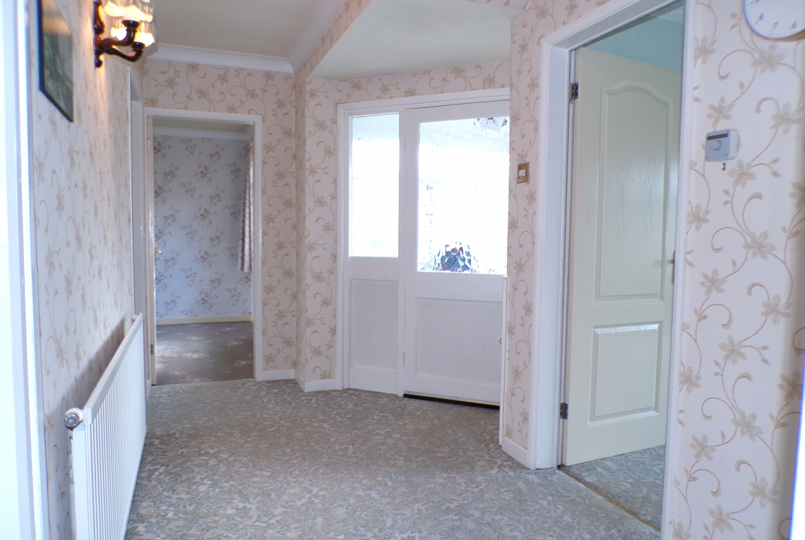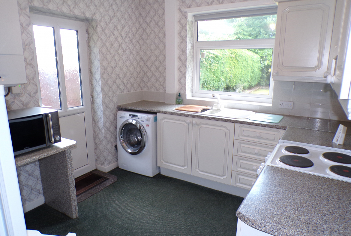 Kitchen – 3.28m x 2.77m (10’9 x 9’1) – Fitted wall & base units. Single sink, rinser & drainer. Part ceramic wall tiled. Plumbed for washer. Combi gas central heating boiler. Radiator.