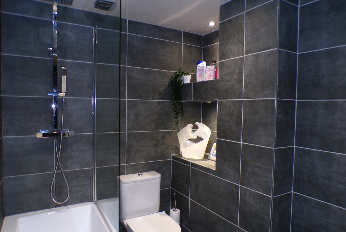 Bathroom – Modern 3 piece white suite with shower to bath. Ceramic wall & floor tiled. Heated towel rail.