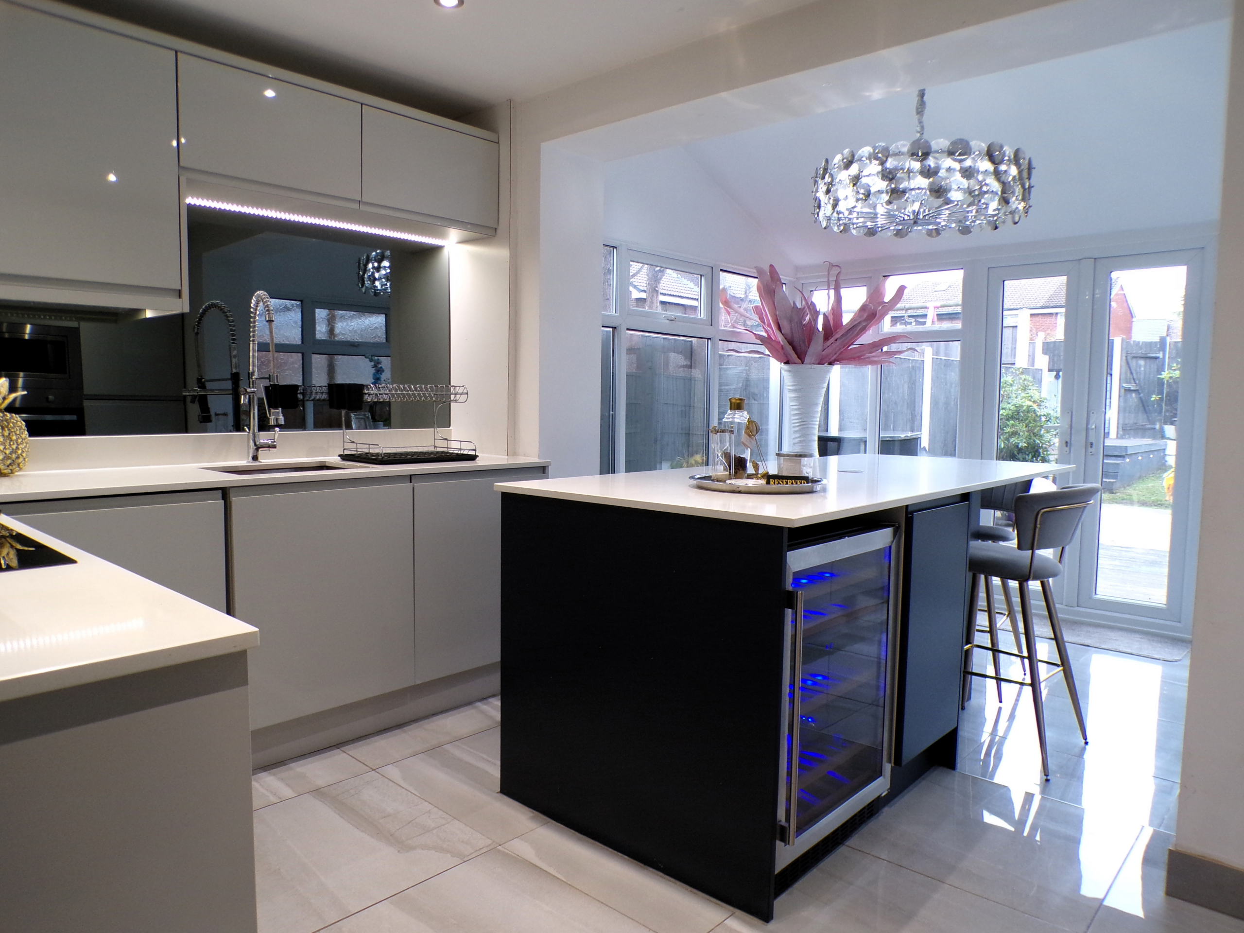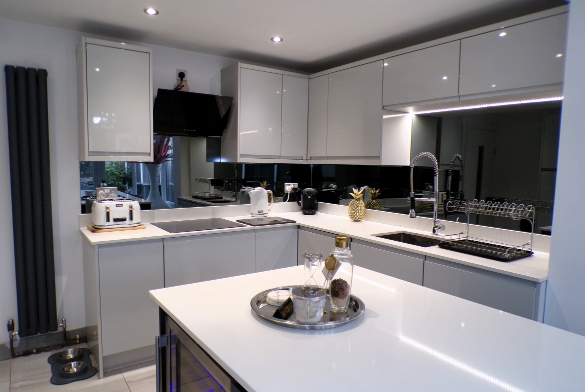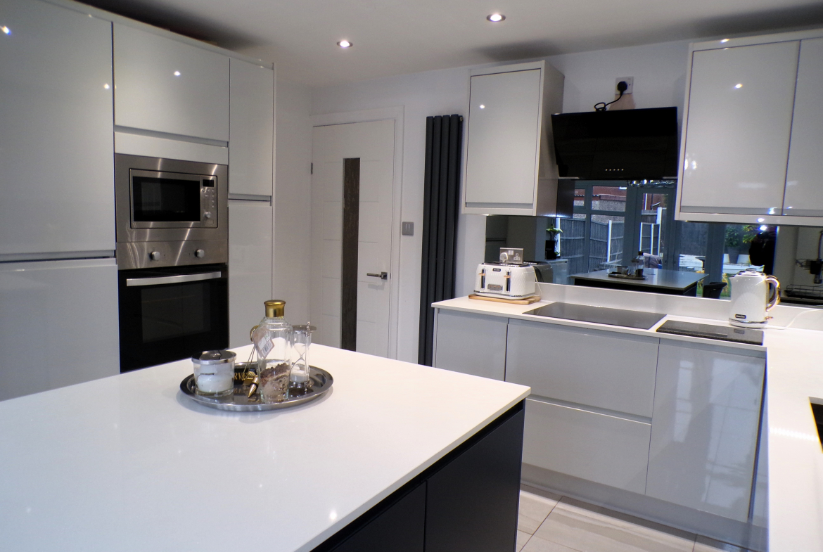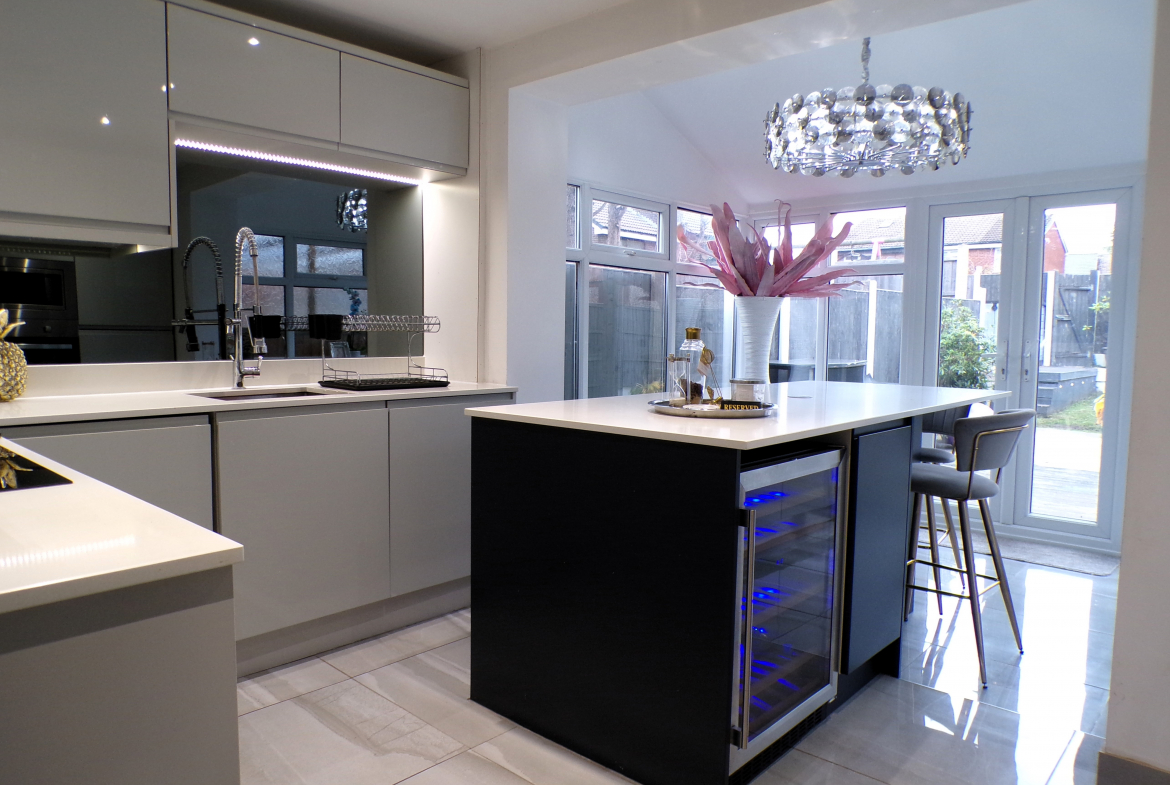 Kitchen – 2.44m x 3.61m (8’0 x 11’10) – Luxury modern fitted wall & base units with quartz worktops. Integrated oven, hob & extractor, fridge, freezer, microwave, washer, dryer & wine cooler. Large central island. Ceramic floor tiled. Single sink unit. Opening to conservatory.