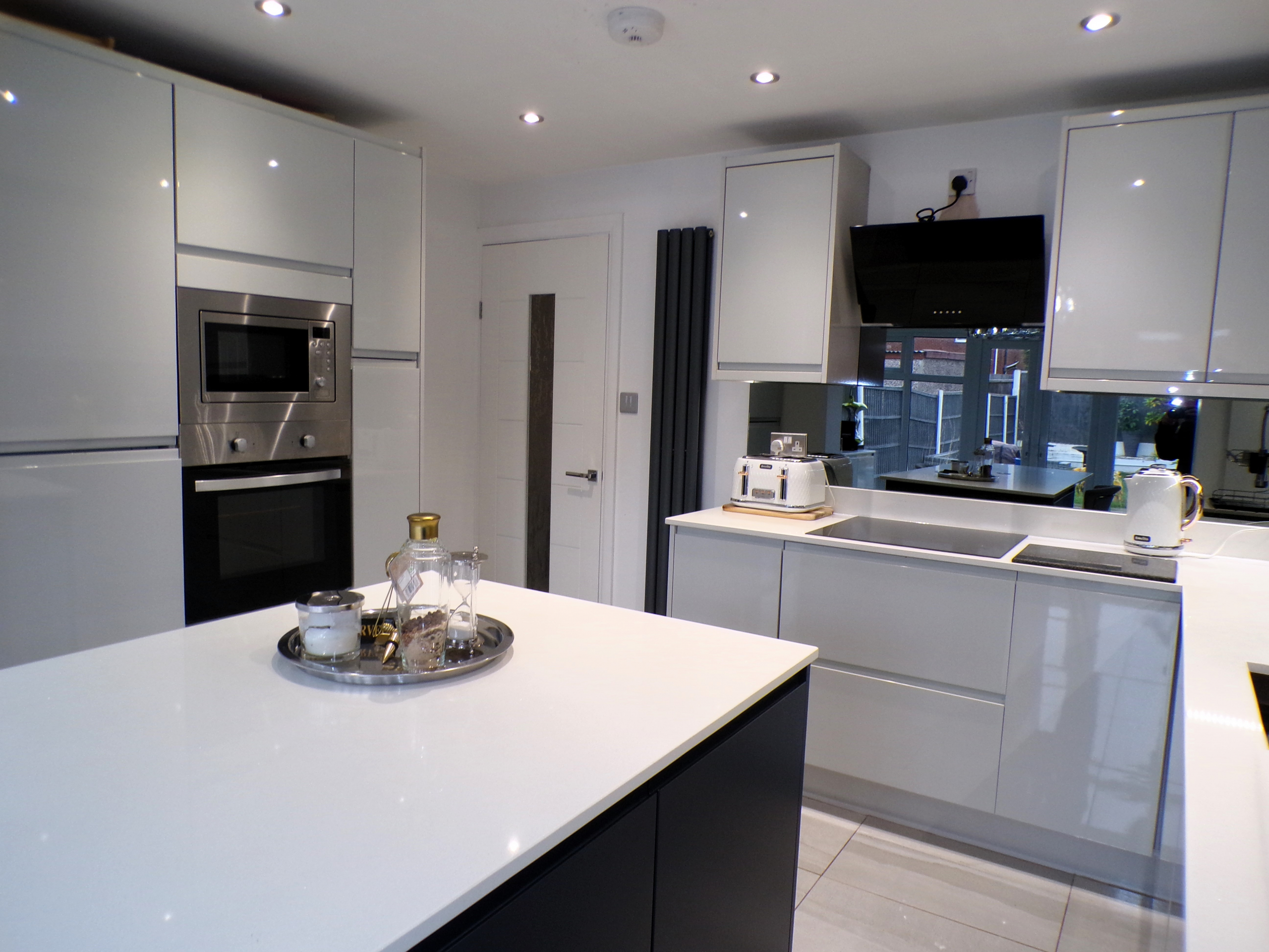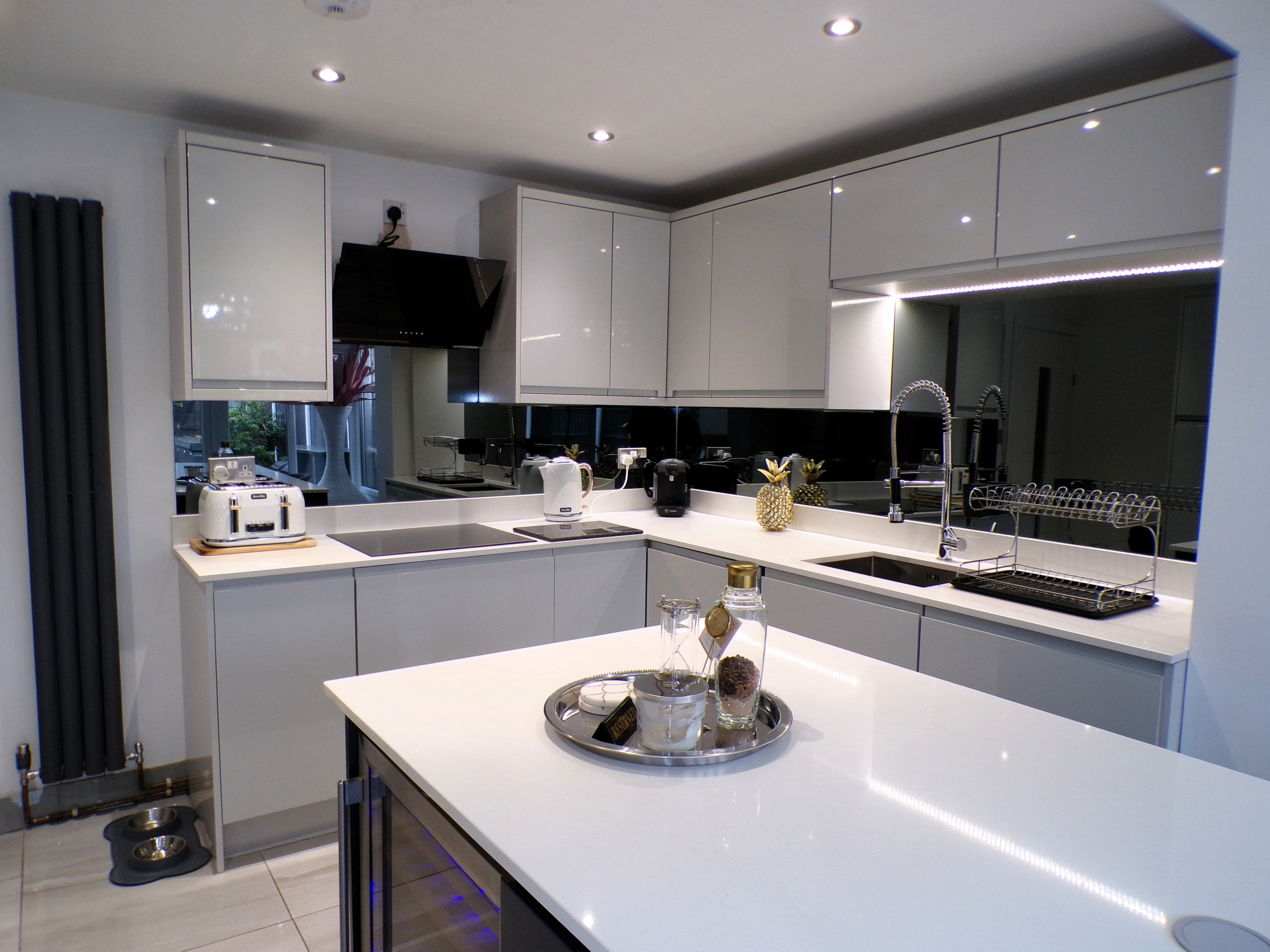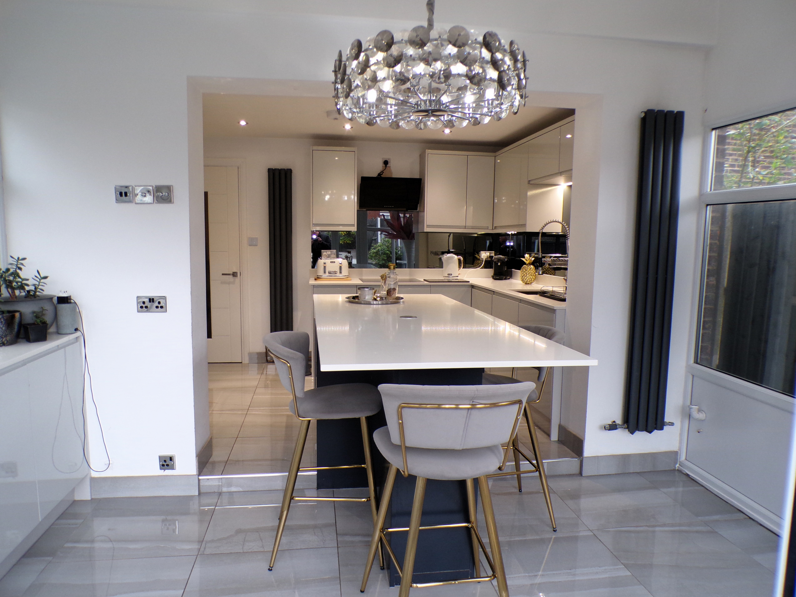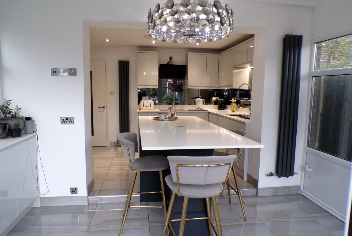 Kitchen – 2.44m x 3.61m (8’0 x 11’10) – Luxury modern fitted wall & base units with quartz worktops. Integrated oven, hob & extractor, fridge, freezer, microwave, washer, dryer & wine cooler. Large central island. Ceramic floor tiled. Single sink unit. Opening to conservatory.
